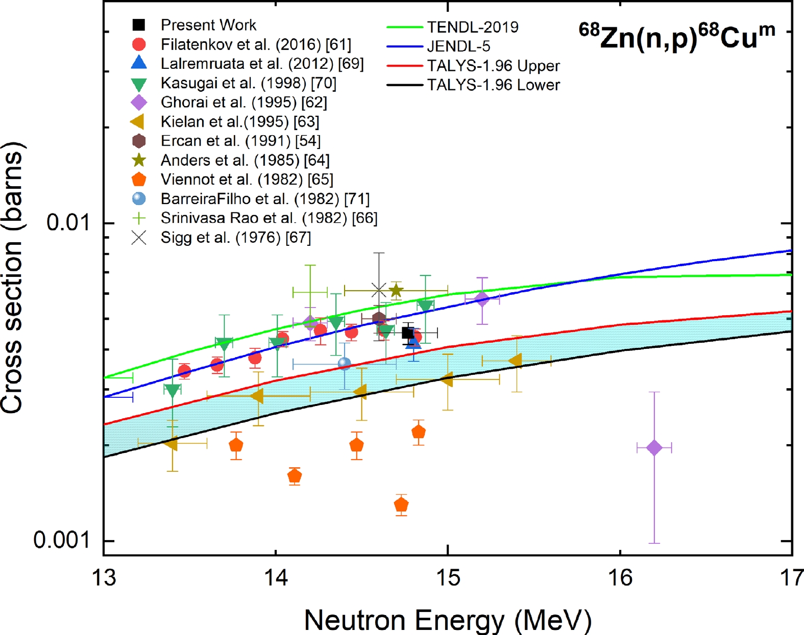 Figure 6. (color online) Measured experimental cross section for the 68Zn(n, p)68Cum reaction compared with EXFOR data, TALYS-1.96 calculations, and evaluated nuclear data.