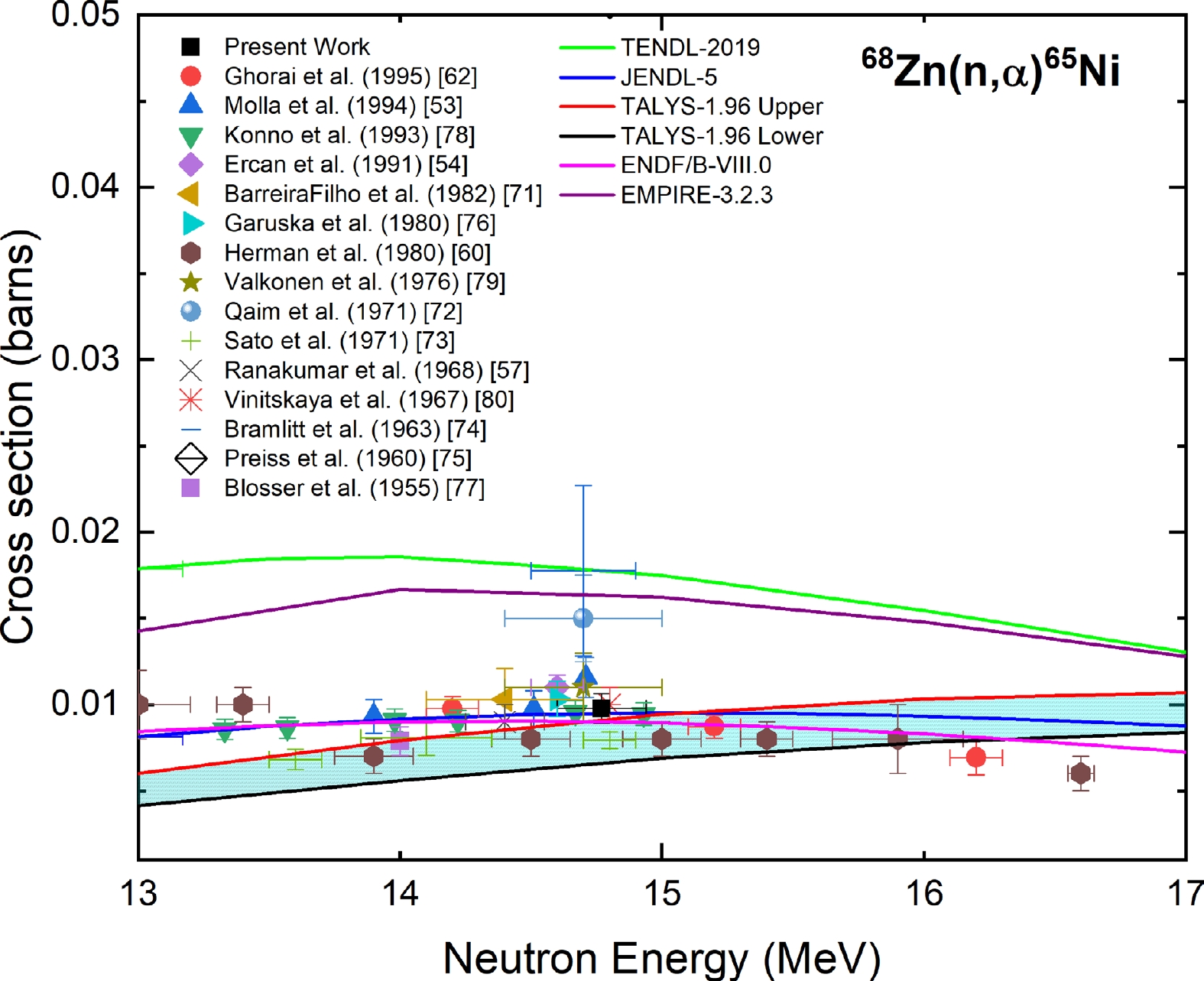 Figure 7. (color online) Measured experimental cross section for the 68Zn(n, α)65Ni reaction compared with EXFOR data, TALYS-1.96 calculations, and evaluated nuclear data.
