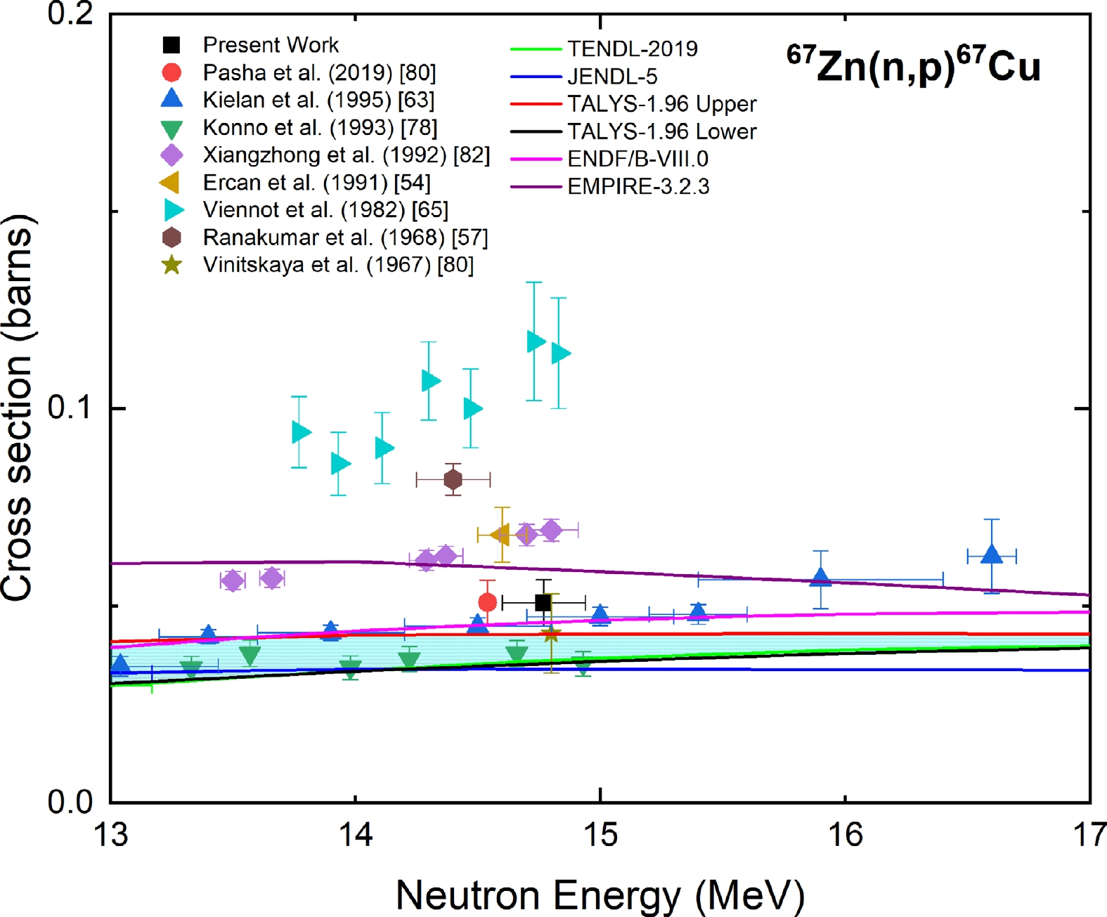Figure 8. (color online) Measured experimental cross section for the 67Zn(n, p)67Cu reaction compared with EXFOR data, TALYS-1.96 calculations, and evaluated nuclear data.