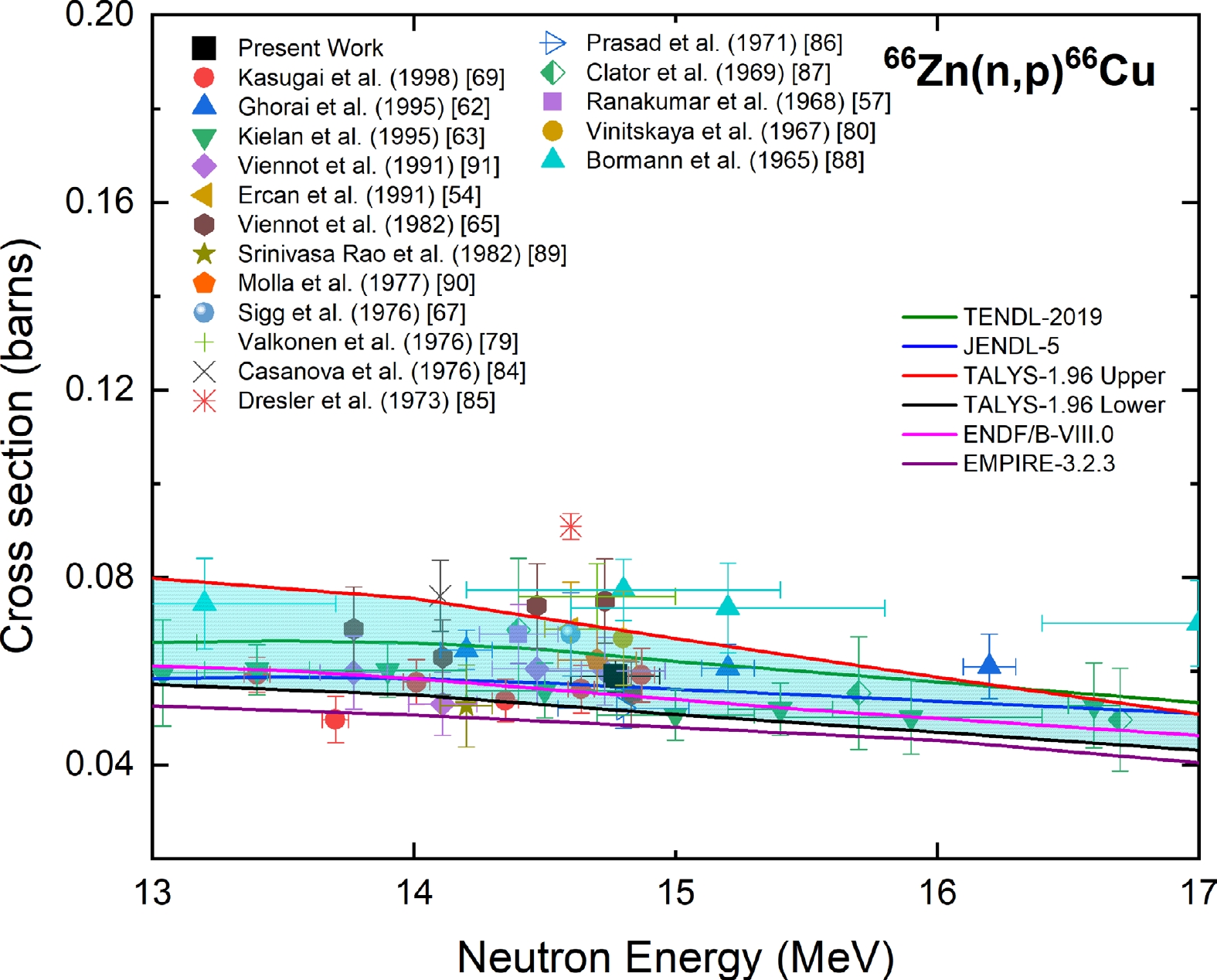 Figure 9. (color online) Measured experimental cross section for the 66Zn(n, p)66Cu reaction compared with EXFOR data, TALYS-1.96 calculations, and evaluated nuclear data.