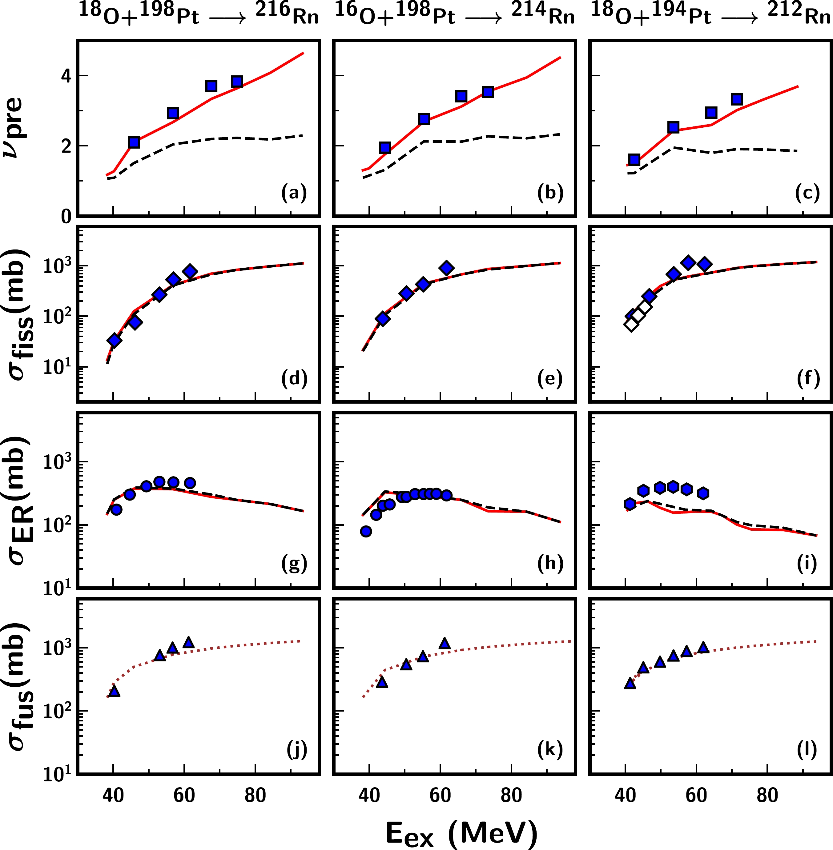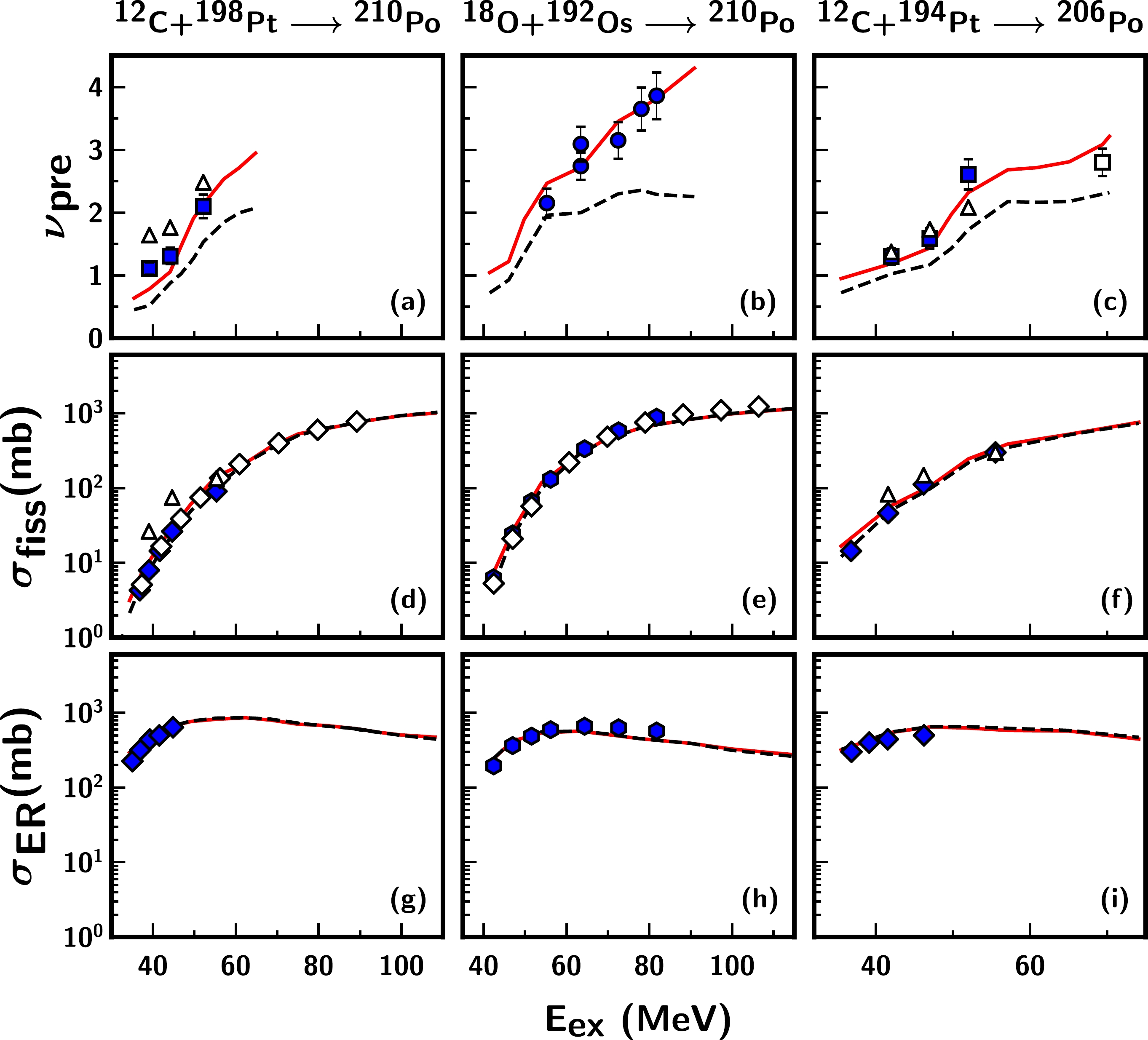 ${\nu_{\rm pre}}$ ), fission cross-sections (${\sigma_{\rm fiss}}$ ), and ER cross-sections (${\sigma_{\rm ER}}$ ) as functions of the excitation energy for the following reactions:$ ^{12} $ C$ +^{198} $ Pt,$ ^{18} $ O$ +^{192} $ Os, and$ ^{12} $ C$ +^{194} $ Pt. The continuous line (red) denotes the obtained results with a universal frictional form factor, and the dashed line (black) represents the statistical model calculations. The symbols in the legend represent different experimental datasets. For${\nu_{\rm pre}}$ , (filled squares) Ref. [19], (filled circles) Ref. [5], and (open square) Ref. [59]; for${\sigma_{\rm fission}}$ and${\sigma_{\rm ER}}$ , (filled diamonds) Ref. [18], (filled hexagons) Ref. [60], and (open diamonds) Ref. [61]. The open triangles represent results of${\nu_{\rm pre}}$ and${\sigma_{\rm fission}}$ from the 4D Langevin calculations reported in Ref. [63].Figures 2 and 3 display a comparison between the experimental data and theoretical calculation results of
