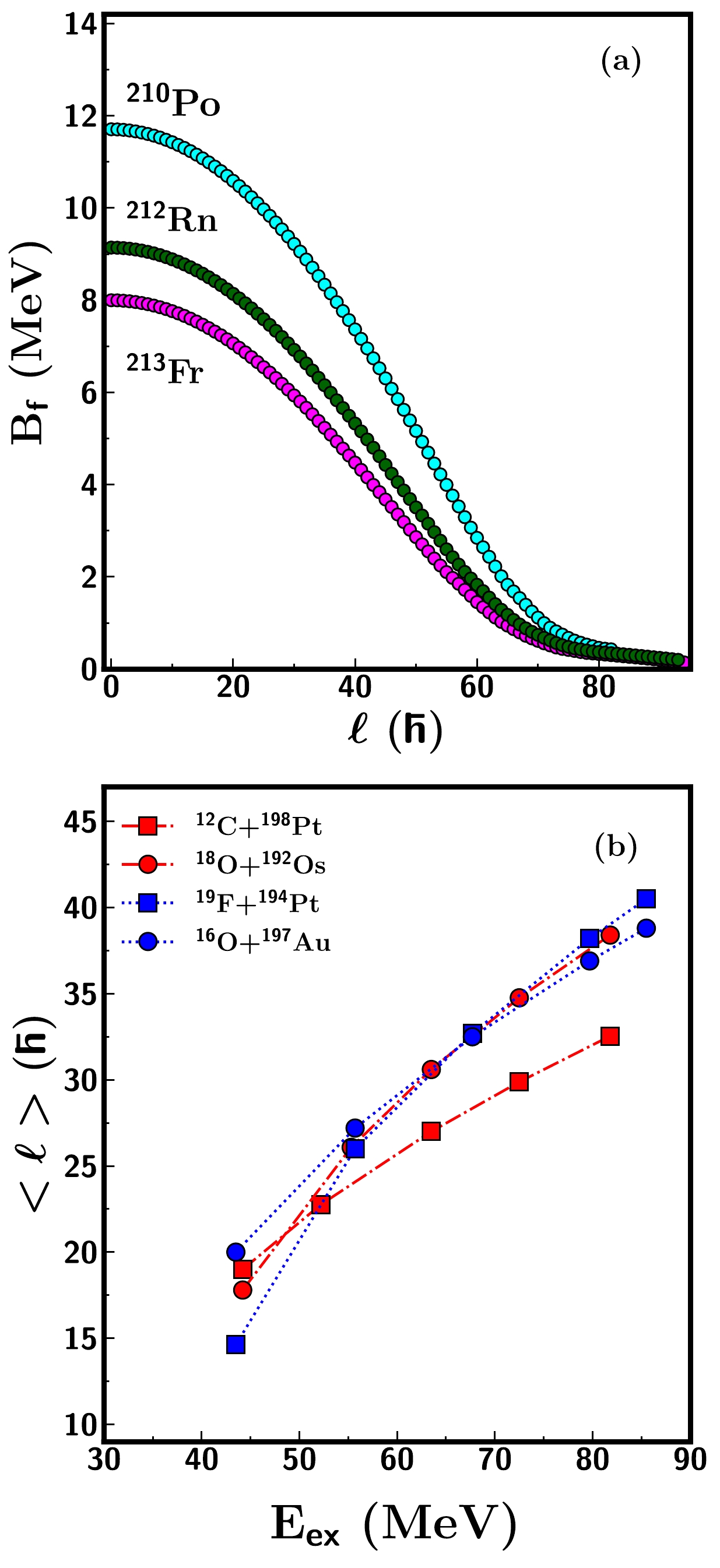 $ l $ " dependent fission barrier height$ B_f(l) $ of the following three CN:$ ^{210} $ Po,$ ^{212} $ Rn, and$ ^{213} $ Fr. (b) Variation in the mean angular momentum$ <l> $ with the CN excitation energy for$ ^{210} $ Po and$ ^{213} $ Fr generated by different entrance channels.The current 1D Langevin analysis provides a simultaneous description of the experimental data for the neutron magic nuclei