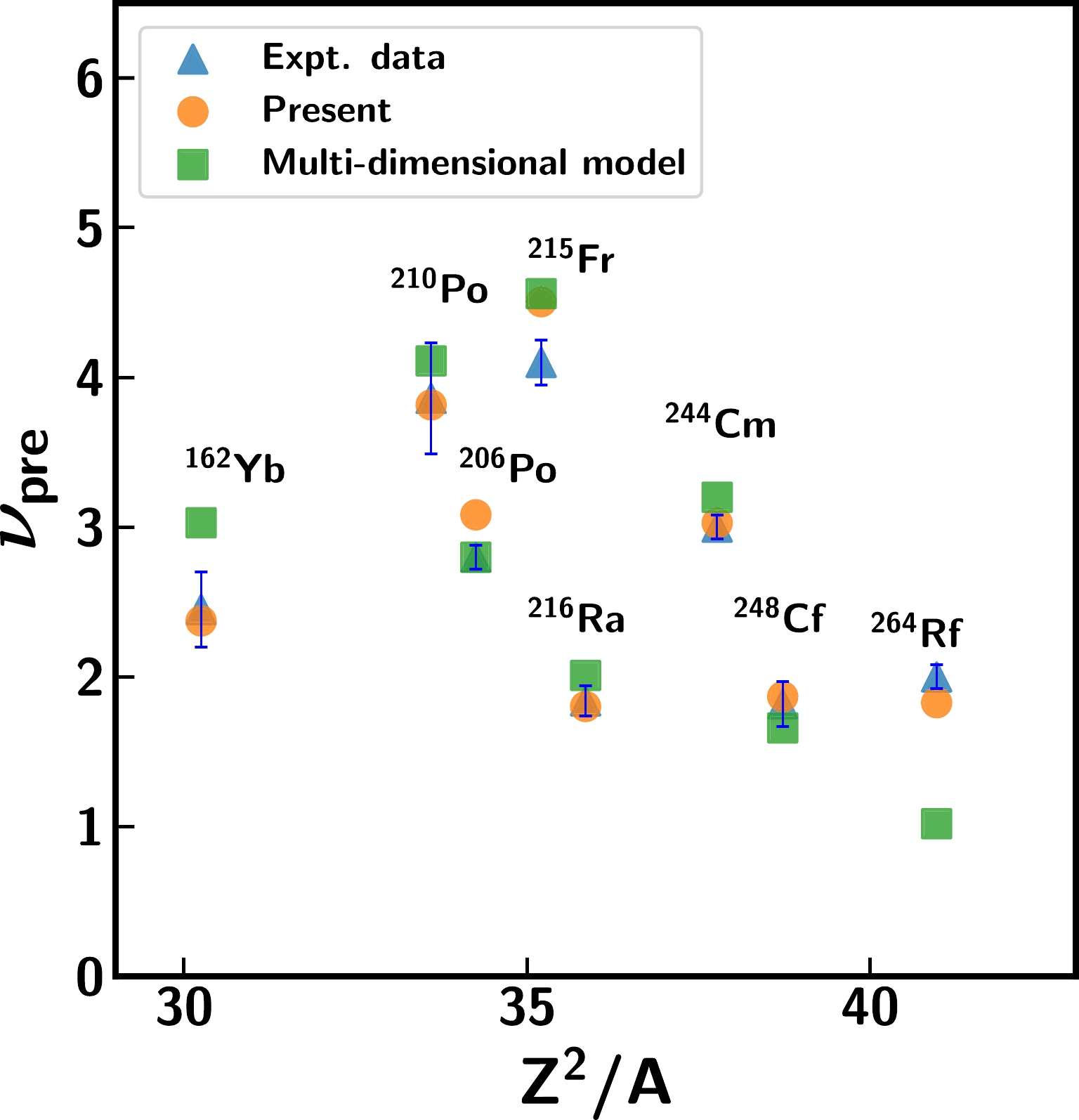 $\nu_{\rm pre}$ calculated based on the 1D model and recent macroscopic multi-dimensional models is displayed in Fig. 6. It can be observed that the$\nu_{\rm pre}$ values predicted by different models are very similar and also reproduce the measurements quite well for reactions spanning a wide range of the fissility parameter,$ Z^{2}/A $ . Additionally, multi-dimensional calculations [34, 50, 81] also use the formalisms adopted from Refs. [36, 69]; these include a parameterization of the surface friction model and the weakest coordinate dependence of the level-density parameter, as employed in the present study. Hence, the qualitative nature of the observed features presented here is not expected to be different with a multi-dimensional approach. As the present framework is found to provide realistic values that are close to the measured data, we believe that the 1D approach can still serve as a potential tool for studying the wider systematics and that this can be accomplished using minimum computational resources.