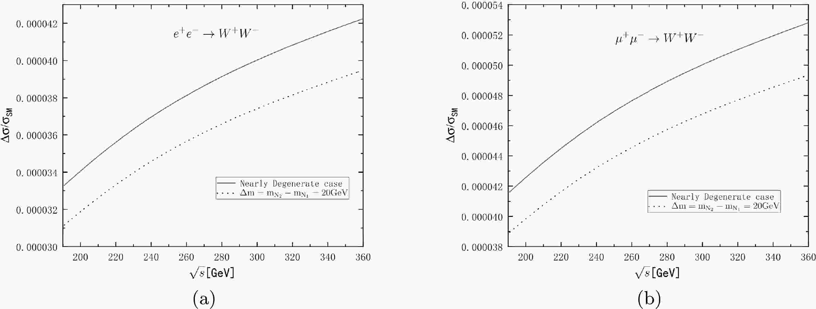 $\Delta\sigma=\sigma_{\rm total}-\sigma_{\rm SM}$ of (a)$ e^+e^-\rightarrow W^+W^- $ and (b)$ \mu^+\mu^-\rightarrow W^+W^- $ compared with the cross section of the SM part$\Delta\sigma/\sigma_{\rm SM}$ as a function of centre-of-mass energy$ \sqrt{s} $ . The black curves represent the case in which two heavy Majorana neutrinos are nearly degenerate, and the dotted curves correspond to the case in which$ \Delta m=m_{N_2}-m_{N_1}=20 $ GeV, where$ m_{N_1}=15 $ GeV.We calculate the total cross section of the process