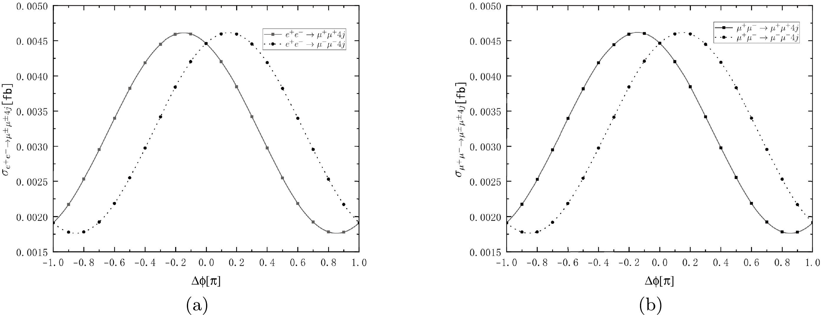 $ e^+e^-\rightarrow \mu^\pm\mu^\pm 4j $ and (b)$ \mu^+\mu^-\rightarrow \mu^\pm\mu^\pm 4j $ as functions of the CP phase$ \Delta\phi $ .$ \sqrt{s}=190 $ GeV and$ m_{N_1}= $ 15 GeV, where two heavy Majorana neutrinos are nearly degenerate.$ \begin{eqnarray} {\cal A}_{CP}=\frac{{\rm Br}(\ell^+\ell^-\rightarrow \mu^+\mu^+4j)-{\rm Br}(\ell^+\ell^-\rightarrow \mu^-\mu^-4j)}{{\rm Br}(\ell^+\ell^-\rightarrow \mu^+\mu^+4j)+{\rm Br}(\ell^+\ell^-\rightarrow \mu^-\mu^-4j)}\;, \end{eqnarray} $