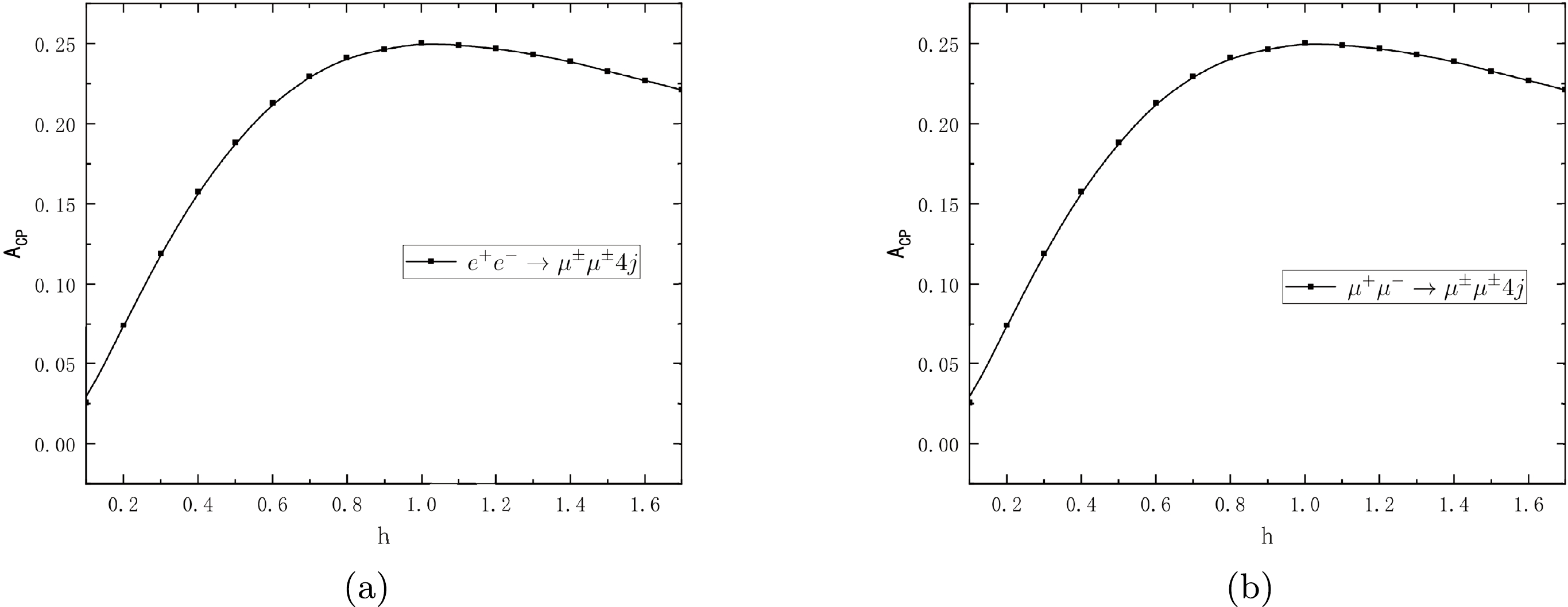 $ h=\Delta m/\Gamma_{N_1} $ , where$ \Gamma_{N_1} $ is the total decay width of a heavy Majorana neutrino$ N_1 $ , and its influence on CP violation is presented in Fig. 4. We can see that CP violation of$ e^+e^-\rightarrow \mu^\pm\mu^\pm 4j $ reaches the maximum value at approximately$ h=1 $ , the same as in$\mu^+\mu^-\rightarrow \mu^\pm\mu^\pm 4j$ . -