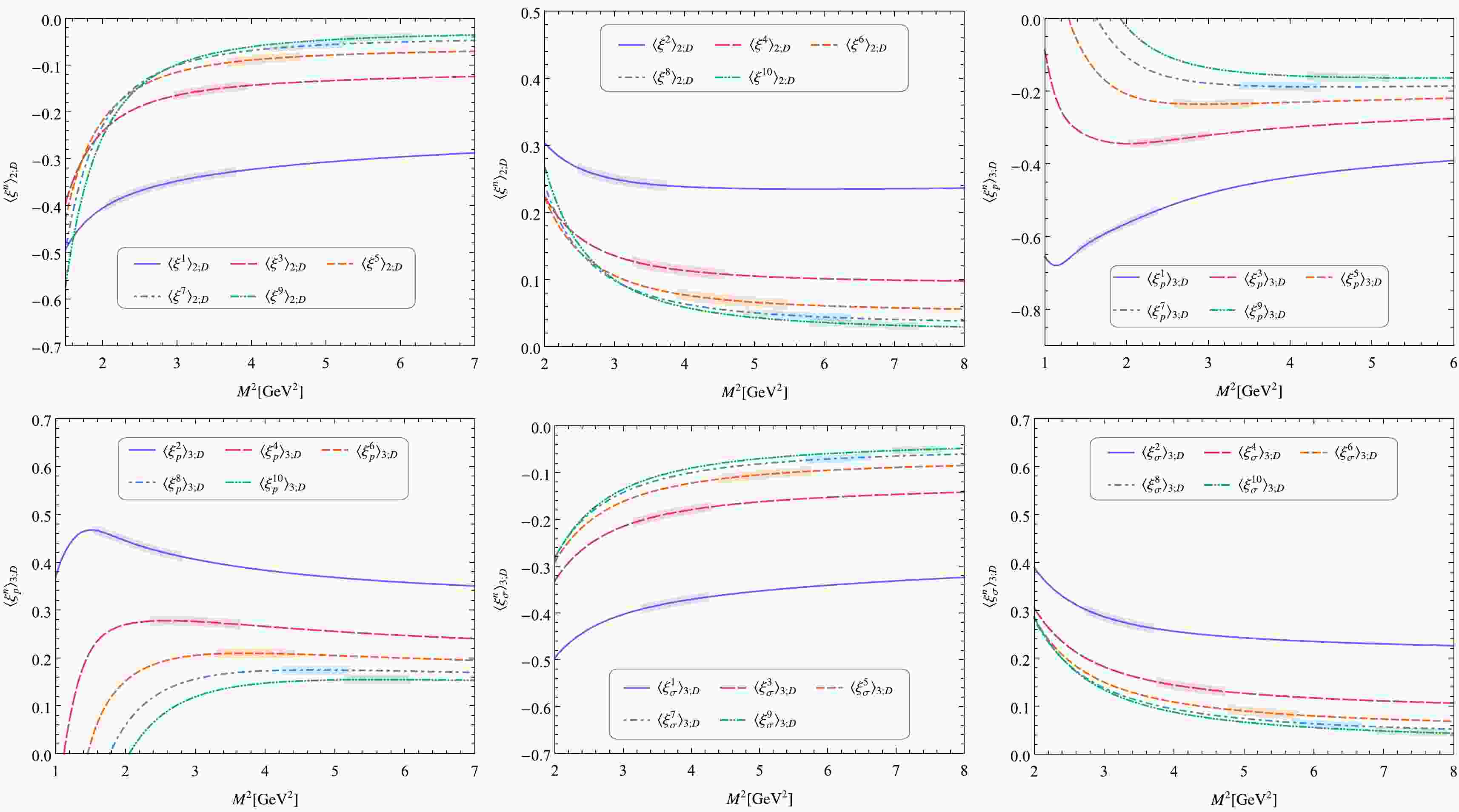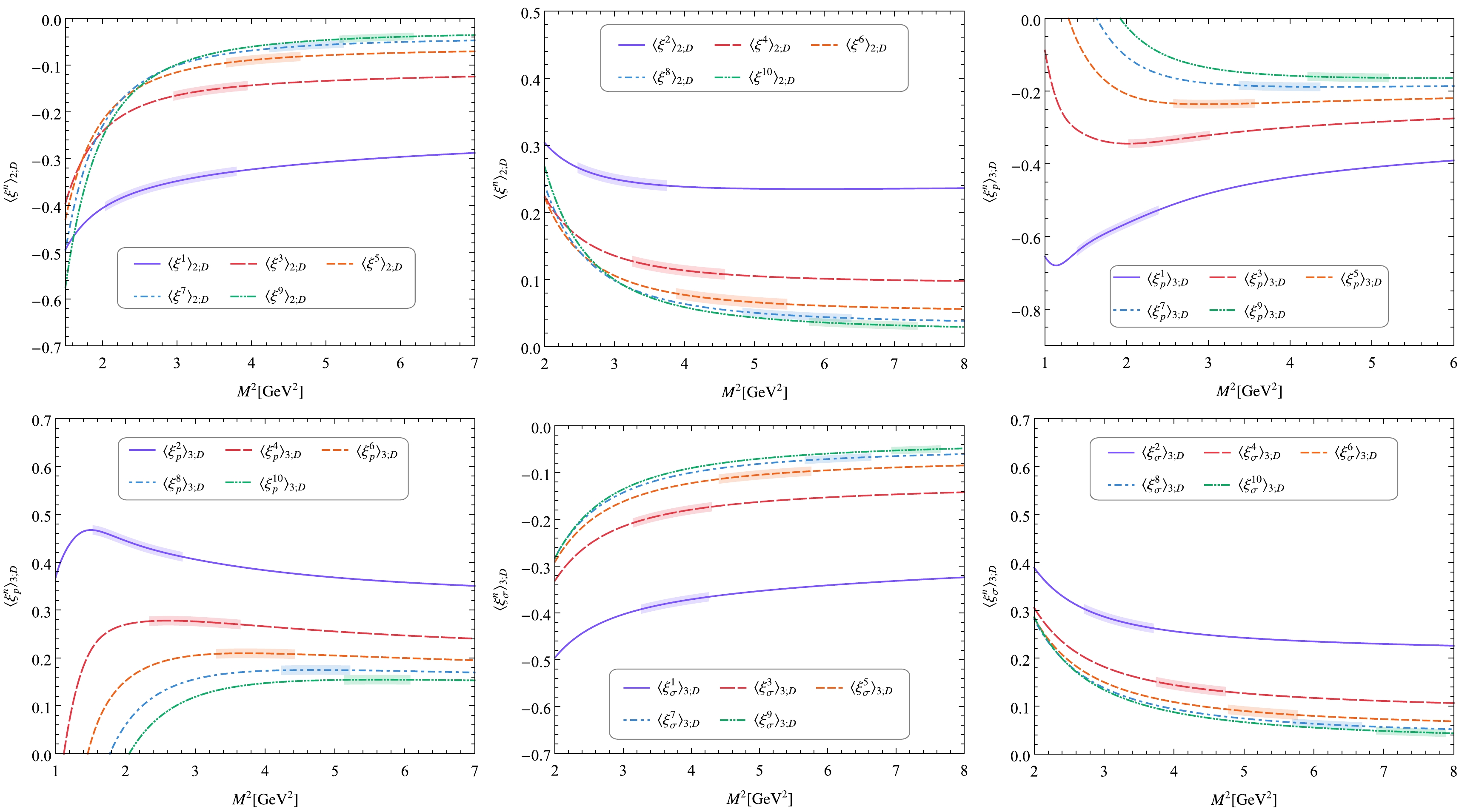 $ \langle \xi^n\rangle _{2;D} $ ,$ \langle \xi^n_p\rangle _{3;D} $ , and$ \langle \xi^n_\sigma\rangle _{3;D} $ with$(n=1,2,\cdots,10)$ versus the Borel parameter$ M^2 $ . To clearly show the curves of different ξ-moments, only the central values of ξ-moments are given, which are obtained by taking the central values of the input parameters shown in Eqs. (16) and (17).$ \left<\xi^1\right>_{2;D} $