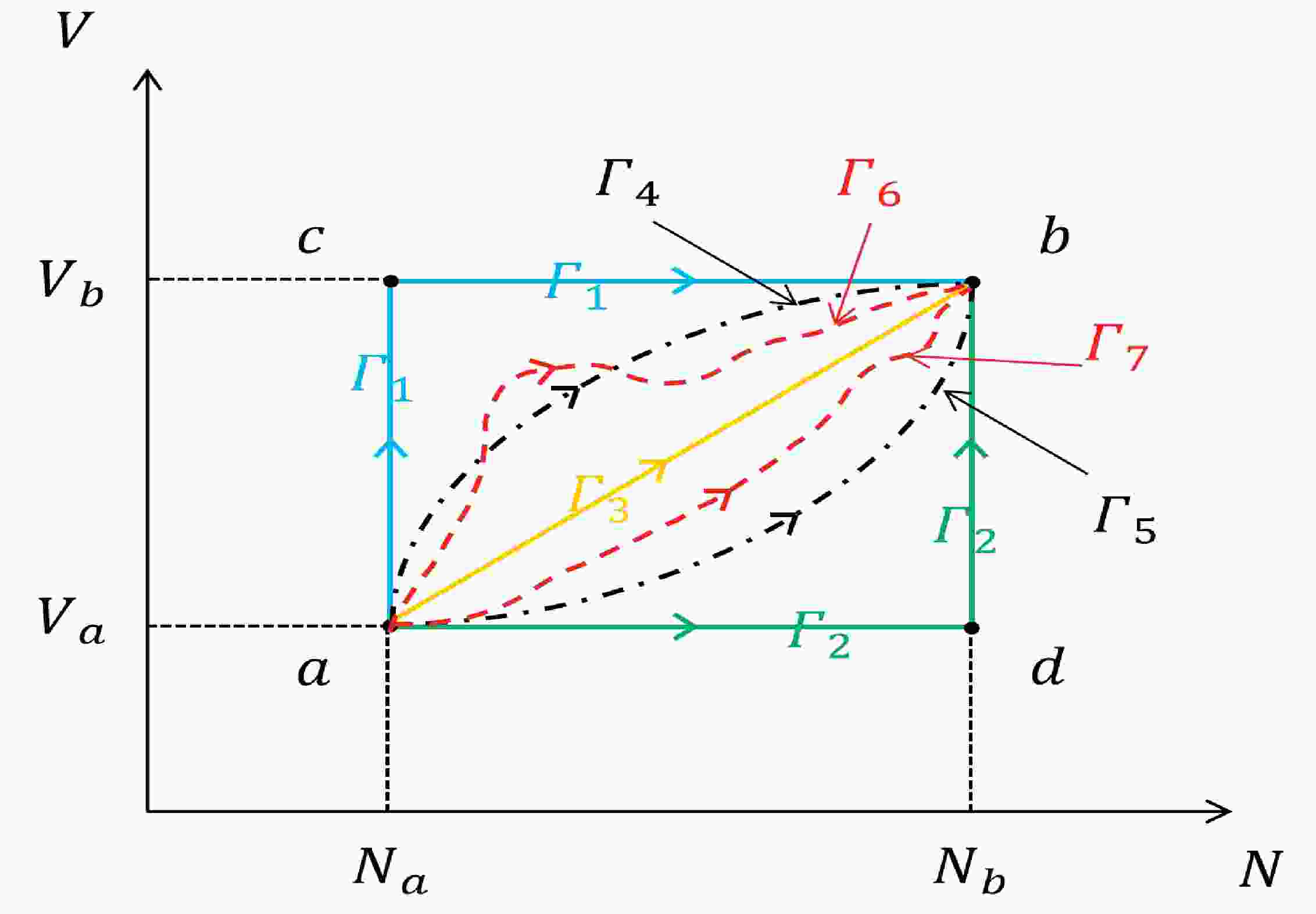 $ \Gamma_i $ , we have$ N_b-N_a=\int_a^b\Gamma_i\,\text{d}t $ . Because the states of the system are definite at the points$ a (V_a, N_a) $ and$ b (V_b, N_b) $ , for all curves, the entropy changes of the system between the points a and b are the same. The blue solid line ($ \Gamma_1 $ ) indicates that the system first expands from$ V_a $ to$ V_b $ with a conserved particle number, and then the particle number increases from$ N_a $ to$ N_b $ in the constant volume$ V_b $ . The processes of the green solid line ($ \Gamma_2 $ ) are exactly the opposite of$ \Gamma_1 $ . The solid yellow line ($ \Gamma_3 $ ) indicates that the increase in the particle number is proportional to the increase in the volume. The two black dash-dotted lines indicate that the particle production rate changes with respect to the volume slowly first and fast afterwards for$ \Gamma_4 $ and fast first and slowly afterwards for$ \Gamma_5 $ . The two red dashed lines ($ \Gamma_6 $ and$ \Gamma_7 $ ) indicate the situation where the relationship between the particle production rate and the volume is complicated. It should be noted that we actually cannot judge which particle production rate is consistent with reality, because of a lack of observations. In other words, from a macro perspective, there is no physical motivation for these particle production rates, but we can determine which one is reasonable according to the (future) observation. We mentioned earlier that particle production can accelerate the expansion of the universe [49, 52, 67–72]. If we know all the details of the expansion of the universe, the particle production rate of dark energy can be theoretically determined.Assume that the number of microscopic states of dark energy particles with energy between E and