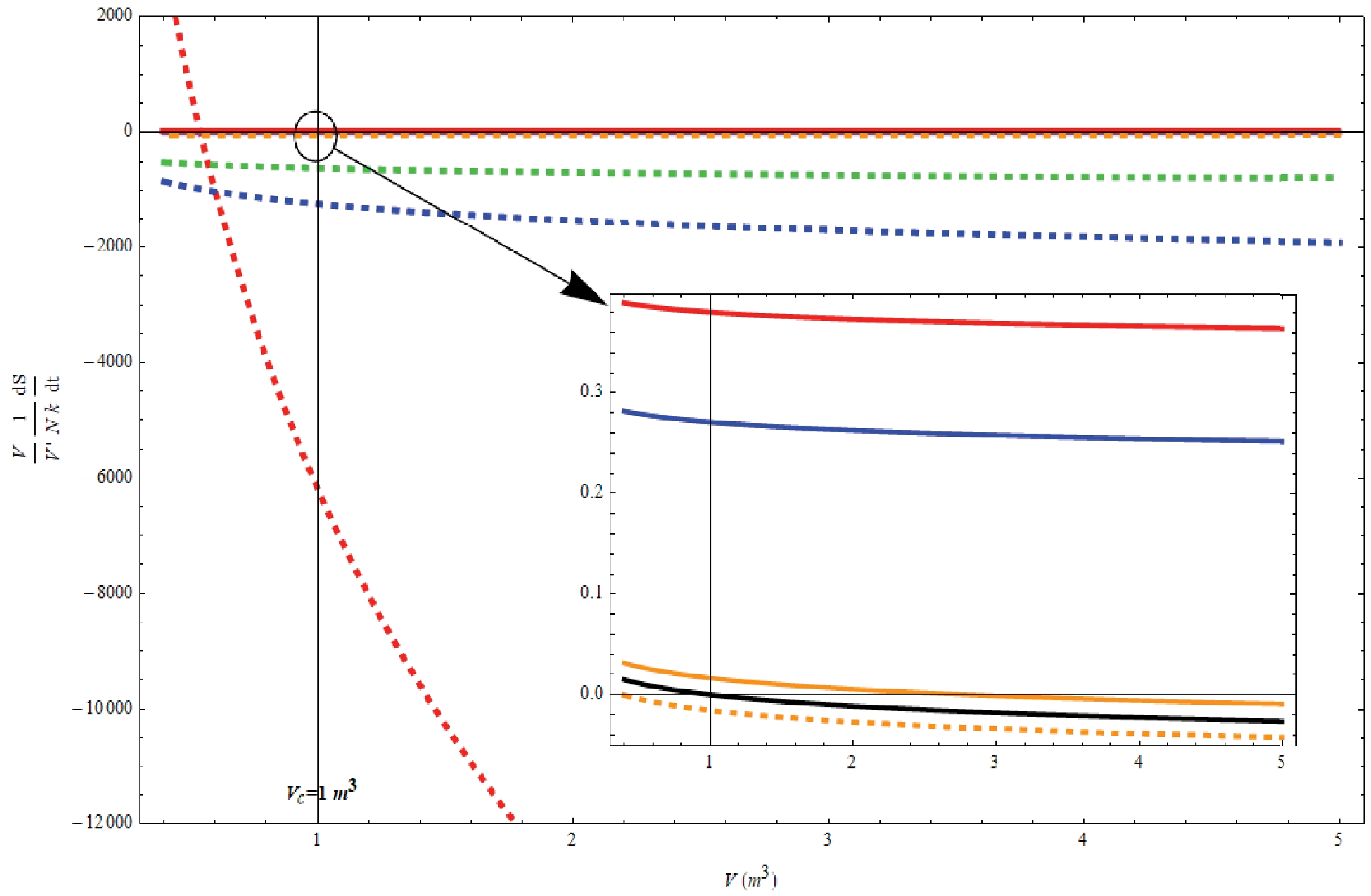 $ \dfrac{V'}{V}=-b\dfrac{N'}{N} $ . Then, Eq. (50) can be rewritten as$ \begin{eqnarray} \dfrac{V}{V'}\dfrac{1}{N\,k}\dfrac{\text{d}S}{\text{d}t}=\left\{ -\dfrac{1}{b}\ln\left[V^{1+\frac{1}{b}}\left(\dfrac{2\pi k\, m_0 T_0}{h_0^2}\right)^{3/2}\right]-\dfrac{3}{2b}+1\right\}, \end{eqnarray} $