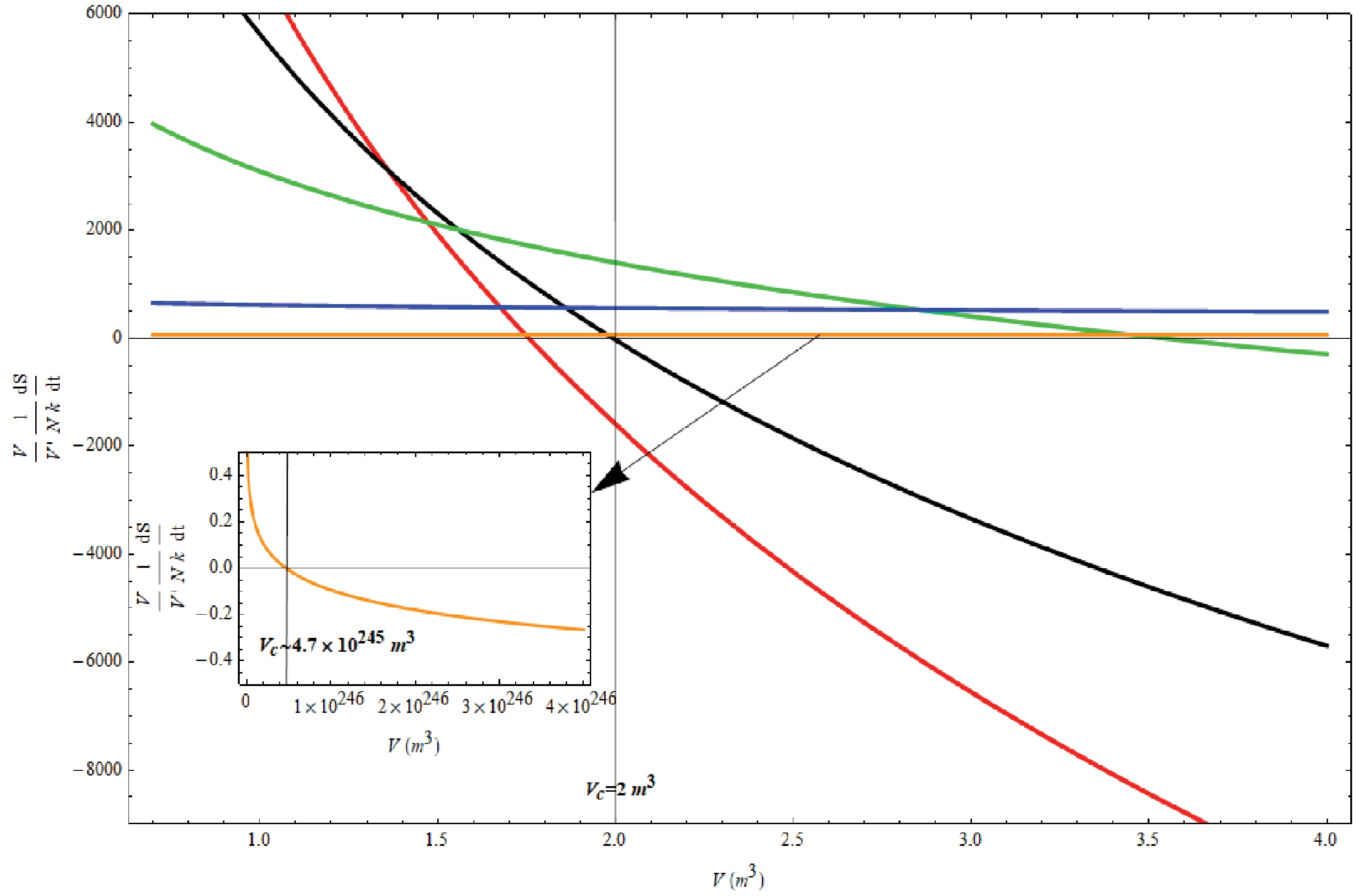 $ b=0.009 $ (red line),$ b=0.011 $ (black line),$ b=0.02 $ (green line),$ b=0.1 $ (blue line), and$ b=0.9 $ (orange line). The entropy increase rate indicated by the red line is negative at$ V_c=2\,\text{m}^3 $ . The entropy increase rate indicated by the black line ($ b=0.011 $ ) is exactly 0 at$ V_c=2\,\text{m}^3 $ . The entropy increase rates of all other lines are positive at$ V_c=2\,\text{m}^3 $ .According to the above discussion, we can conclude that, if the interaction between ideal gas-like dust and the space-time background increases the number of ideal gas-like dust particles, the entropy of ideal gas-like dust satisfies the second law of thermodynamics in general.