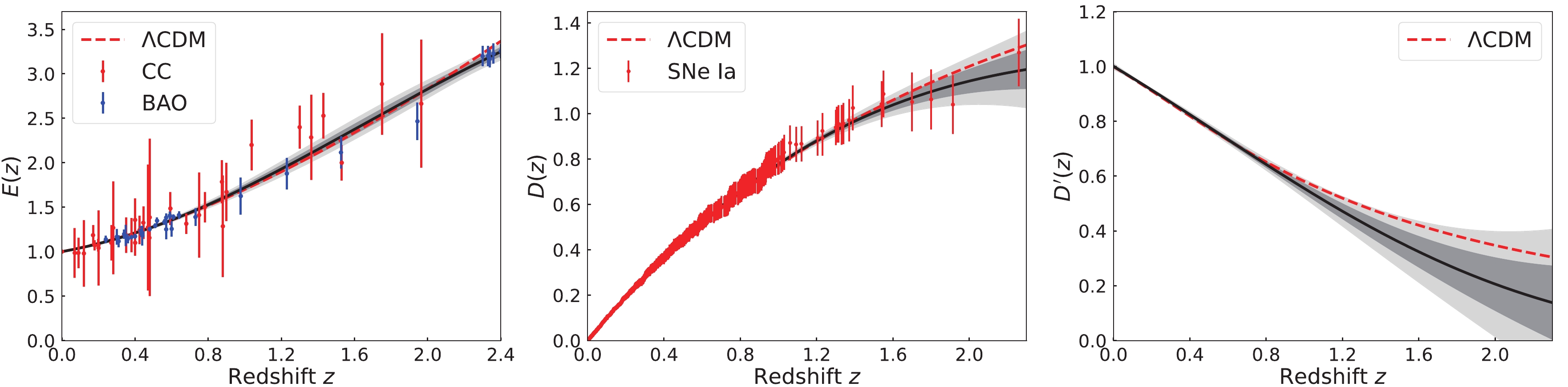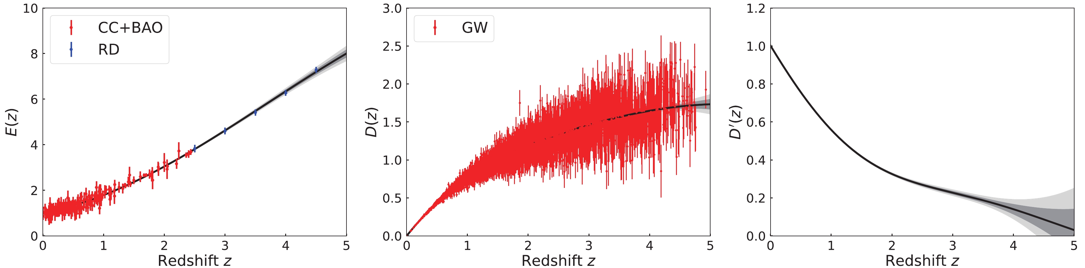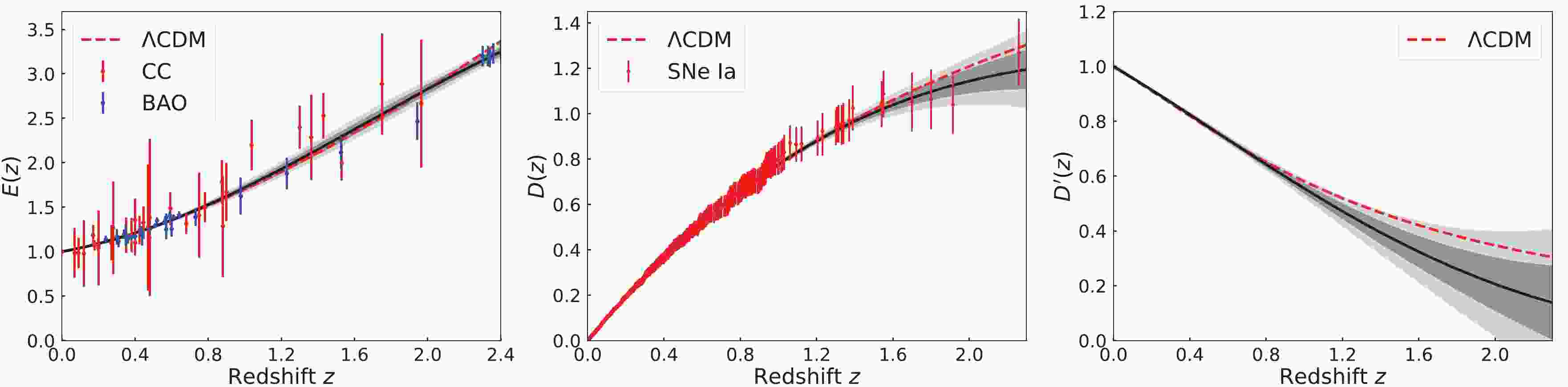 $ E(z) $ (left panel) from the simulated CC+BAO+RD$ H(z) $ data,$ D(z) $ (middle panel), and$ D'(z) $ (right panel) from the simulated GW$ D_L(z) $ data. The grey shaded regions are the$ 1\sigma $ and$ 2\sigma $ C.L. of the reconstruction. The dots with error bars are the simulated data.With the reconstructions of