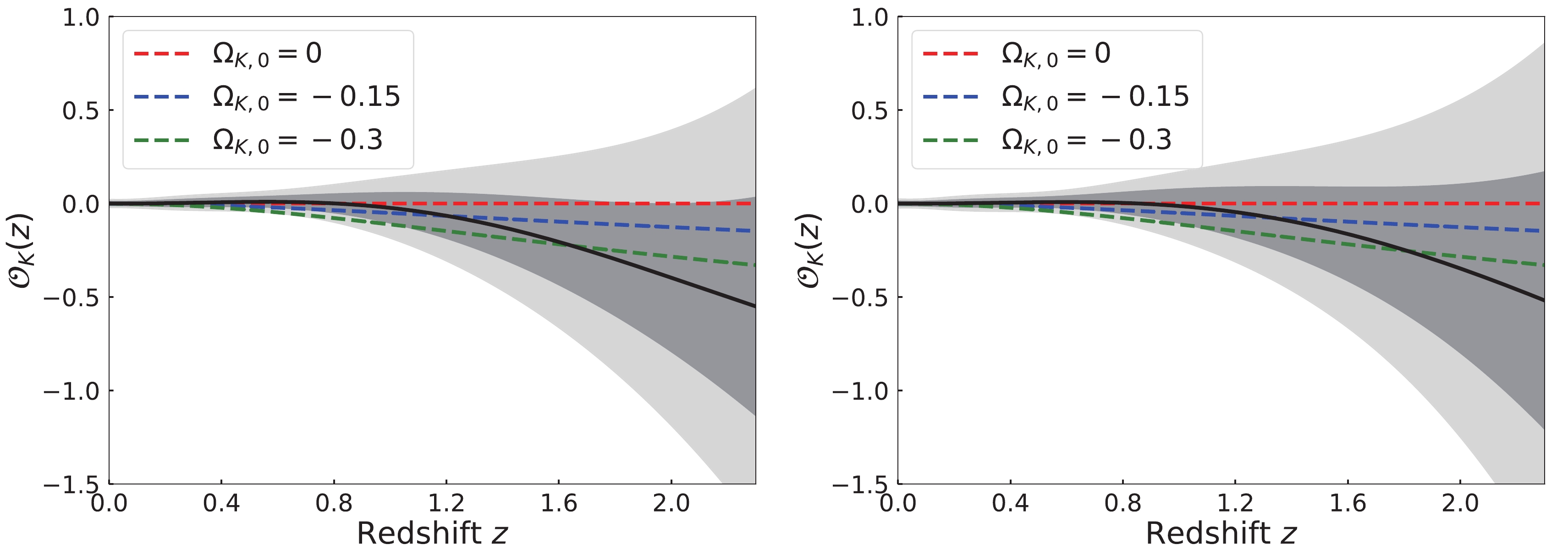 $ \mathcal{O}_{K}(z) $ . In contrast, we use the error propagation formula to calculate the error of$ \mathcal{O}_{K}(z) $ at each point z. The result is shown in the left panel of Fig. 2. The red dashed line refers to the spatially flat universe with$ \Omega_{K,0}=0 $ . It can be seen that the result is consistent with the flat universe within the domain$ 0<z<2.3 $ , falling within the$ 1\sigma $ C.L. We note that the mean of$ \mathcal{O}_{K}(z) $ is very close to zero in the redshift interval$ 0<z<1 $ ; however, it becomes increasingly negative at$ z>1 $ . In addition, the universe with$ \Omega_{K,0}=0 $ almost falls out of the$ 1\sigma $ C.L. at$ z>1.5 $ . This indicates that there is still a possibility for a spatially closed universe. Notably, the reconstruction at$ z>1.5 $ prefers a closed universe over an open one. We also plot the ΛCDM model with negative curvature in Fig. 2. As shown, a universe with$ \Omega_{K,0}= -0.15 $ can fall within the$ 1\sigma $ C.L., and a universe with$ \Omega_{K,0}=-0.3 $ can fall within the$ 2\sigma $ C.L. Note that the curves shown in Fig. 2 are plotted by assuming a ΛCDM model (with$\Omega_{ m}=0.28$ ), which is adopted here for comparison.