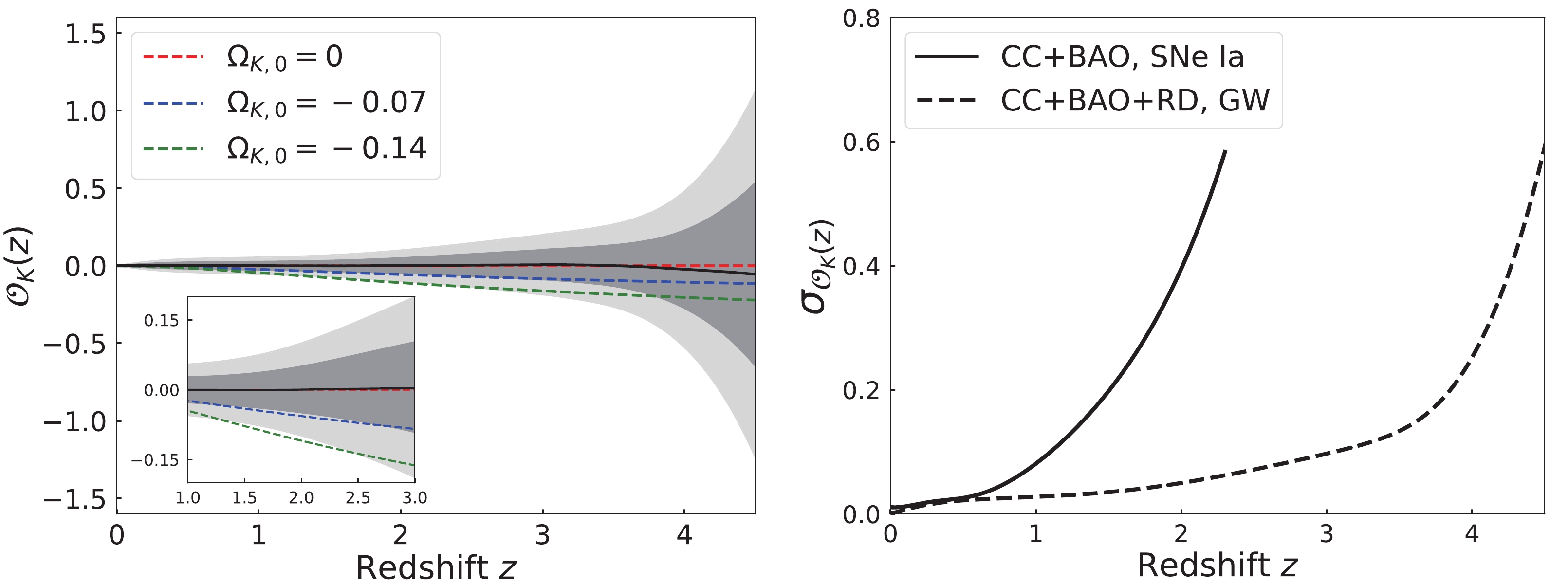 $ \mathcal{O}_{K}(z) $ from the simulated GW and CC+BAO+RD data (left panel). The grey shaded regions are the$ 1\sigma $ and$ 2\sigma $ C.L. of the reconstruction. The red, blue, and green dashed lines correspond to the universe with$ \Omega_{K,0}=0 $ ,$ \Omega_{K,0}=-0.07 $ , and$ \Omega_{K,0}=-0.14 $ , respectively. The right panel shows the$ 1\sigma $ error of the reconstructed$ \mathcal{O}_{K}(z) $ from the observational {CC+BAO, SNe Ia} data and simulated {CC+BAO+RD, GW} data, respectively.In this work, we simulated only five RD measurements at high redshifts by observing the Ly-α absorption lines of QSOs. It should be pointed out that the SKA Phase I can measure the RD at