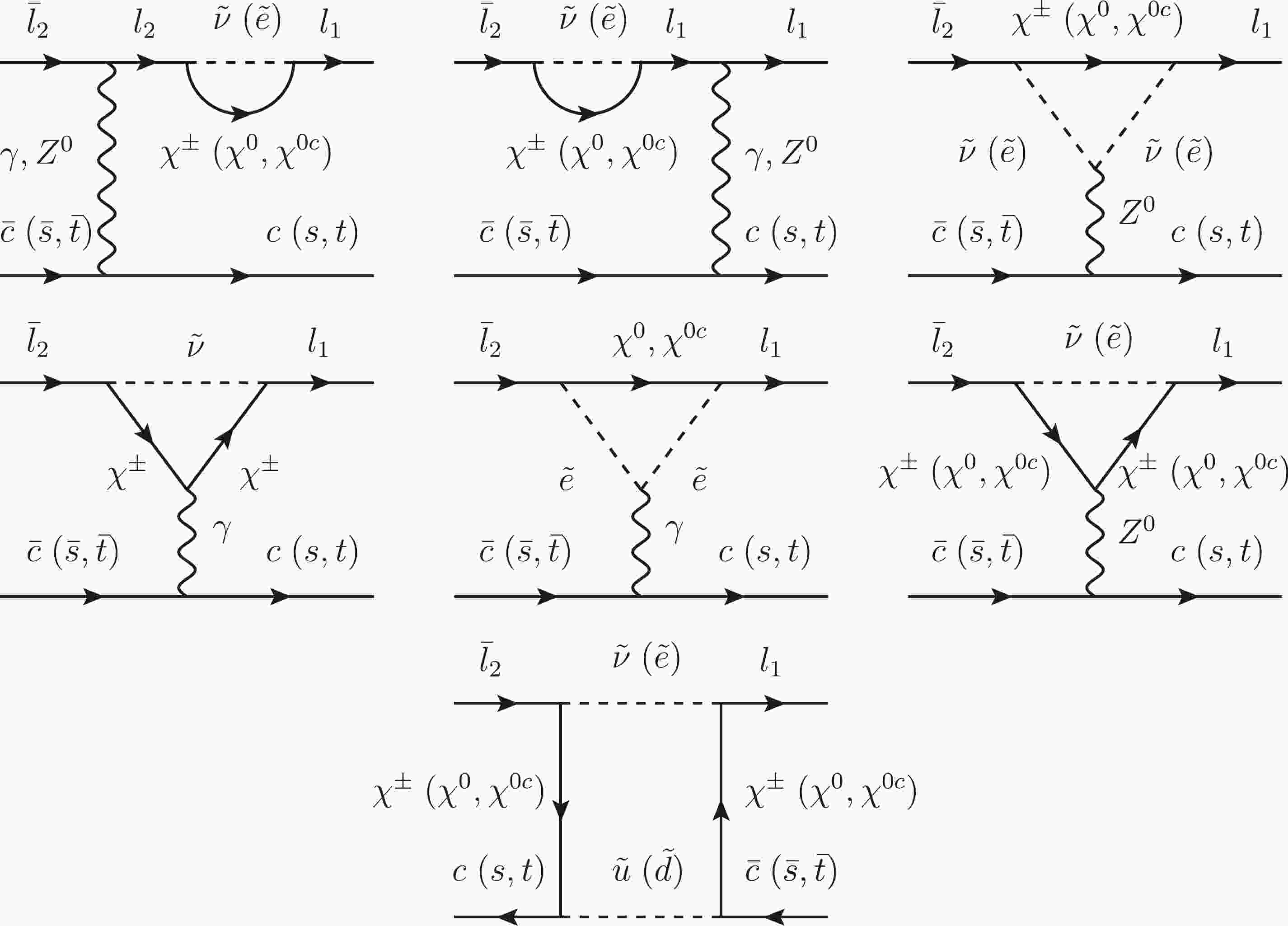 $ V\rightarrow l_1 l_2 $ in detail. The one-loop Feynman diagrams for the LFV decays$ V\rightarrow l_1 l_2 $ in the MRSSM are shown in Fig. 1. The analytical expression of the BR$ (V\rightarrow l_{1} l_{2}) $ is given in terms of the Wilson coefficients using the effective Lagrangian method in which the general effective Lagrangian for$ V\rightarrow l_1 l_2 $ is expressed as [19]$ \begin{aligned}[b] -\mathcal{L}_{\rm eff} =&m_2(C^{l_1l_2}_{DR}\bar{l}_1\sigma^{\mu\nu}P_Ll_2 +C^{l_1l_2}_{DL}\bar{l}_1\sigma^{\mu\nu}P_Rl_2)F_{\mu\nu}+{\rm h.c}.\\ &+\sum_q\Big[\big(C^{ql_1l_2}_{VR}\bar{l}_1\gamma^{\mu}P_R l_2+C^{ql_1l_2}_{VL}\bar{l}_1\gamma^{\mu}P_L l_2\big)\bar{q}\gamma_{\mu}q\\ &+\big(C^{ql_1l_2}_{AR}\bar{l}_1\gamma^{\mu}P_R l_2+C^{ql_1l_2}_{AL}\bar{l}_1\gamma^{\mu}P_L l_2\big)\bar{q}\gamma_{\mu}\gamma_5 q\\ &+m_2 m_q G_F \big(C^{ql_1l_2}_{SR}\bar{l}_1P_L l_2+C^{ql_1l_2}_{SL}\bar{l}_1P_R l_2\big)\bar{q}q\\ &+m_2 m_q G_F \big(C^{ql_1l_2}_{PR}\bar{l}_1P_L l_2+C^{ql_1l_2}_{PL}\bar{l}_1P_R l_2\big)\bar{q}\gamma_5 q\\ &+m_2 m_q G_F \big(C^{ql_1l_2}_{TR}\bar{l}_1\sigma^{\mu\nu}P_L l_2\\&+C^{ql_1l_2}_{TL}\bar{l}_1\sigma^{\mu\nu}P_R l_2\big)\bar{q}\sigma_{\mu\nu}q+{\rm h.c}.\Big], \end{aligned} $
