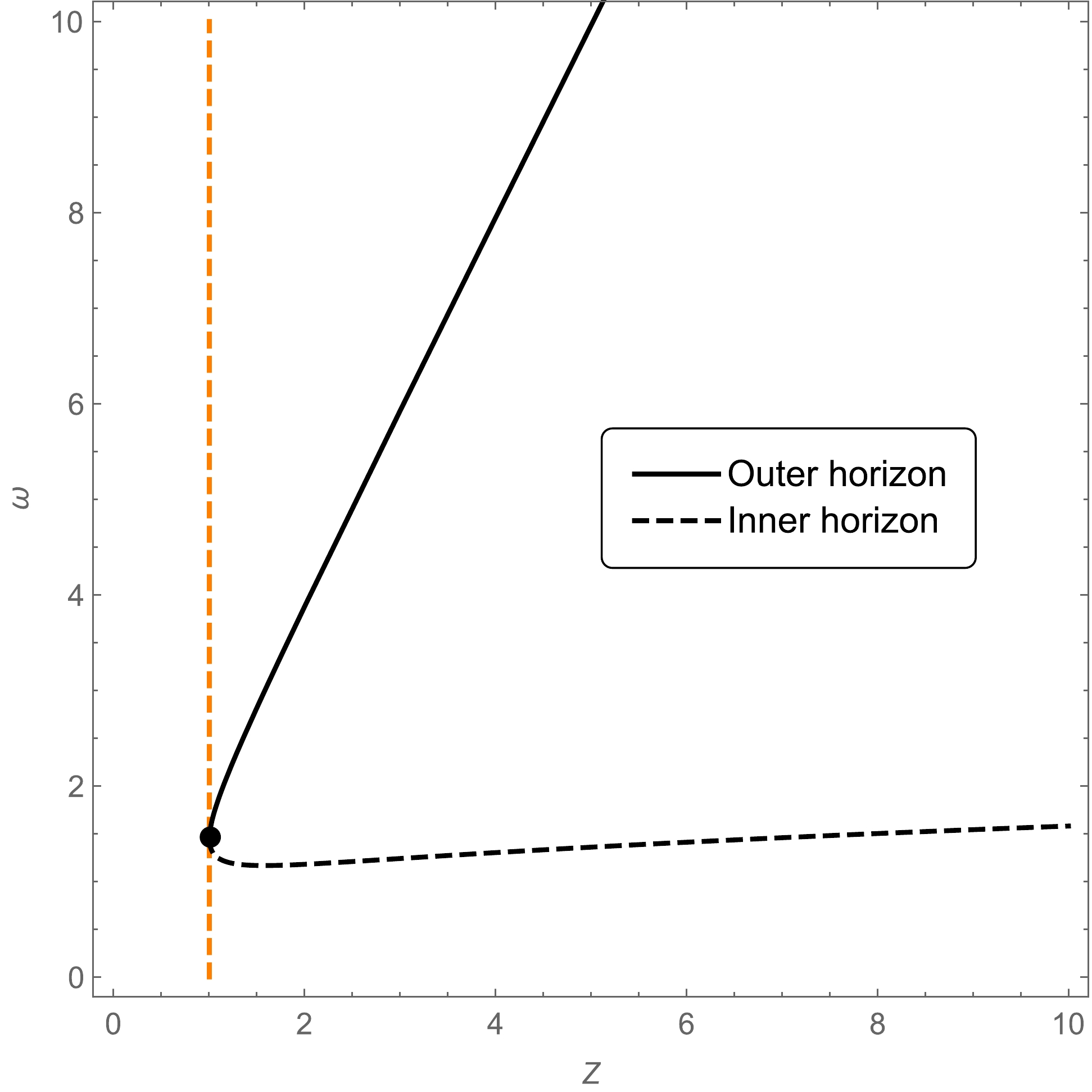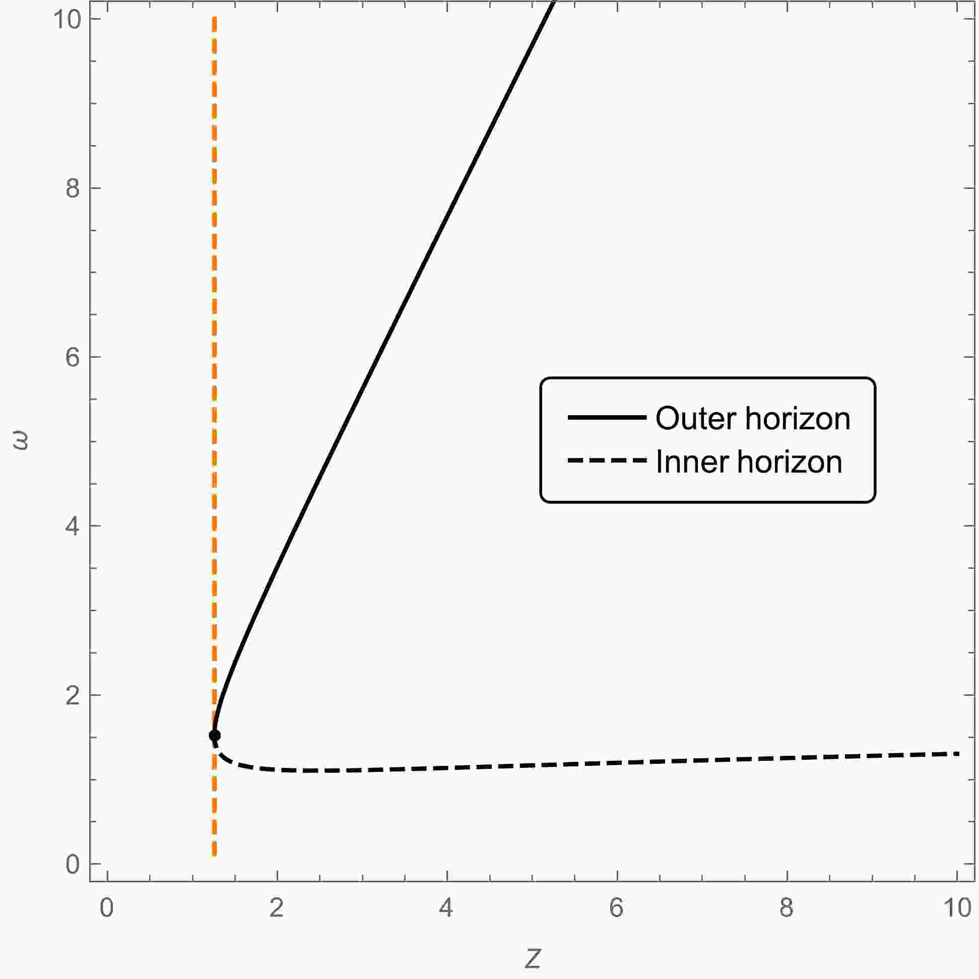 (43) We plot the locations of the outer and inner horizons in Fig. 5. The point where the inner and outer horizons meet is given by