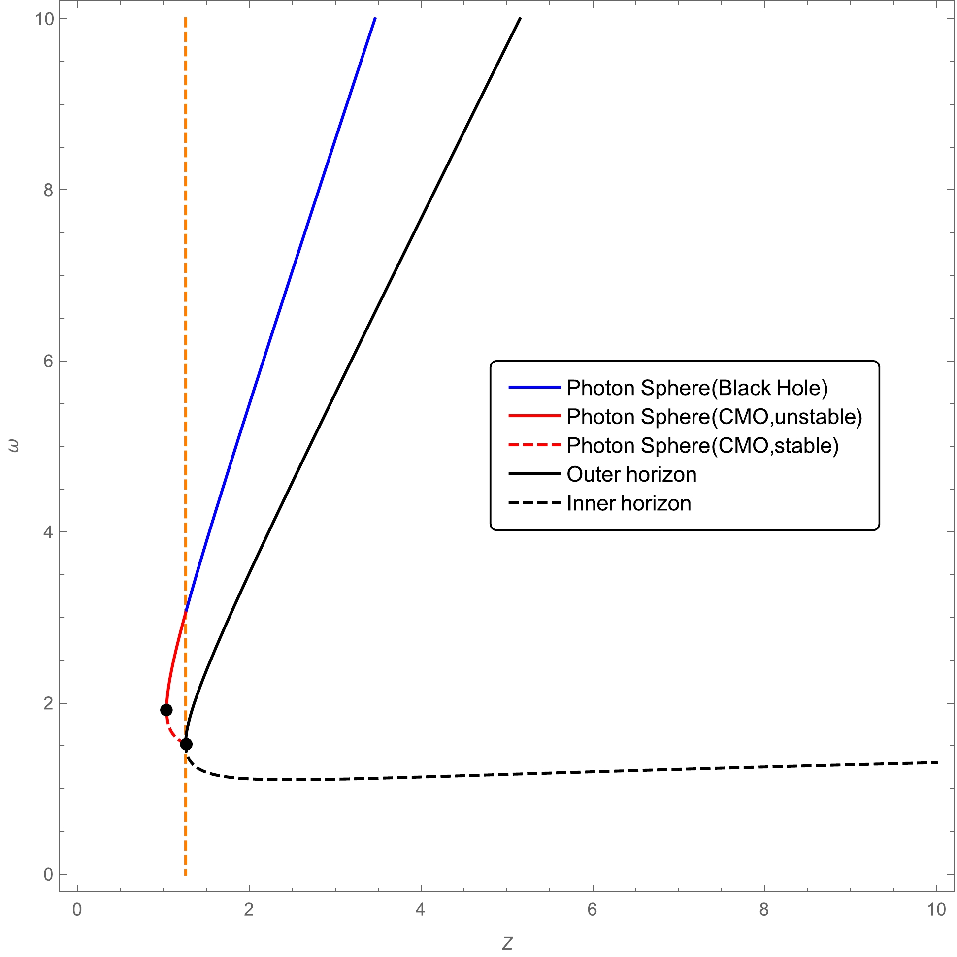 $ x=1 $ and$ n=3 $ . The vertical dashed line in orange is the borderline between the region in the black hole phase (right) and the region in the CMO phase (left).$ z=\frac{M}{\alpha_0^{1/2}}=1.010...;\quad \omega=\frac{r}{\alpha_0^{1/2}}=1.465.... $