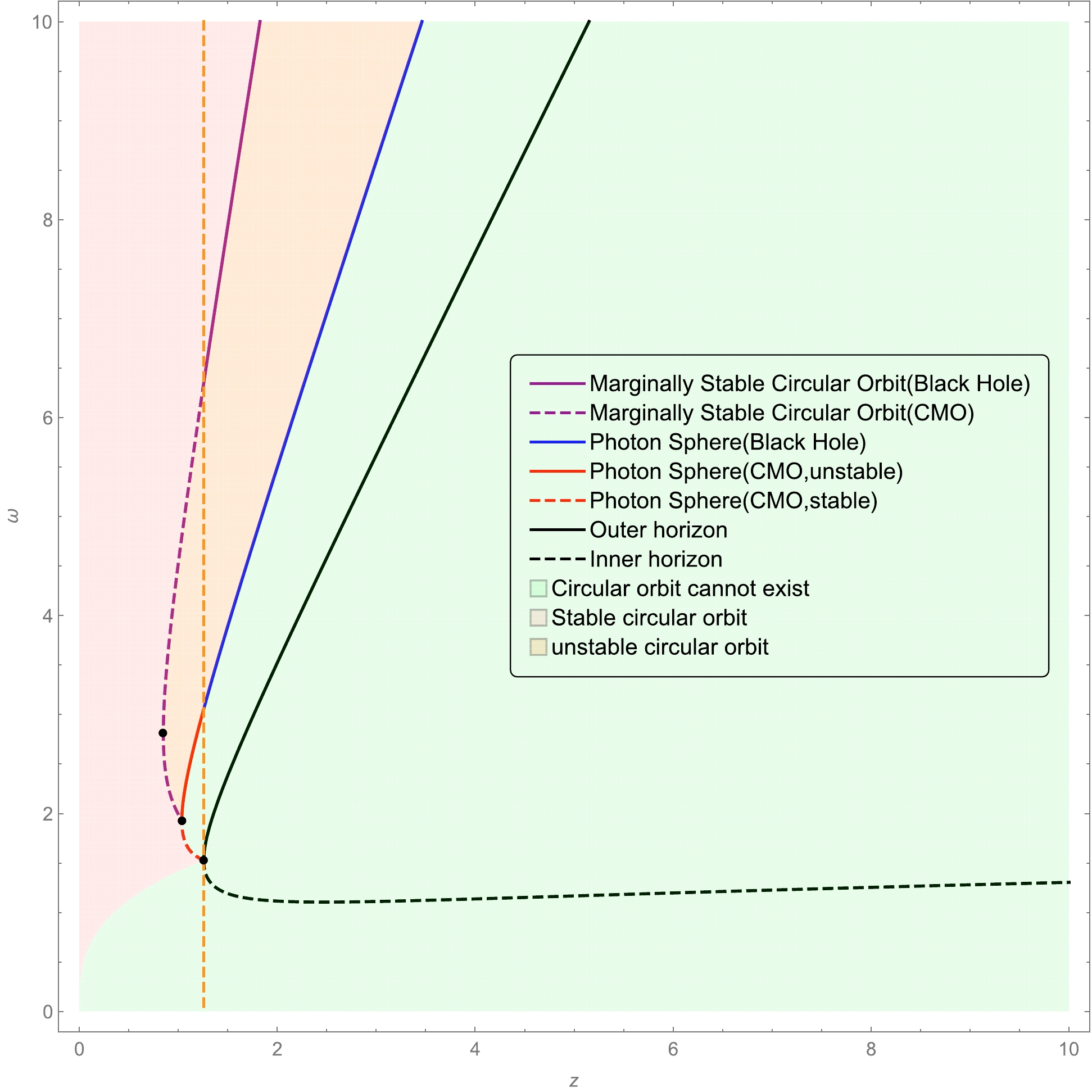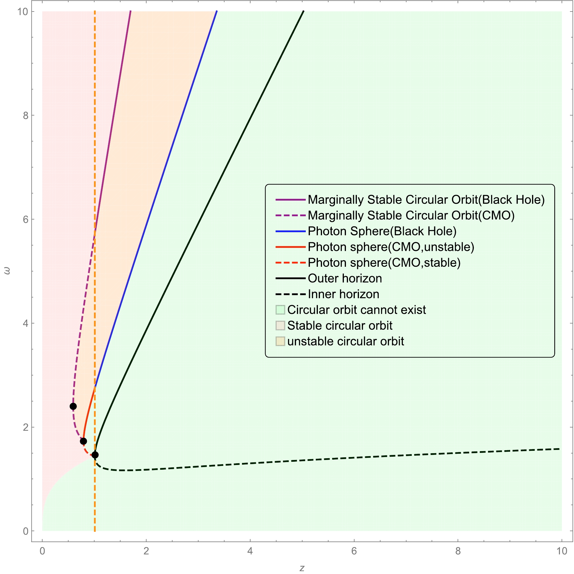 $ x=1 $ and$ n=3 $ . The purple solid line represents the location of the marginally stable circular orbit in the black hole phase, whereas the purple dashed line is the marginally stable circular orbit in the CMO phase. In the region shaded in orange, all the circular orbits are unstable, whereas in the region shaded in pink, all the circular orbit are stable. The region shaded in green denotes the place where the circular orbit does not exist. The turning point of each curve is marked by a black dot.$ z=\frac{M}{\alpha_0^{1/2}}=0.595...;\quad \omega=\frac{r}{\alpha_0^{1/2}}=2.403.... $