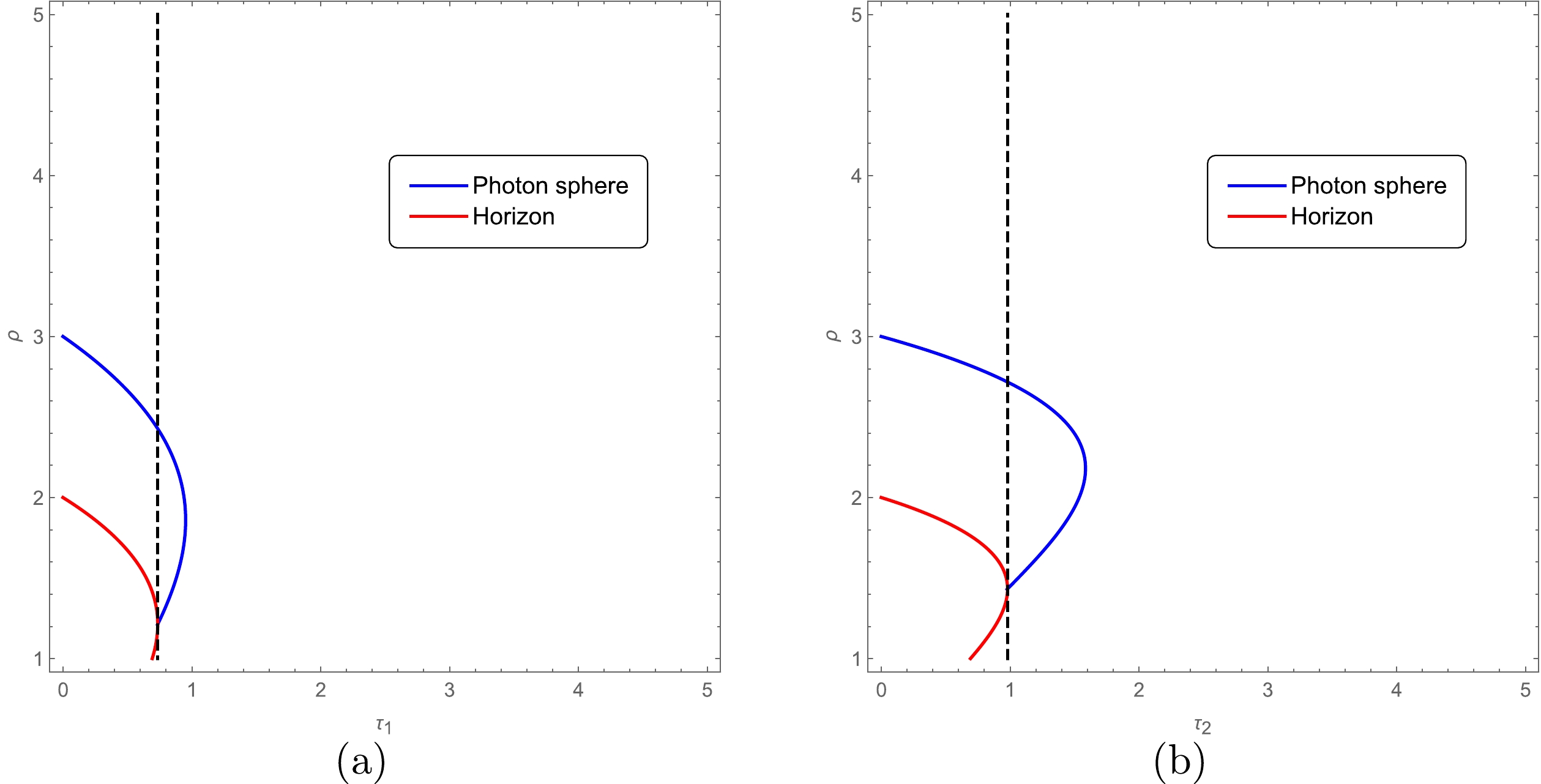 $ n=2 $ and$ x=2/3 $ (a),$ n=3 $ and$ x=1 $ (b). The blue solid line is the location of the photon sphere, and the red solid line is the location of the horizon. The left region of the black dashed line is the phase of the black hole, and the right region is the phase of the CMO.$ 2.43 \leq \rho_1 \leq 3;\quad 0 \leq \tau_1 \leq 0.74, $