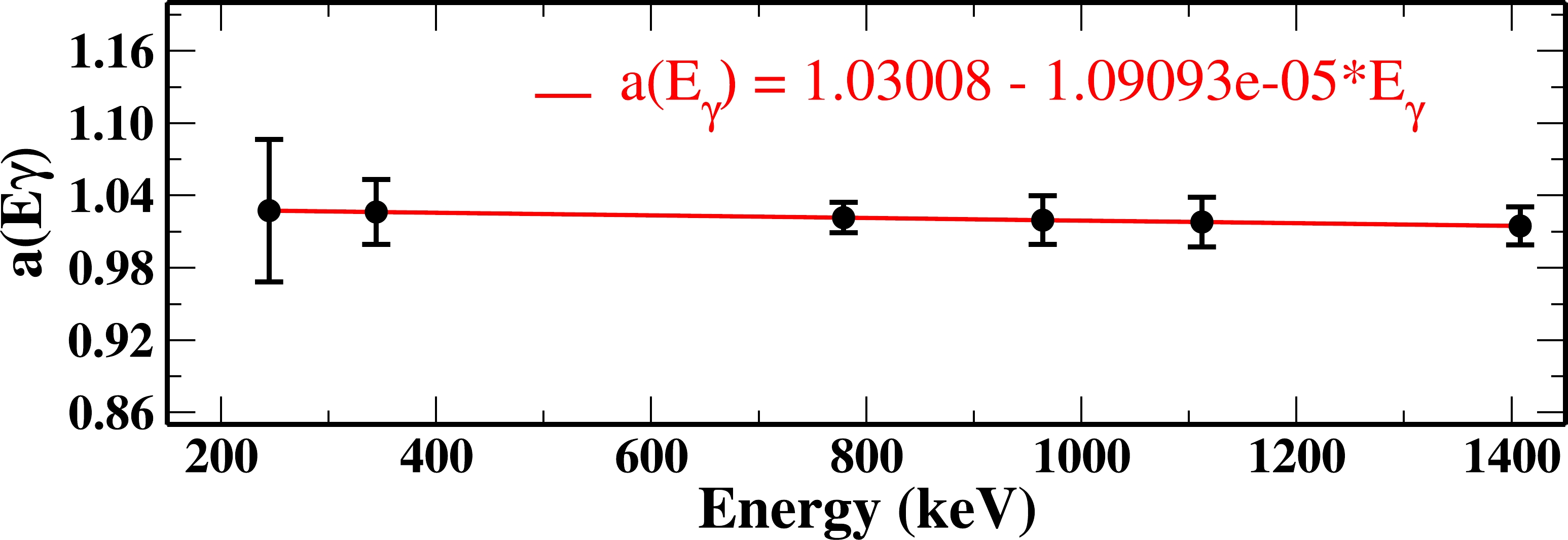 $ _\parallel $ and N$ _\perp $ represent the counts for the actual Compton-scattered γ rays in the directions parallel and perpendicular to the reaction plane, respectively. The correction factor a(E$ _\gamma $ ), which was introduced for handling the asymmetry in the response of the segments of the clover detector [20], was estimated using an unpolarized$ ^{152} $ Eu source and is evaluated using the relation$ a(E_{\gamma}) = \frac{N_\parallel}{N_\perp}. $