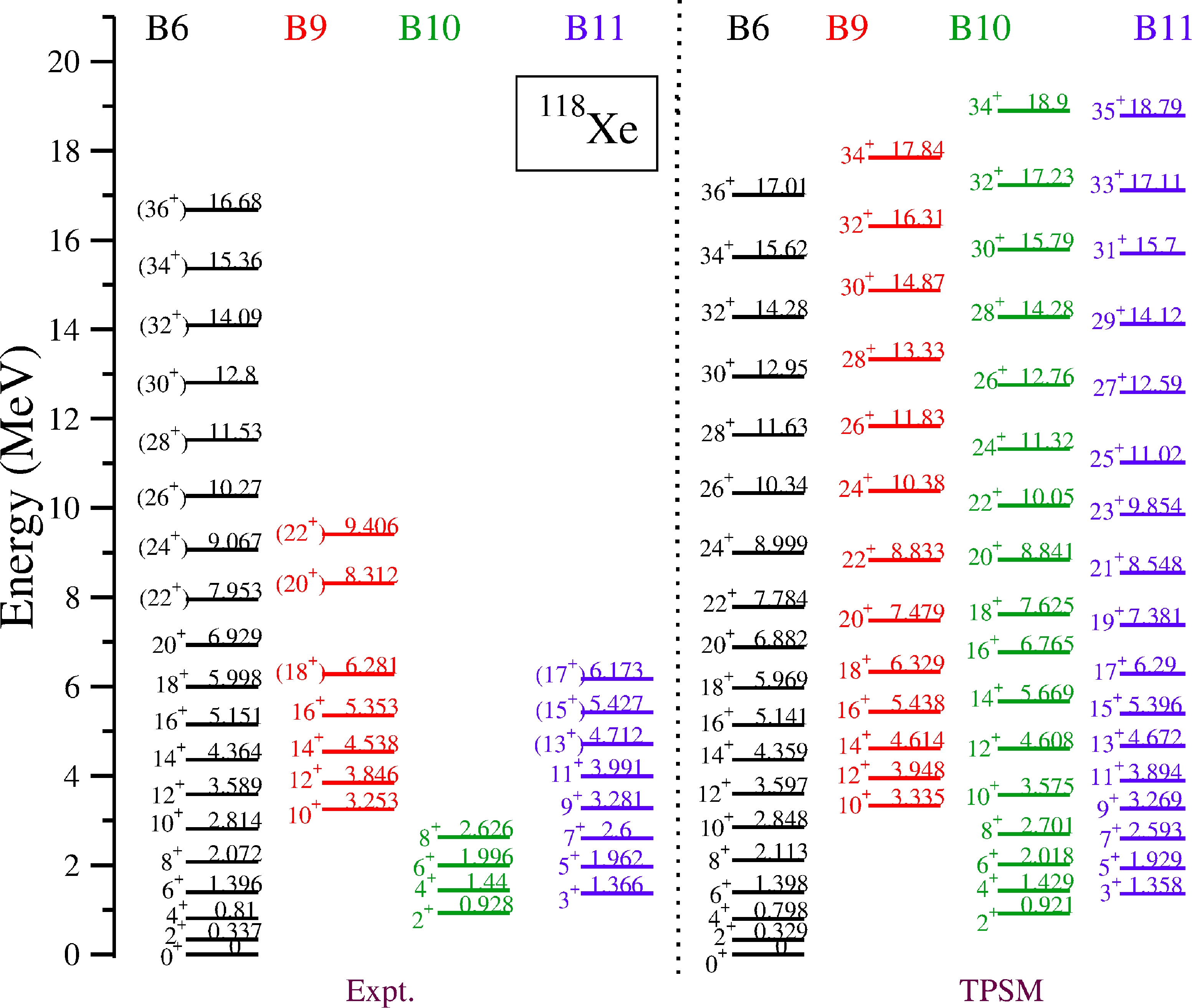 $ ^{118} $ Xe. For clarity, only the lowest projected K-configurations in the wavefunctions of bands are shown, and in the numerical calculations, the projection has been performed from 44 intrinsic states.We would like to add that the TPSM approach conserves the parity quantum number at the mean-field level, as octupole correlations are not considered. The enhanced