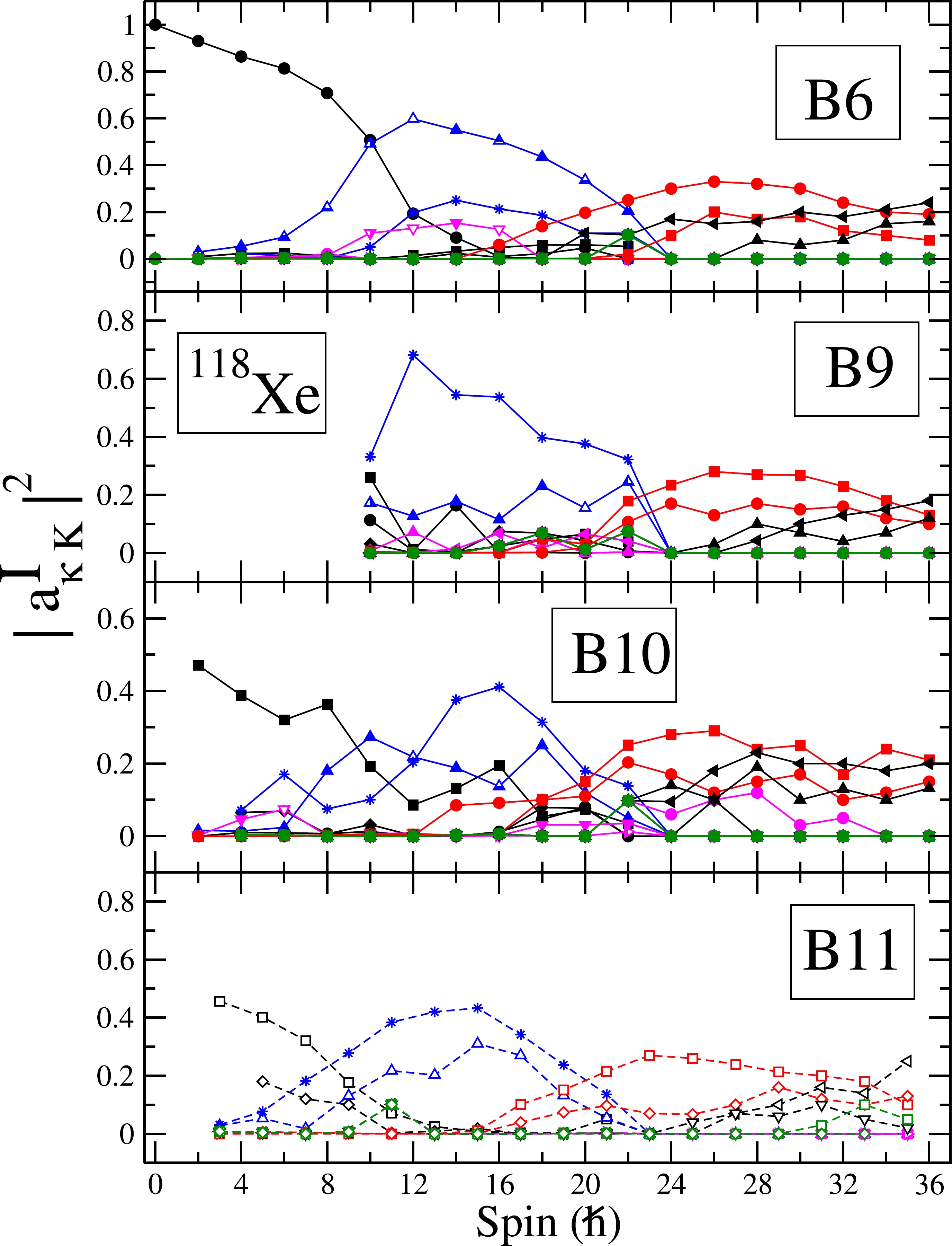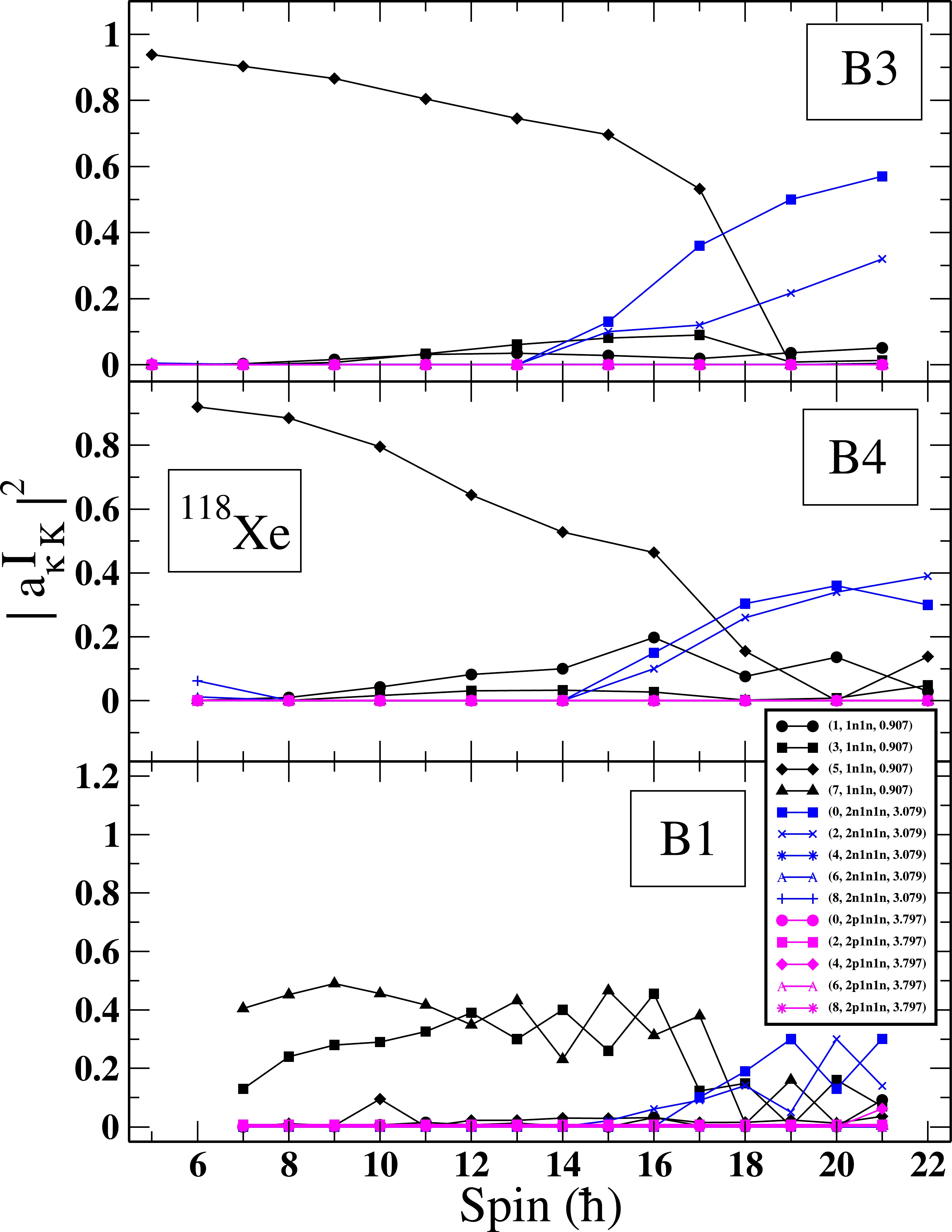 $ ^{118} $ Xe. For clarity, only the lowest projected K-configurations in the wavefunctions of bands are shown. In the numerical calculations, projection has been performed from 44 intrinsic states. The probabilities |a$ ^{I}_{\kappa} $ $ _K $ |$ ^2 $ of various bands are labeled as in Fig. 10.We would like to add that there has been some controversy regarding the nature of the bandcrossings in