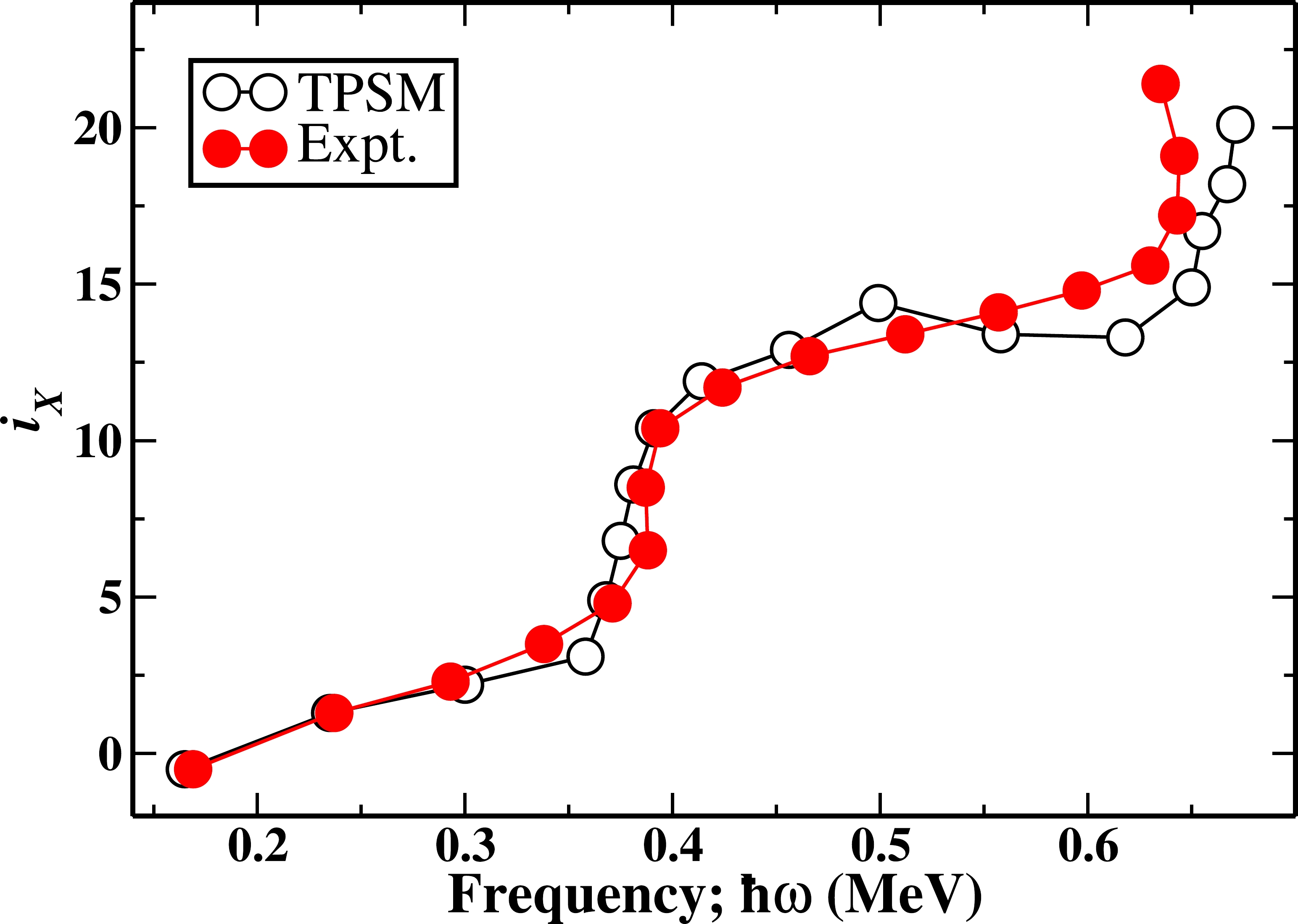 $ \hat R(\Omega) $ being the rotation operator in terms of Euler angles. The$ {\,|\,} \Phi{ >\,} $ in the TPSM approach is the triaxial quasiparticle vacuum state, and the angular-momentum projection operator in Eq. (7) projects not only the good angular-momentum but also states having good K-values.TPSM calculations for positive parity states have been performed by considering both neutrons and protons occupying the three major oscillator shells of