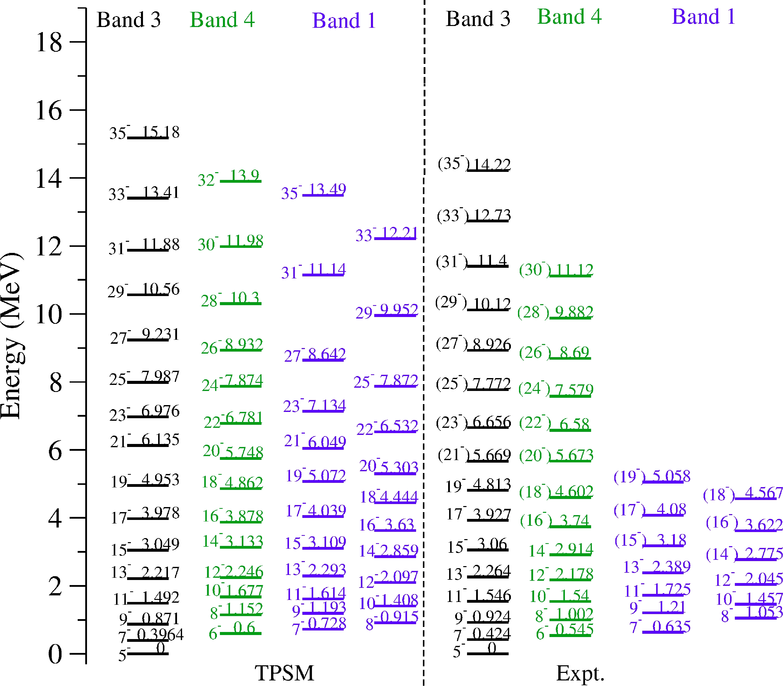 $ \alpha=0 $ component of the four-neutron quasiparticle state, having K=2, crosses the yrast-state band at I=34. The projected band from the K=4 component of the four-neutron state also crosses the ground-state at a higher spin value. In contrast, the$ \alpha=1 $ branch of this configuration and the four-proton quasiparticle band structures lie at higher excitation energies.The obtained band structures after diagonalization of the shell model Hamiltonian are compared with the experimental data in Fig. 11. It is evident from Fig. 11 that the TPSM approach reproduces the experimental data reasonably well. The calculated band structures have been plotted using the wavefunction analysis shown in Fig. 12, as was done for