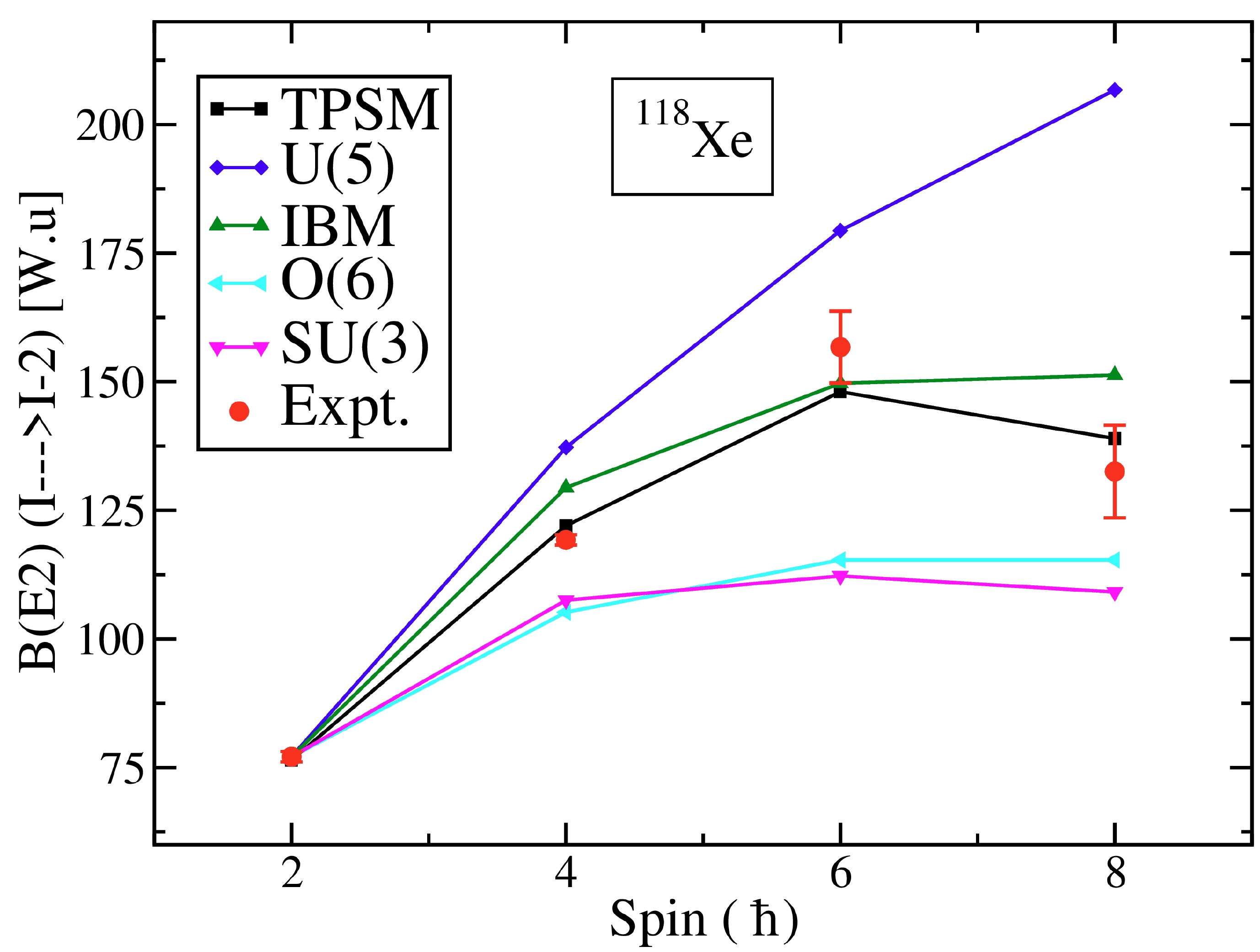 $^{118}{\rm Xe}$ with TPSM and IBM calculations. The experimental data for the transition strengths and the results of the IBM calculations are from Ref. [38].In particular, the increasing trend of B(E2) values for low-spin states up to