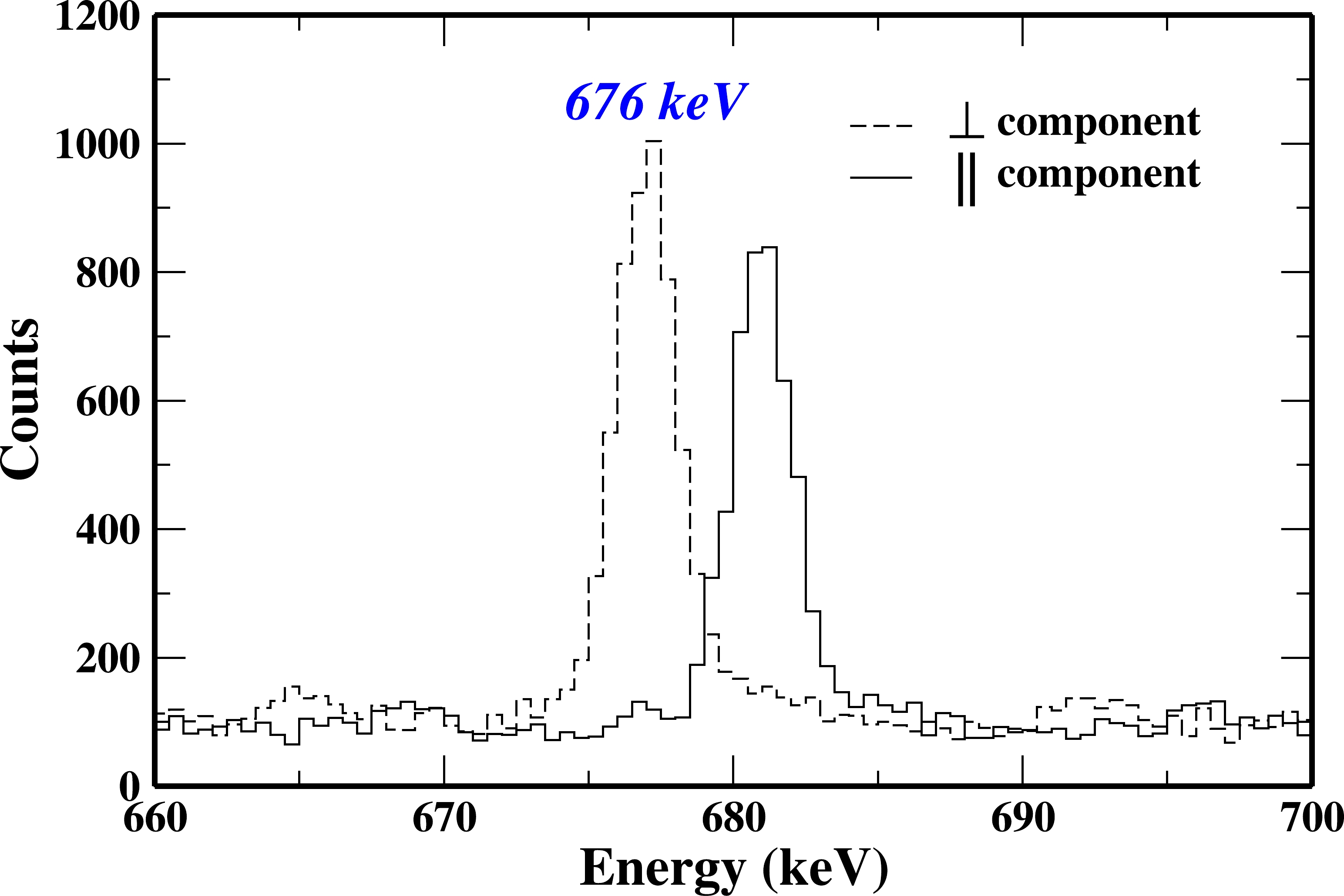 Figure 2. (color online) Perpendicular (dashed line) and parallel (solid line) components of the 676 keV γ ray in