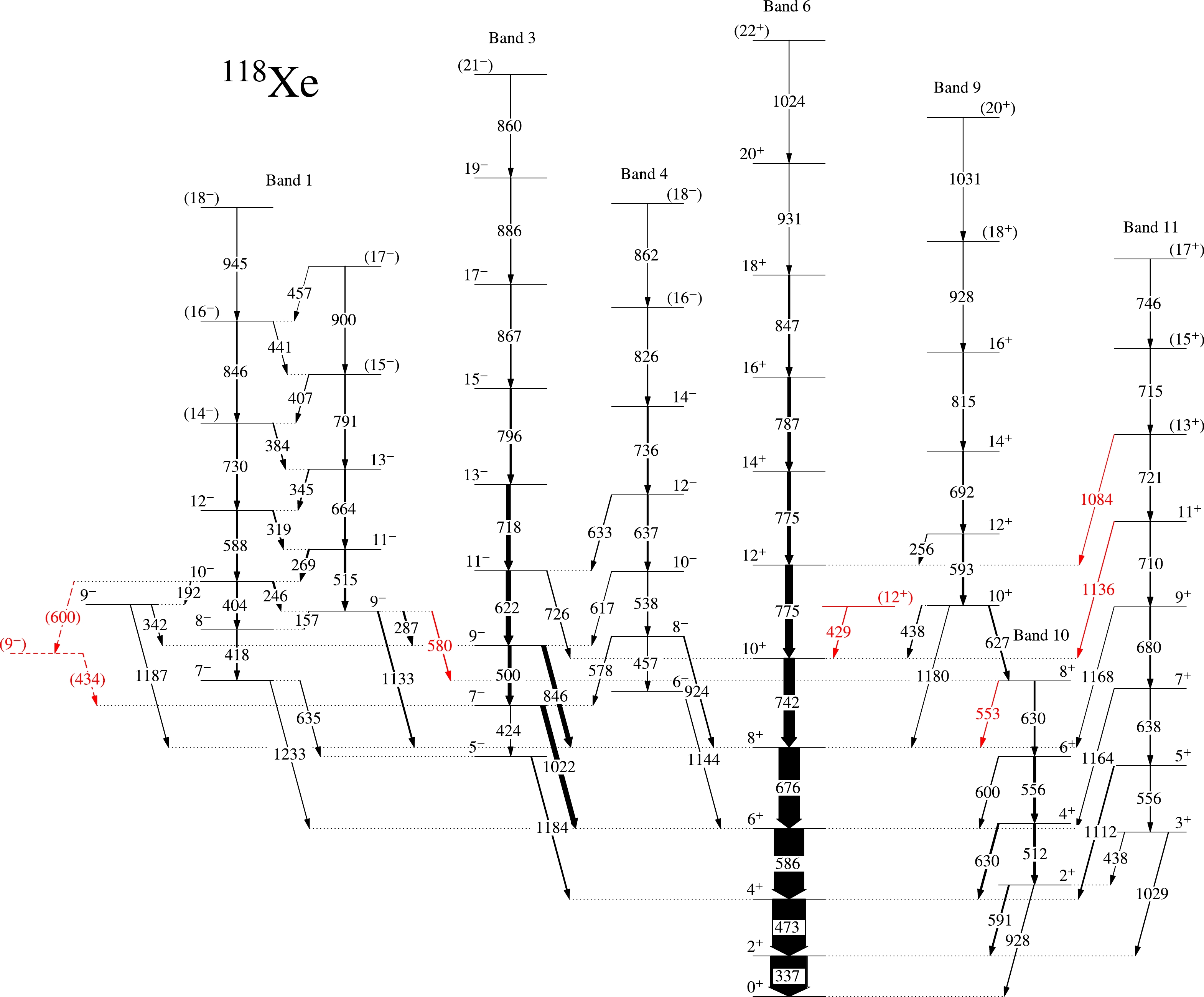 $ ^{118} $ Xe deduced in the present work. Newly identified γ-rays are marked in red. Other peaks shown here were previously reported in [10]. Only bands that were reproduced in the present work are shown and discussed in the text.E $_{\gamma}$ /keV