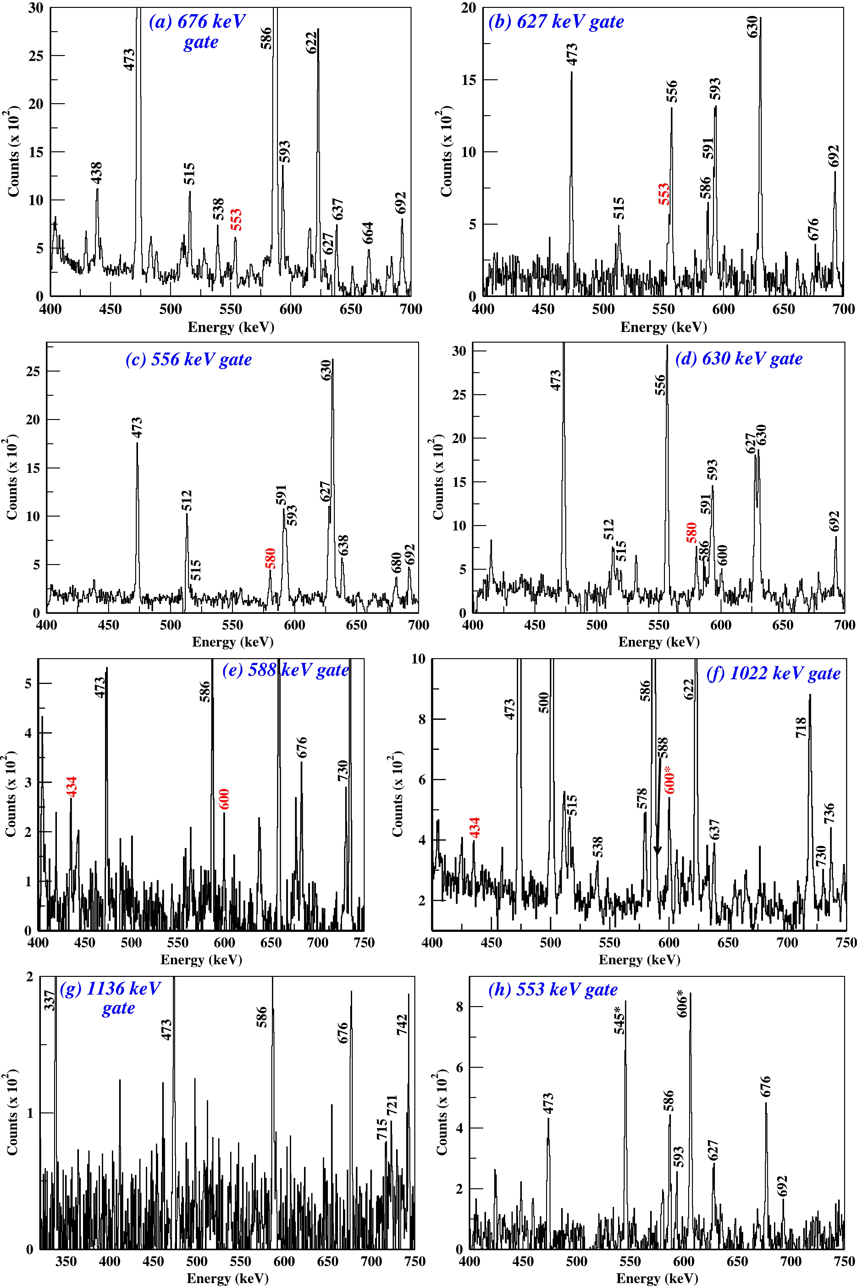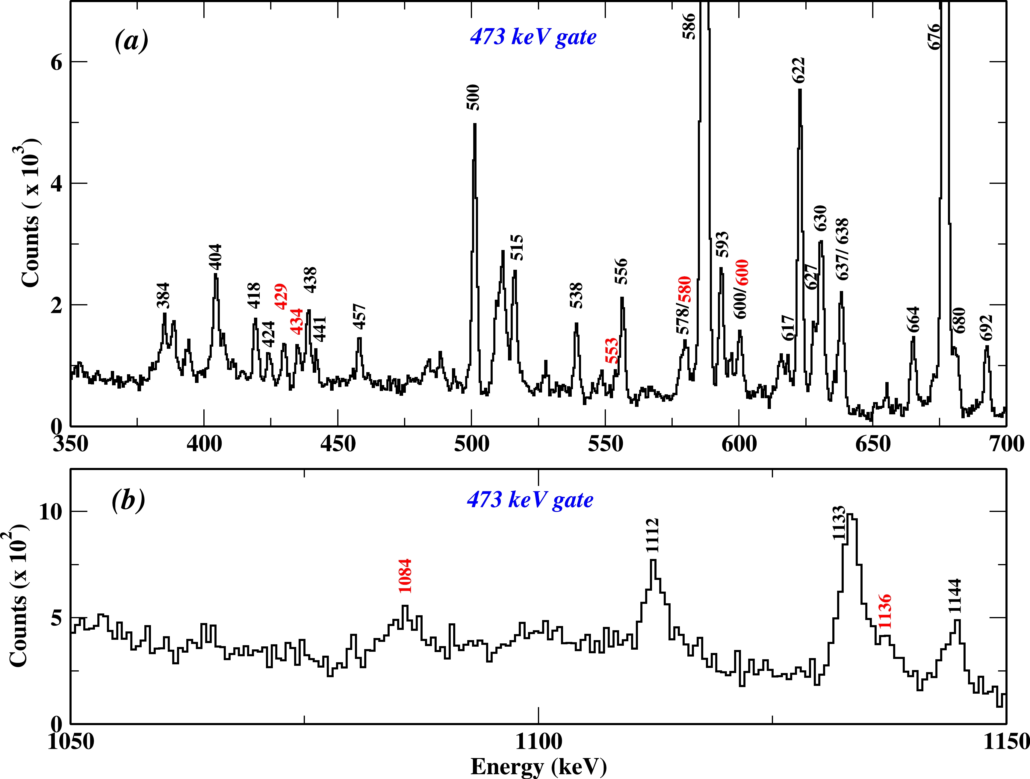 Offline data analysis was carried out using the INGAsort [16] and RADWARE [17] software packages. For the analysis, all the detectors were properly gain-matched using the INGAsort software, and the necessary numbers of symmetric and asymmetric matrices were constructed. To determine the spin of an excited state, the multipolarities of the γ-ray transitions were determined via angular correlation analysis by using the directional correlation of oriented states (DCO) ratio [18]. This method is based on the analysis of the anisotropic distribution of the emitted γ-rays, which depends on the multipolarity of the transition. For the DCO ratio, an asymmetric γ-γ coincidence matrix was constructed using coincidence events registered by detectors placed at 90