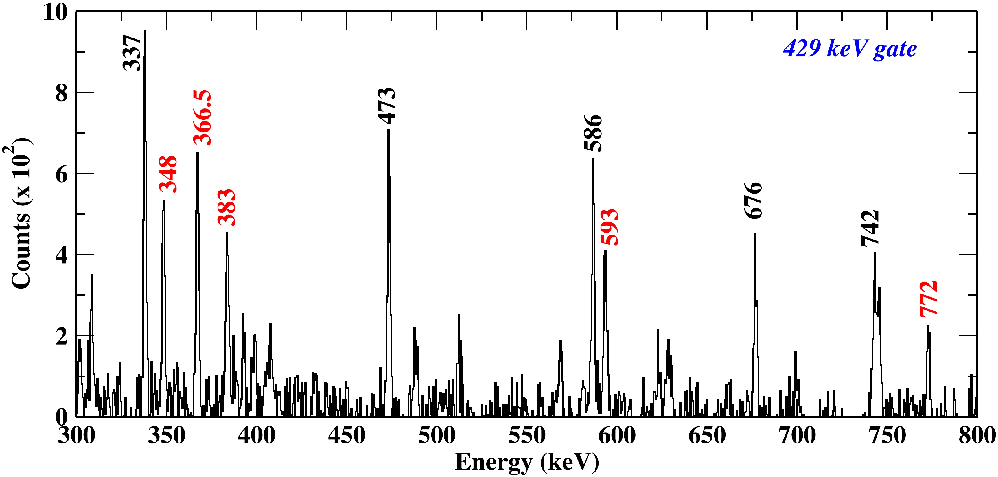 $ ^{118} $ Xe has been modified in the present work by placing seven new γ-transitions based on the γ-γ coincidence and intensity relationship, as shown in Fig. 3. Most of the γ-transitions presented in this level scheme were reported in Ref. [10]. This study revisits all the excited states populated, and all the previous placements were either confirmed or updated according to the γ-γ coincidence and intensity relationship. The experimental results obtained in the present work are summarized in Table 1. The measured relative intensities of the γ rays from the single-gated spectra were normalized for the 337-keV transition. Relevant energy gated spectra in support of the present γ-transition placement are presented in Figs. 4, 5, and 6. These spectra show the previously reported γ rays in$ ^{118} $ Xe [8−10] along with the newly observed γ rays. All the new γ rays belonging to$ ^{118} $ Xe have been observed in the low lying 473 keV energy gated spectrum shown in Fig. 4. Moreover, observation of these γ rays in all other coincidence γ-spectra shown in Figs. 5(a)−(e), confirms the placement. Figure 6 shows the self-gated 429 keV spectra, which support our tentative placement of the transition in the level-scheme.