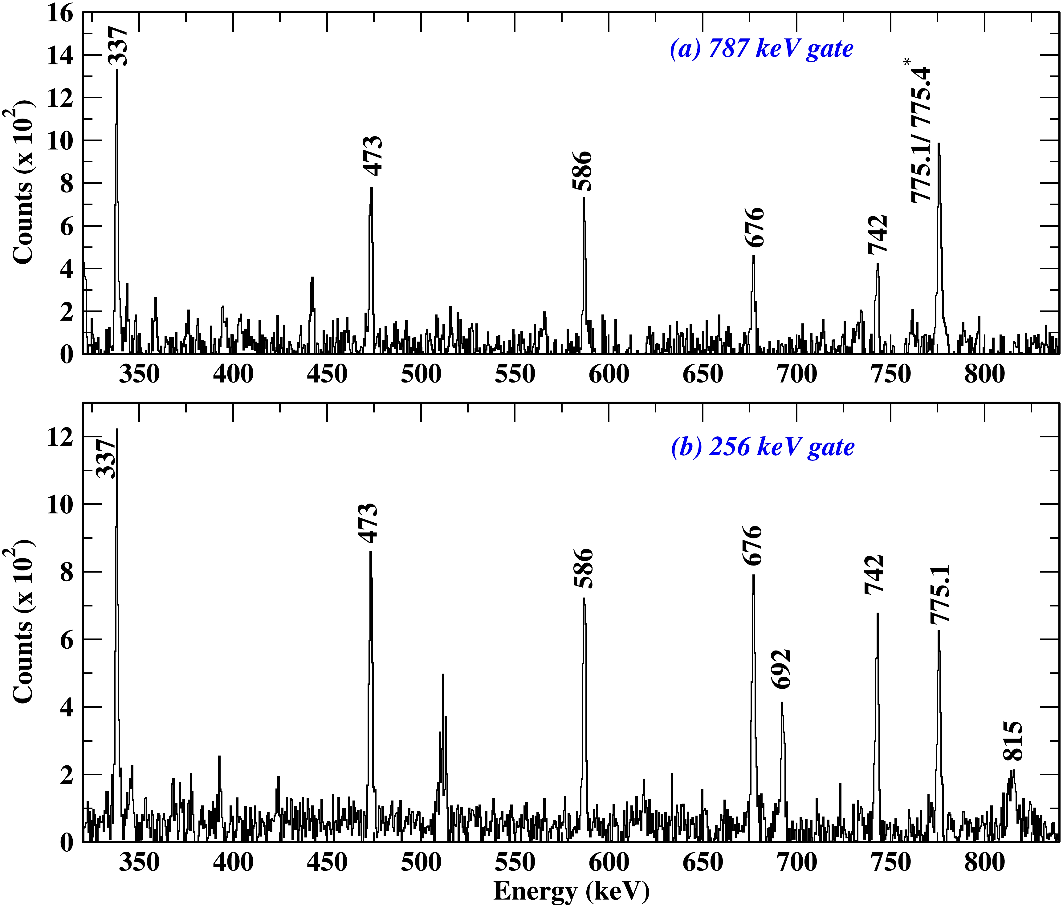 $ ^{\circ} $ and 148$ ^{\circ} $ with respect to the beam direction. The anisotropic intensity ratio of two mutually coincident gamma-ray transitions can be evaluated using the formula$ R_{\rm DCO} = \frac{I_{\gamma_{1}} ~ {\rm at} ~ 148^\circ ~{\rm gated ~ by}~ \gamma_{2} ~ {\rm at} ~ 90^\circ }{I_{\gamma_{1}} ~ {\rm at}~ 90^\circ ~ {\rm gated ~ by} ~ \gamma_{2} ~ {\rm at} ~ 148^\circ } $