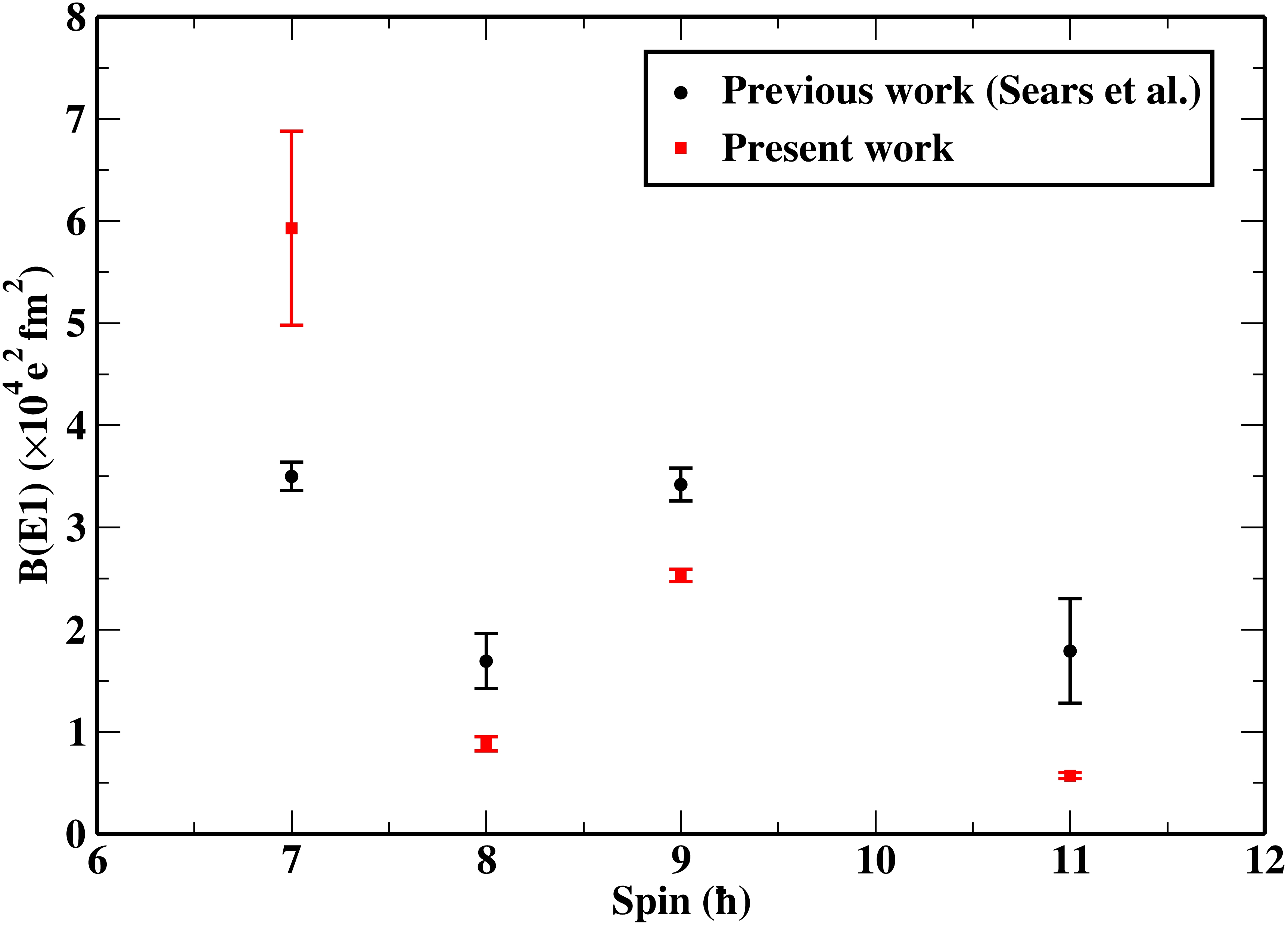 Figure 8. (color online) B(E1) transition strengths obtained in the present work compared with those reported in the previous work [10]. More precise data on B(E1) values are presented in the present work barring the B(E1) value at I = 7