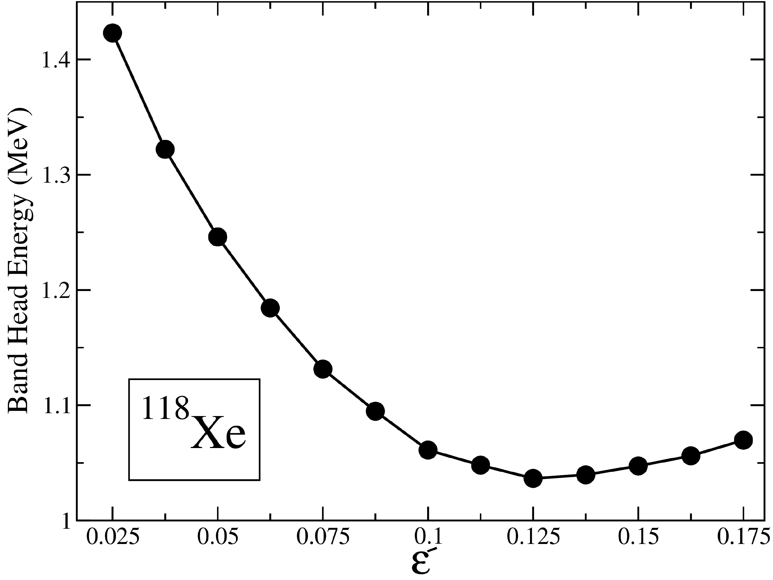 $ \epsilon' $ for the$ ^{118} $ Xe nucleus.In the second stage of the TPSM study, the projected states are generated by using the three-dimensional angular-momentum projection technique. In the third and final stage, the projected basis is used to diagonalise the shell model Hamiltonian consisting of pairing plus quadrupole-quadrupole interaction terms. Details on the technical aspects of the model can be found in our previous publications [32−35]