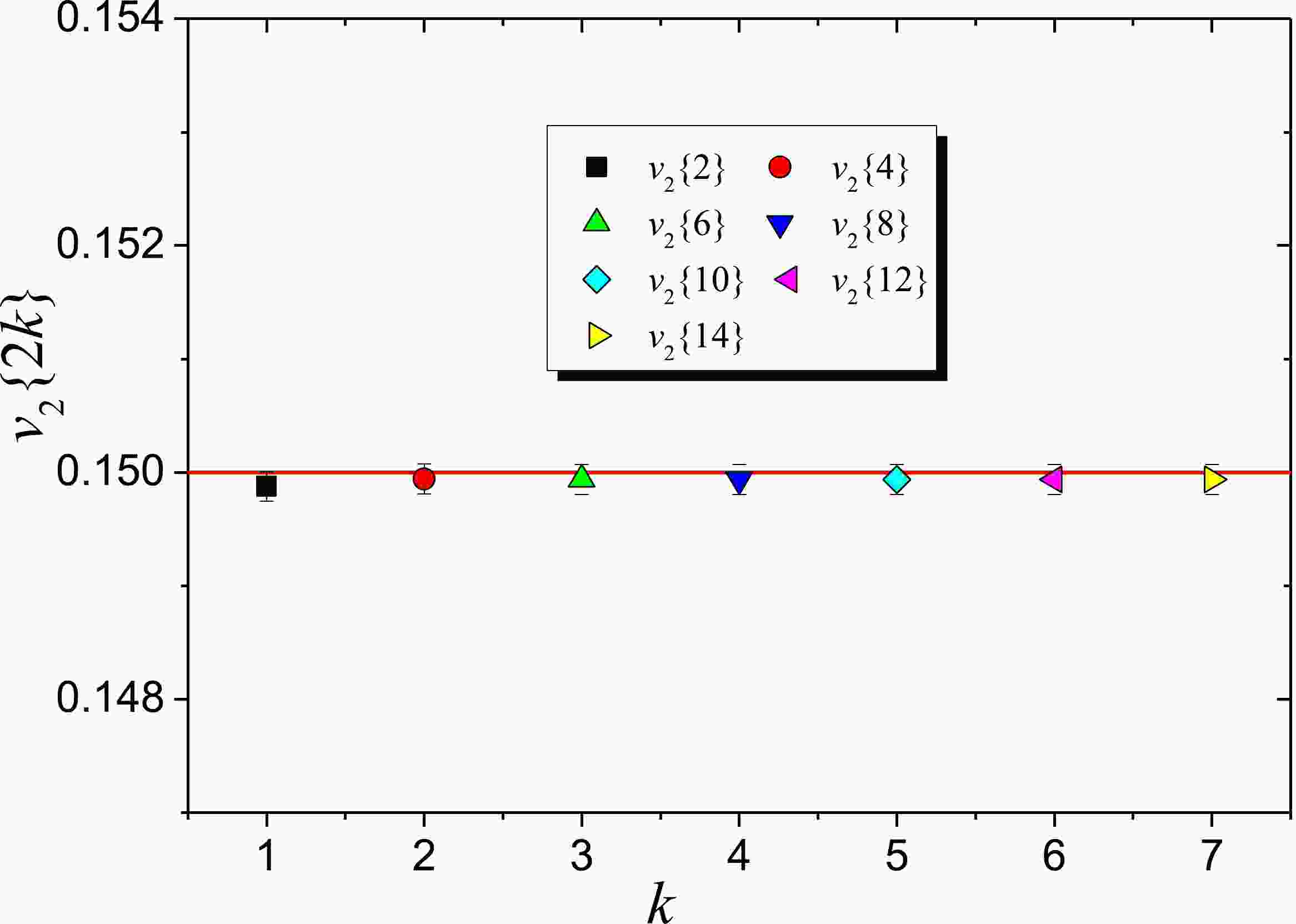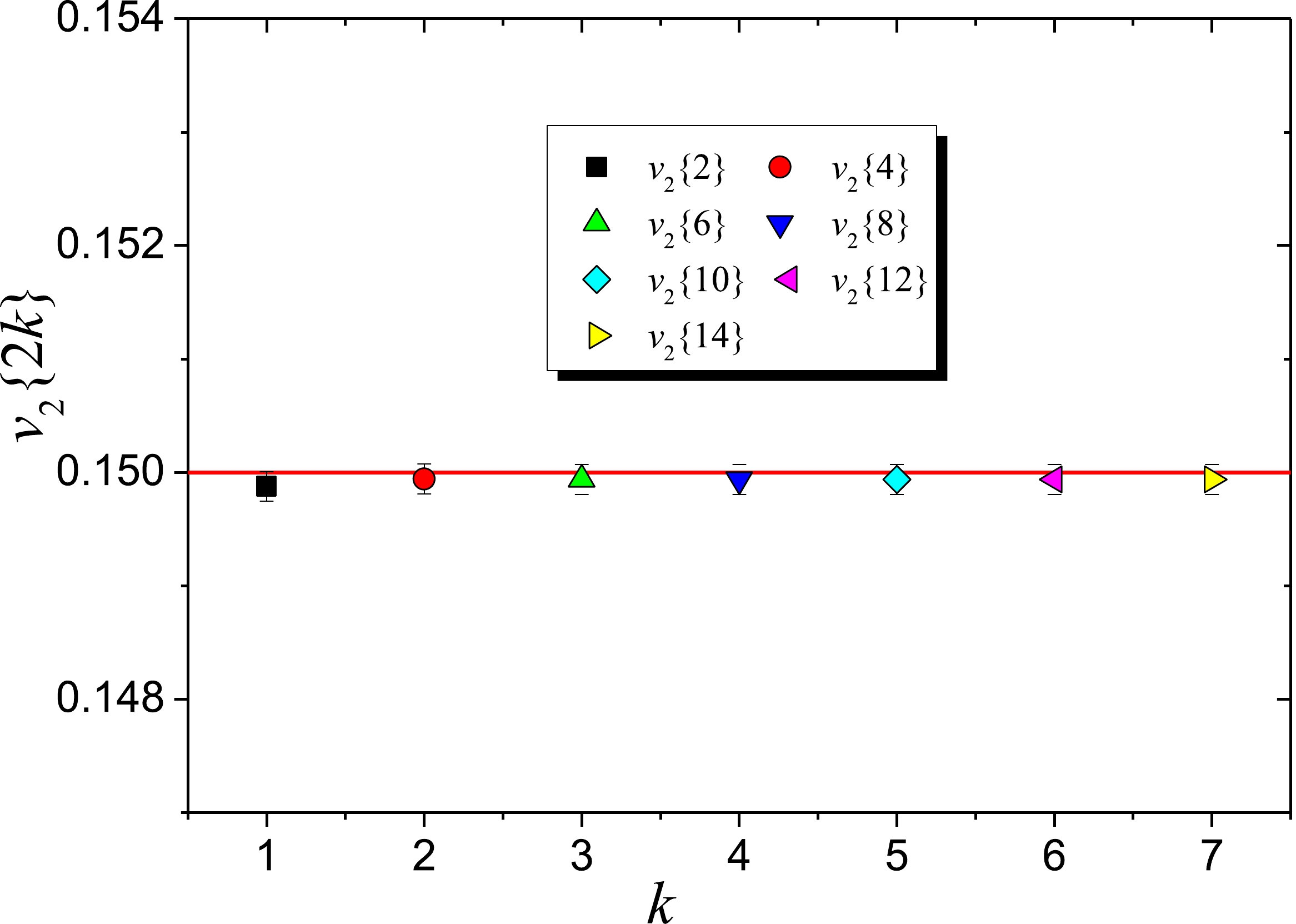 $ \left\langle {2m} \right\rangle $ ,$ \sum\limits_{{j_1} \ne \ldots \ne {j_{2m}} = 1}^M {{{\text{e}}^{in\left( {{\varphi _{{j_1}}} + \ldots + {\varphi _{{j_m}}} - {\varphi _{{j_{m + 1}}}} - \ldots - {\varphi _{{j_{2m}}}}} \right)}}} \equiv {P_{M,2m}} \cdot \left\langle {2m} \right\rangle , $