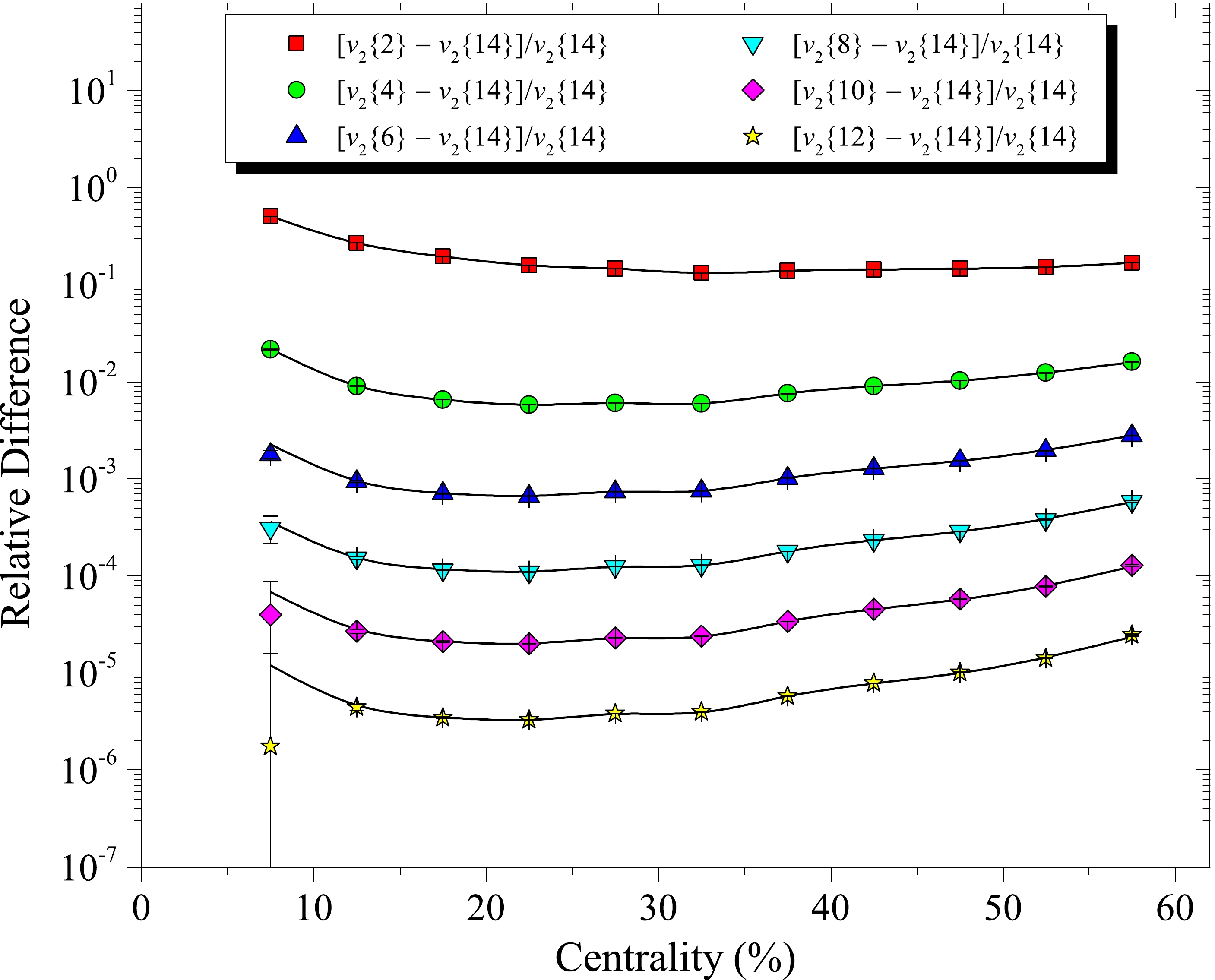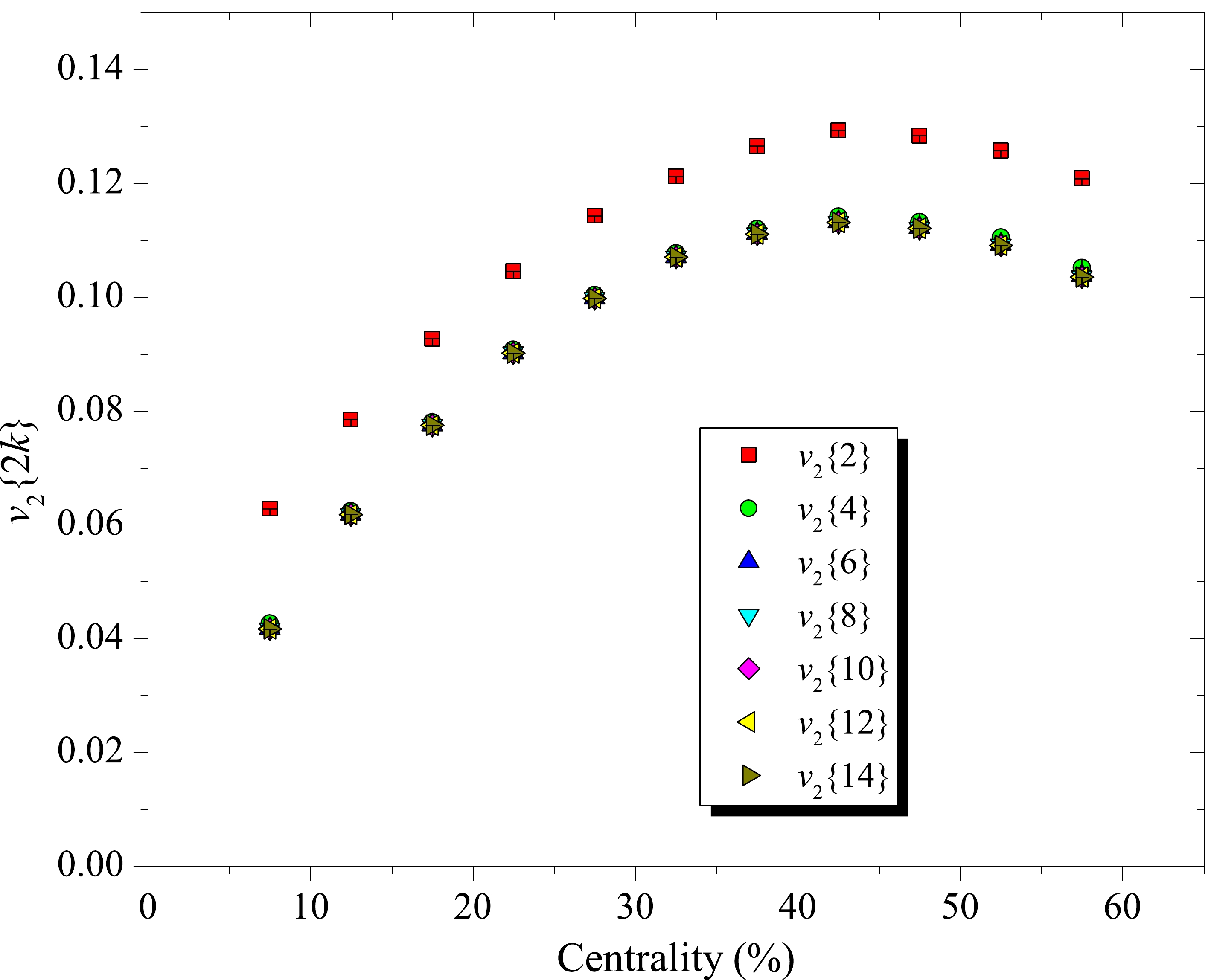 The general formalism of cumulants, for the purpose of flow measurements, was first used in Refs. [12−14], in which cumulants were expressed in terms of the moments of the magnitude of the corresponding flow vector. Such a cumulant method is systematically biased owing to the trivial effects of same particle autocorrelations. To avoid the computationally expensive “nested loops” used to remove autocorrelations in the measurements of multi-particle azimuthal correlations, Refs. [12−14] proposed an alternative method based on the use of generating functions. An improved cumulant method, Q-cumulants [14], allows, in principle, for fast and exact calculation of all multi-particle cumulants. However, in practice, the determination of the analytical expressions for multi-particle cumulants, which involve the azimuthal correlations of more than eight particles, is challenging.