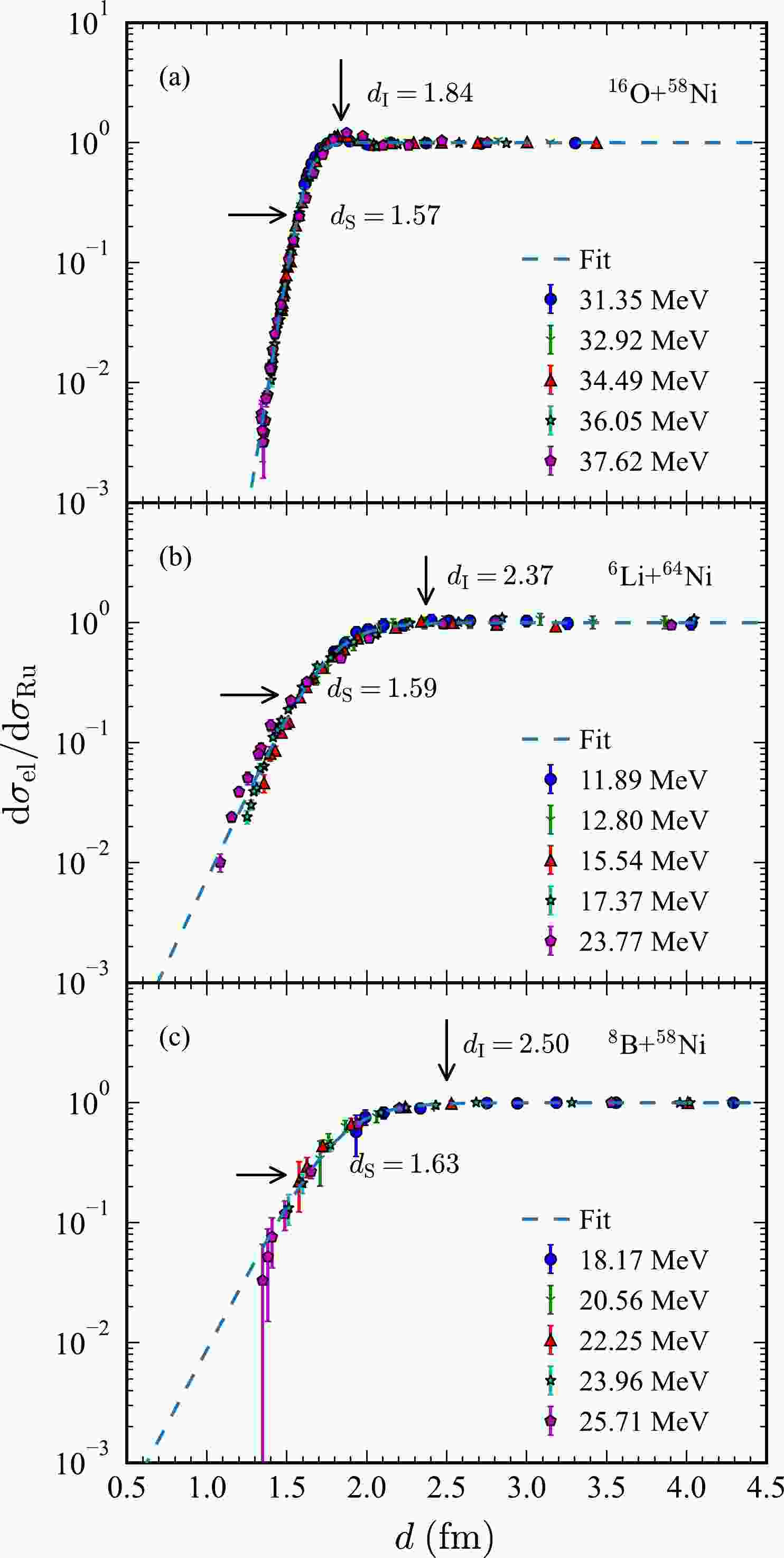 Figure 1.  (color online) Ratio of the elastic cross section to the Rutherford value $ \mathrm{d} \sigma_\mathrm{el}/\mathrm{d} \sigma_\mathrm{Ru} $ as a function of the reduced distance of closest approach d for $ ^{16} $O+$ ^{58} $Ni [57], $ ^{6} $Li+$ ^{64} $Ni [37], and $ ^{8} $B+$ ^{58} $Ni [38] at the corresponding energy. Theoretical fitting is shown by the dashed line. $ d_\mathrm{S} $ and $ d_\mathrm{I} $ are indicated for reference.