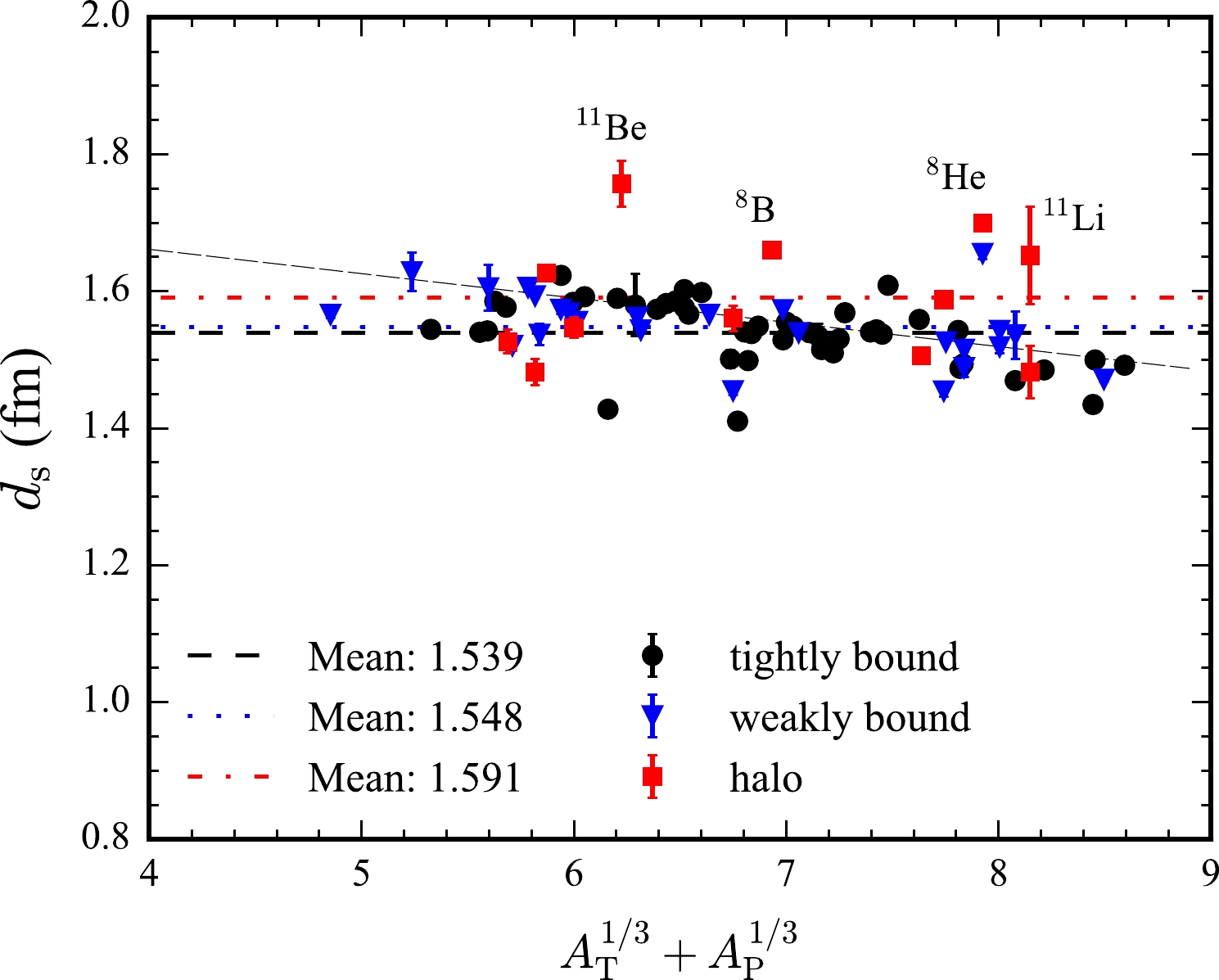 Figure 2.  (color online) Reduced strong absorption distance $ d_\mathrm{S} $ as a function of the system size $ A_\mathrm{T}^{1/3}+A_\mathrm{P}^{1/3} $. The solid circles, triangles, and squares represent the tightly bound, weakly bound, and halo projectiles, respectively. The mean values of $ d_\mathrm{S} $ for these three types are shown as dashed, dotted, and solid lines for reference. Linear fitting of all the scatter points is shown as the densely dashed line.