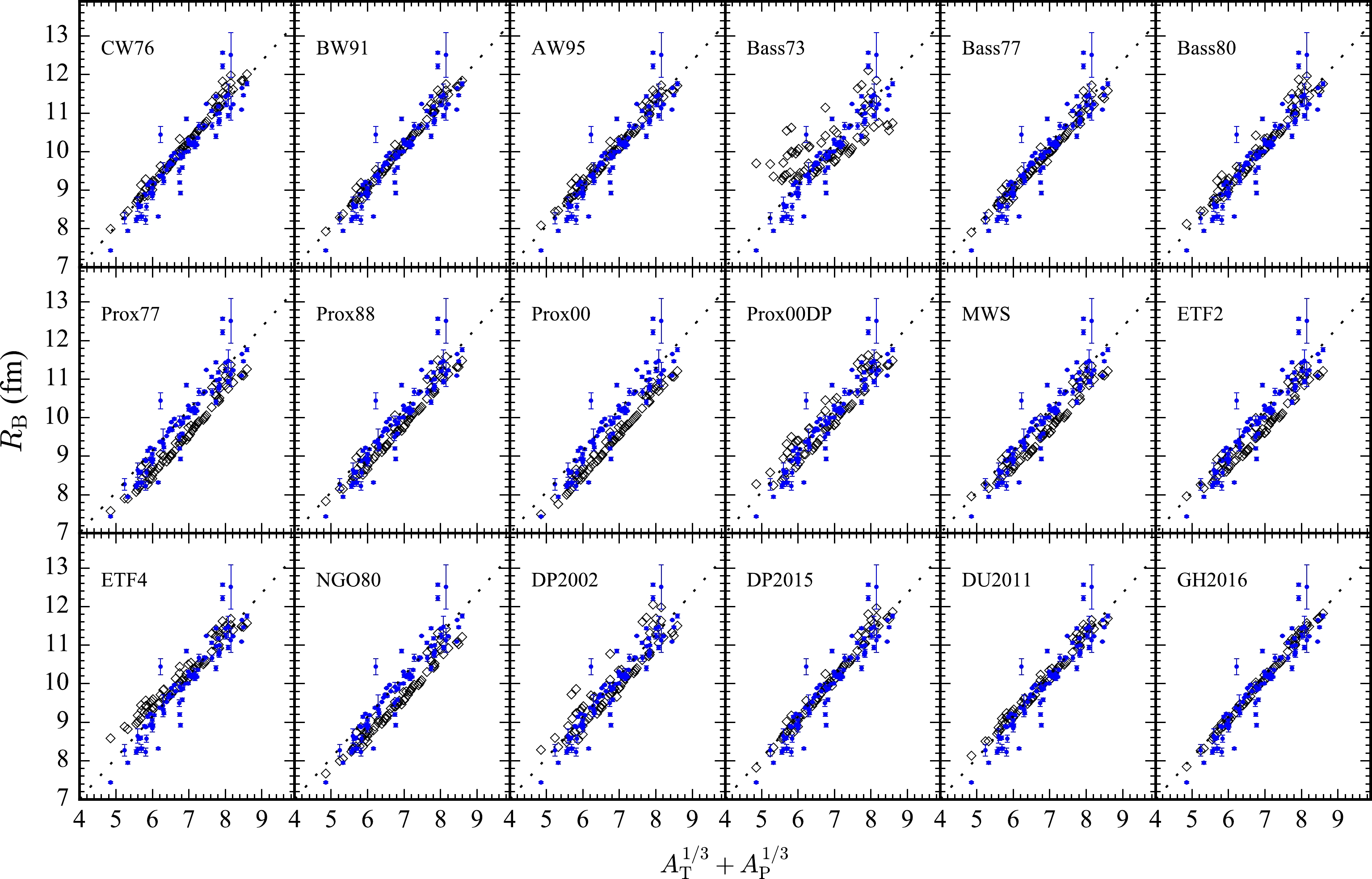 This means that we can estimate the barrier radius $ R_\mathrm{B} $ based on the extracted grazing distance $ R_\mathrm{S} $ from the quarter-point recipe. This formula is model dependent on $ R_{\rm B}^{\rm CW76} $ in Eq. (6). In Fig. 5, we show a comparison of the formula $ R_{\rm S}^{\rm Emp} $ and $ R_{\rm B}^{\rm CW76} $ and those predicted by the 18 potential models: CW76 [16], BW91 [64], AW95 [65], Bass73 [66], Bass77 [67], Bass80 [19], Prox77 [68], Prox88 [69], Prox00 [70], Prox00DP [71], MWS [72], ETF2 [73], ETF4 [74], NGO80 [75], DP2002 [76], DP2015 [60], DU2011 [77], and GH2016 [78]. We can see that $ R_{\rm B}^{\rm CW76} $ and $ R_{\rm S}^{\rm Emp} $ are in agreement with many models, including BW91, AW95, Bass80, DU2011, GH2016, and especially the sophisticated DP2015 potential. This agreement may increase the credibility of Eq. (7).
