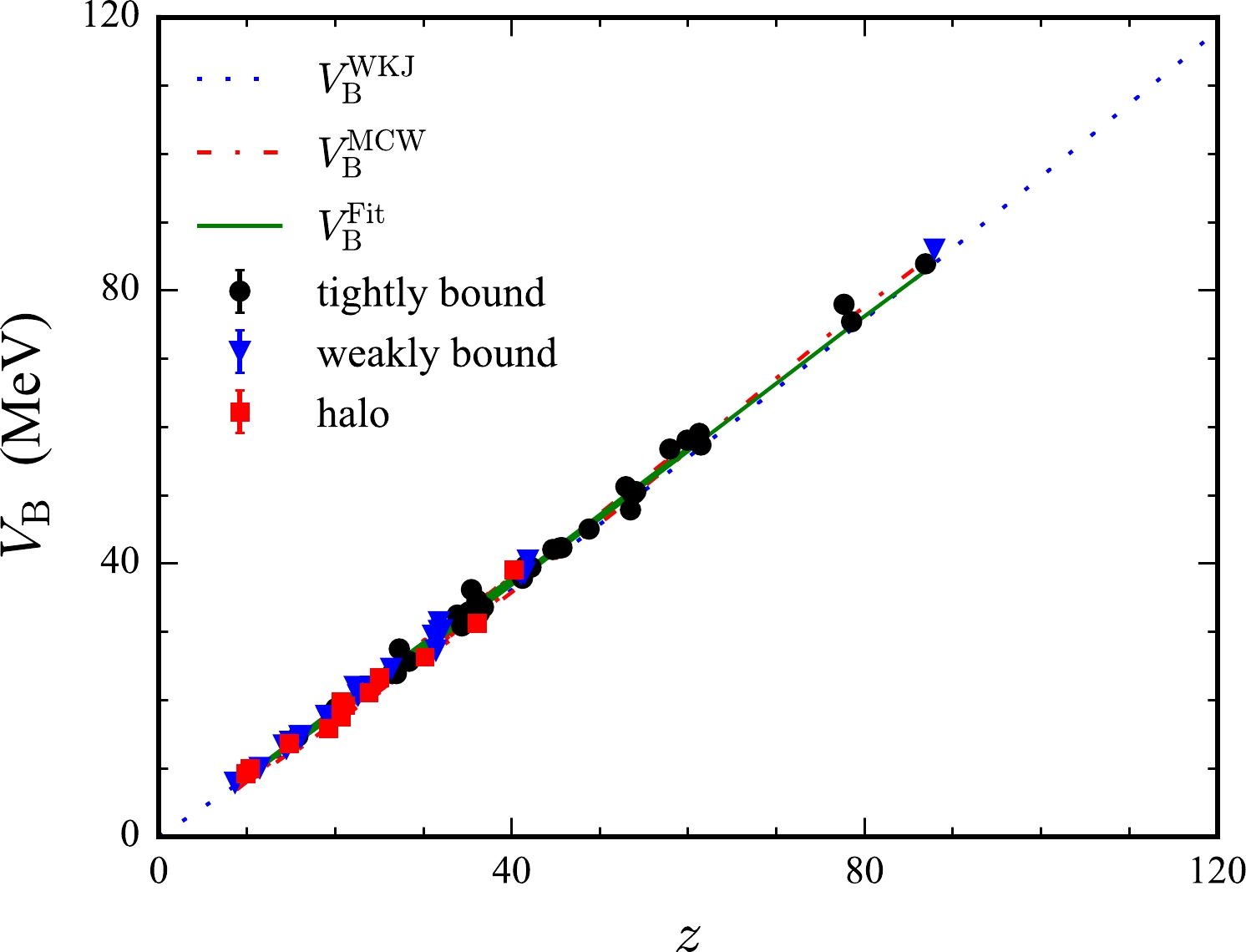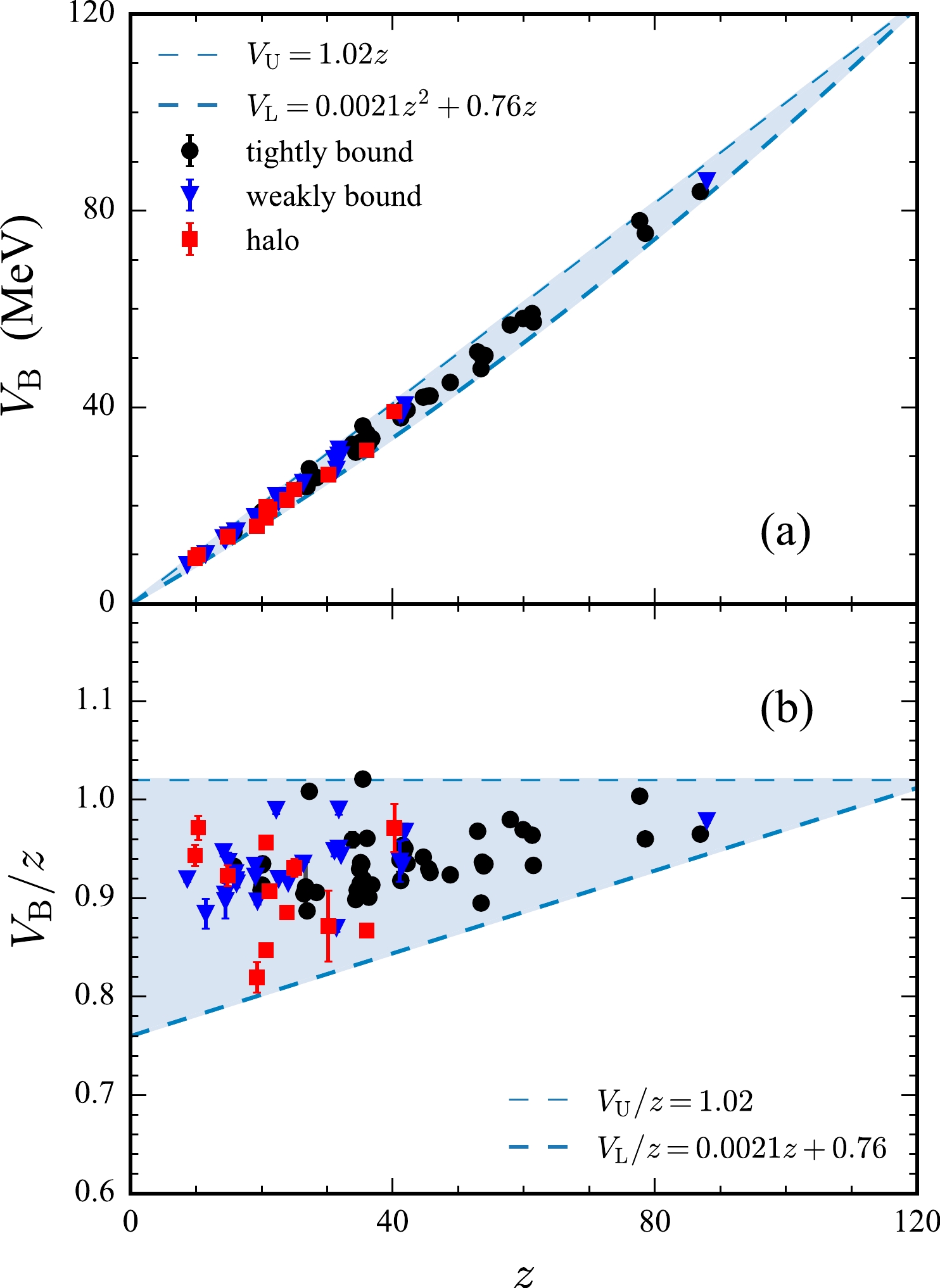 Figure 7.  (color online) Coulomb barrier height $ V_\mathrm{B} $ (a) and $ V_\mathrm{B}/z $ (b) with respect to the Coulomb parameter z. The solid circles, triangles, and squares represent the results based on Eq. (8) for three groups of reactions: tightly bound, weakly bound, and halo projectiles, respectively. The thick and thin dashed lines are the approximate lower $ V_\mathrm{L} $ and upper boundaries $ V_\mathrm{U} $ of the scatter region, the formulas of which are shown in the legends.