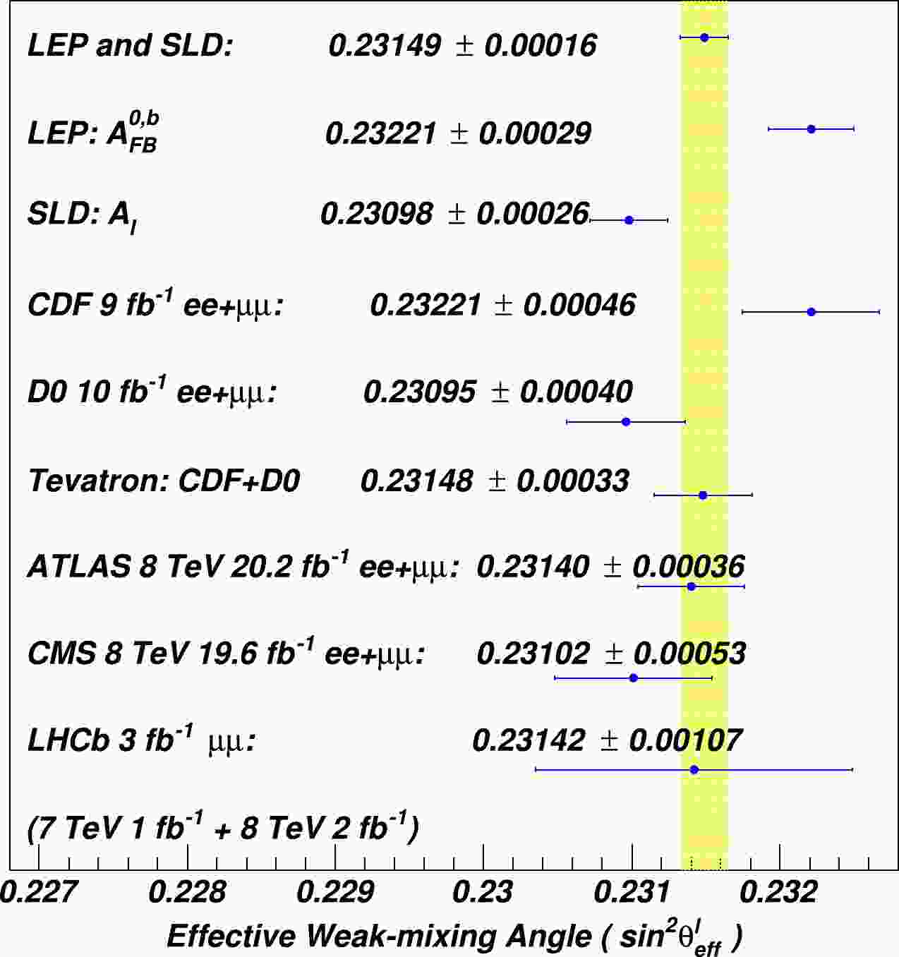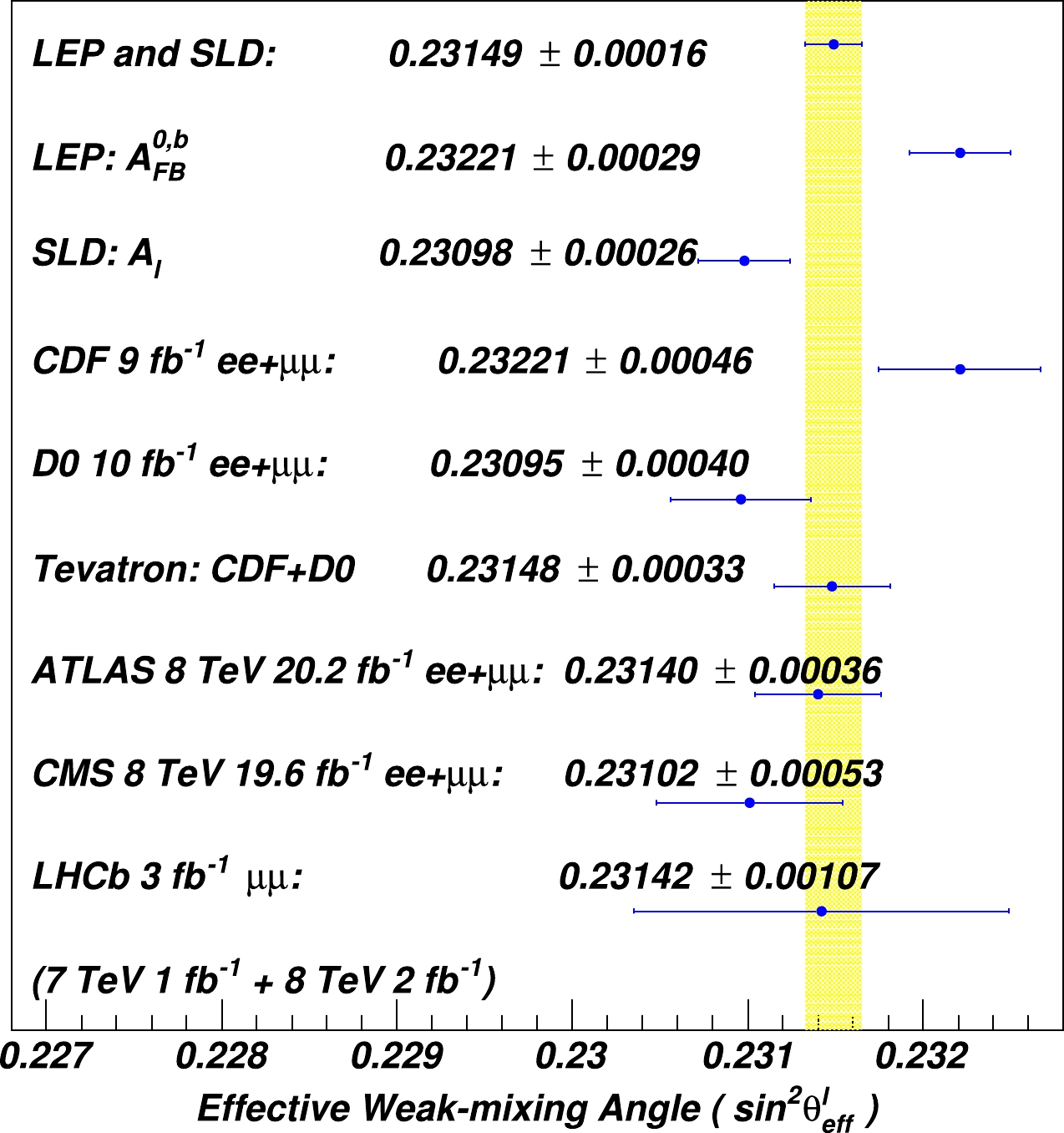 $ {\sin^2\theta_{\text{eff}}^{{ \ell }}} $ from LEP, SLD, Tevatron, and LHC.Previous measurements achieved a relative precision at