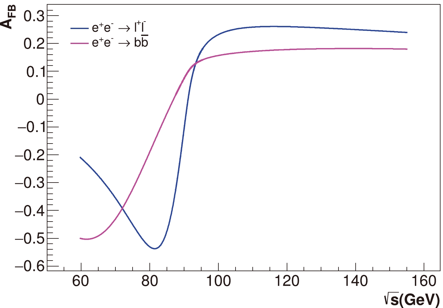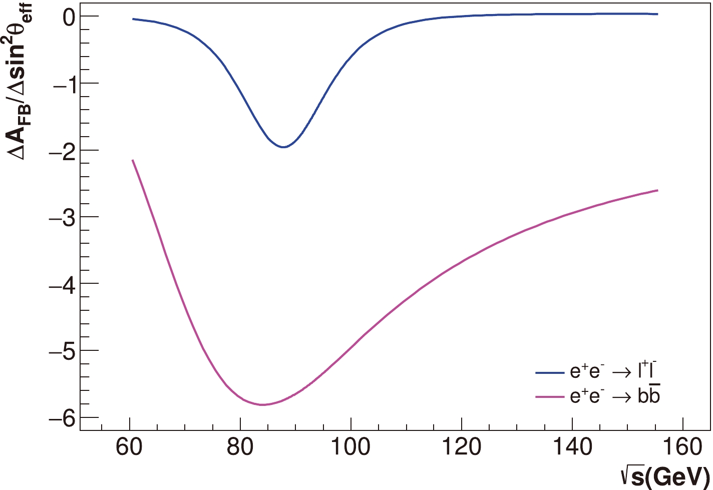 $ \sqrt{s} $ in Fig. 3 for b quark and lepton productions as an example. Predictions are calculated using zfitter as well. In the following sections, we estimate the uncertainty of$ {\sin^2\theta_{\text{eff}}^{{ \ell }}} $ based on the sensitivity S of$ A_{FB} $ to$ {\sin^2\theta_{\text{eff}}^{{ \ell }}} $ . -