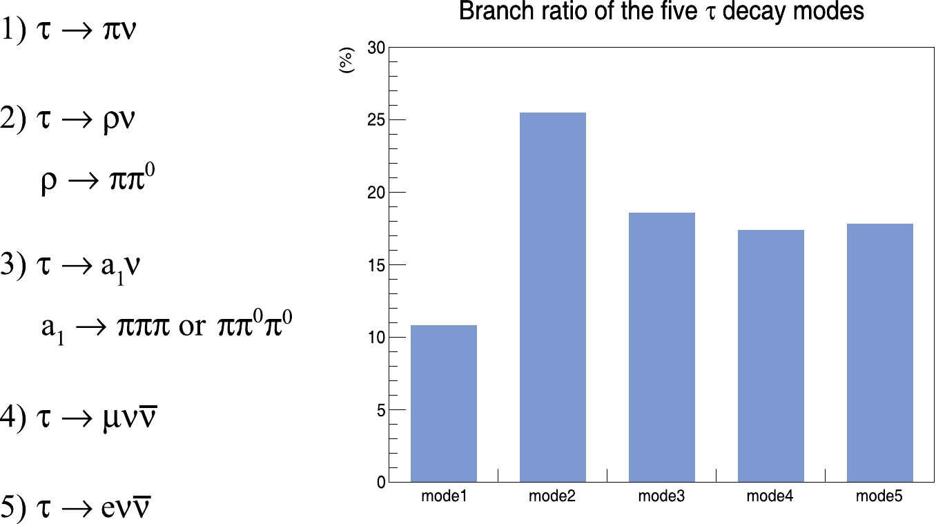 Figure 5. (color online) Kinematic spectrum of different tau decay modes. The red solid line and blue dashed line represent the kinematic spectrum of taus with