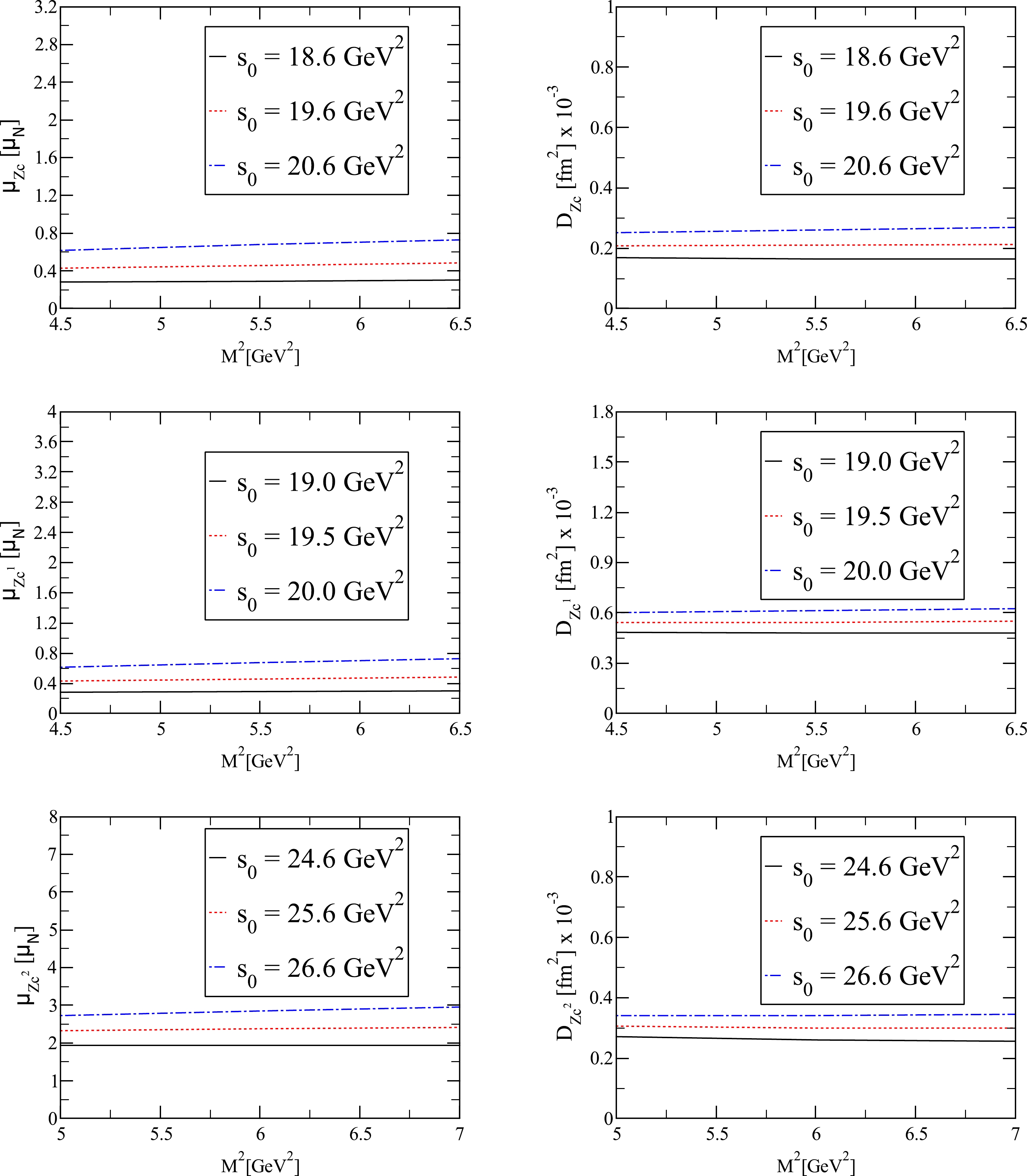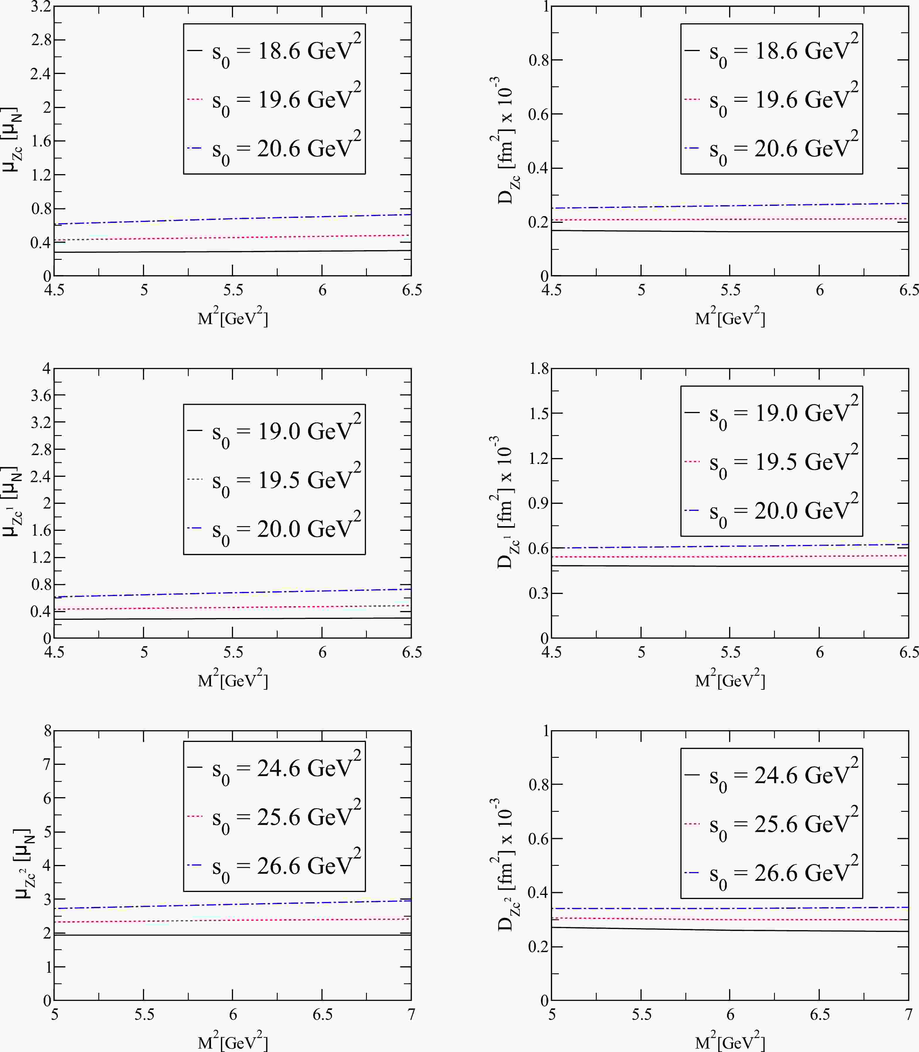 This section contains a numerical analysis of the magnetic and quadrupole moments of the $ Z_c $ states. The following QCD parameters are used in our calculations:$ m_u=m_d=0 $ ,$ m_c = (1.27\pm 0.02)\, $ GeV,$ m_{Z_c}= 4024.1 \pm 1.9 $ MeV [48],$ m_{Z_c^1}= 4051 \pm 14 ^{+20}_{-41} $ MeV [48],$ m_{Z_c^2}= 4600 $ MeV [12],$ \langle \bar uu\rangle $ =$ \langle \bar dd\rangle $ =$ (-0.24\pm 0.01)^3\, $ GeV$ ^3 $ [49],$ \langle g_s^2G^2\rangle = 0.88\; $ GeV$ ^4 $ [50], and$ f_{3\gamma}=-0.0039\; $ GeV$ ^2 $ [45]. From Eqs. (21)−(23), it follows that for the determination of magnetic and quadrupole moments, the residues of the$ Z_c $ states are needed. These residues are calculated in Ref. [51], and the values are obtained as$ \lambda_{Z_c}= (6.09 \pm 0.90)\times 10^{-2} $ GeV$ ^5 $ ,$ \lambda_{Z_c^1}= (3.67 \pm 0.67)\times 10^{-2} $ GeV$ ^5 $ , and$ \lambda_{Z_c^2}= (1.18 \pm 0.21)\times 10^{-1} $ GeV5. The photon DAs are one of the main non-perturbative inputs of the QCD light-cone sum rules. A comprehensive analysis of the photon DAs was conducted in Ref. [45]. For completeness, the parameters used in the photon DAs are presented in Appendix B.The sum rules also depend on the helping parameters, as mentioned in the previous section, that is, the Borel mass square parameter $ M^2 $ and continuum threshold$ s_0 $ . The physical observables, namely, the magnetic and quadrupole moments, should be independent of these parameters. Therefore, we search for the working regions of these additional parameters in such a way that, in these regions, the magnetic and quadrupole moments are nearly independent of these parameters. In determining the working regions of the parameters$ M^2 $ and$ s_0 $ , the standard prescription of the technique used, operator product expansion (OPE) convergence, and pole contribution (PC) dominance are considered. To characterize the above constraints, it is convenient to use the following equations:$ \rm{PC} =\frac{\Delta (M^2,s_0)}{\Delta (M^2,\infty)} \geq 30{\text%}, $  (24) and $ \rm{OPE Convergence} =\frac{\Delta^{\rm{Dim7}} (M^2,s_0)}{\Delta (M^2,s_0)}\leq 5{\text%}, $  (25) where $ \Delta^{\rm{Dim7}} (M^2,s_0) $ represents the contribution of the highest dimensional term in OPE. The OPE convergence and PC values for each state, along with the working regions acquired for$ M^2 $ and$ s_0 $ , considering the above restrictions are presented in Table 1. From the values given in Table 1, we find that the working regions determined for$ M^2 $ and$ s_0 $ meet the above requirements. Having determined the working regions of$ M^2 $ and$ s_0 $ , we now study the dependence of magnetic and quadrupole moments on$ M^2 $ at several fixed values of$ s_0 $ . From Fig. 1, we notice that magnetic and quadrupole moments represent good stability regarding the variation in$ M^2 $ in its working region.State $ s_0 $ /GeV2  $ M^2 $ /GeV2  PC (%) OPE Convergence (%) $ Z_c(4020)^+ $   $ 18.6-20.6 $   $ 4.5-6.5 $   $ 34-60 $   $ 2.8 $   $ Z_c(4050)^+ $   $ 19.0-20.0 $   $ 4.5-6.5 $   $ 31-57 $   $ 3.2 $   $ Z_c(4600)^+ $   $ 24.6-26.6 $   $ 5.0-7.0 $   $ 33-60 $   $ 3.0 $   Table 1. Working windows of $ s_0 $ and$ M^2 $ , along with the PC and OPE convergence, for the magnetic and quadrupole moments of hidden-charm tetraquark states.  Figure 1. (color online) Dependencies of the magnetic and quadrupole moments of hidden-charm tetraquark states on $ M^{2} $ at three different values of$ s_0 $ .Our final results for the magnetic and quadrupole moments of the $ Z_{c}(4020)^+ $ ,$ Z_{c}(4050)^+ $ , and$ Z_{c}(4600)^{+} $ states are presented in Table 2. The uncertainties result from the variation in the Borel parameter$ M^{2} $ and continuum threshold$ s_0 $ as well as from the input parameters. The magnitude of the numerical results of the magnetic moments also allows them to be measured experimentally. The magnetic moments of these states are sufficiently large to be measured in future experiments by examining the magnetic moment results. We obtain a non-zero, but small, value for the quadrupole moments of the$ Z_c $ states, which represents a non-spherical charge distribution. The sign of the quadrupole moments is positive for the$ Z_c $ tetraquark states, which corresponds to prolate charge distributions.State $ \mu_{Z_c} $ /  $\mathrm {\mu_N}$   $\mathcal{D}_{Z_c}/\rm{fm}^2 \times 10^{-3}$   $ Z_c(4020)^+ $   $ 0.50 ^{+0.22}_{-0.22} $   $ 0.20 ^{+0.05}_{-0.04} $   $ Z_c(4050)^+ $   $ 1.22 ^{+0.34}_{-0.32} $   $ 0.57 ^{+0.07}_{-0.08} $   $ Z_c(4600)^+ $   $ 2.40 ^{+0.53}_{-0.48} $   $ 0.30 ^{+0.05}_{-0.04} $   Table 2. Results of the magnetic and quadrupole moments of hidden-charm tetraquark states. Before concluding this section, we must remark on the measurement of the magnetic moments of unstable hadrons. The short lifetimes of the $ Z_{c} $ states make it difficult to measure the magnetic moment at current experimental facilities. However, the accumulation of more data from different experiments may make this possible in the future. The$ \Delta^+(1232) $ baryon also has a very short lifetime; however, its magnetic moment is obtained from experimental data on the$ \gamma N \rightarrow \Delta \rightarrow \Delta \gamma \rightarrow \pi N \gamma $ process [52−54]. Therefore, a technique for the determination of the magnetic and higher multipole moments is based on the soft photon emission of hadrons. This technique is recommended in Ref. [55]. The photon also carries information about the magnetic and higher multipole moments of the emitted hadron. The radiative transition matrix element with respect to the energy of the photon can be described as$ \begin{array}{*{20}{l}} M \sim A\,(E_\gamma)^{-1} + B\,(E_\gamma)^0 + C\, E_\gamma +\cdots \,, \end{array} $  (26) where $ E_\gamma $ is the energy of the photon. The electric charge contributes to the amplitude in the order of$ (E_\gamma)^{-1} $ , whereas the magnetic moment contribution is defined by the term$ (E_\gamma)^0 $ . Thus, the 
