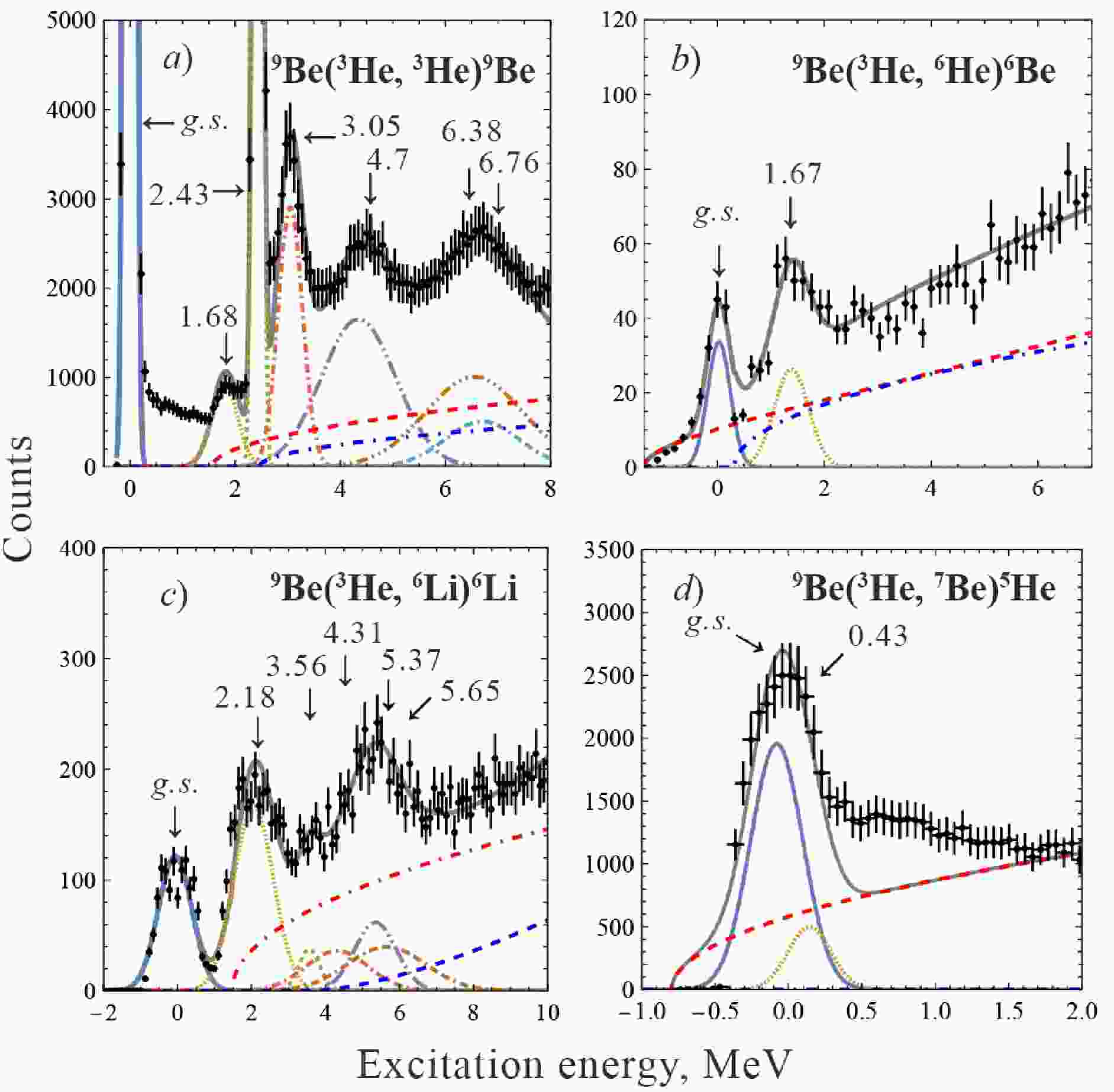 The experiment on the nuclear reaction 3He and 9Be at a laboratory energy of 30 MeV was conducted at the Nuclear Physics Institute (NPI), Řež, Czech Republic. During the course of the experiment, an average beam current was maintained at 10 enA. The self-supporting 9Be target with a thickness of 11 $ \mu\rm{m} $ was developed with a foil, which was highly purified up to 99%. The resonances of the contamination by the carbon and oxygen isotopes were not detected in the energy spectra.Particle identification was based on the $ \Delta E $ -E method, i.e. measurements of the energy-loss$ \Delta E $ and residual energy$ E_r $ . Four Si-Si(Li) telescopes consisting of detectors$ \Delta E_0 $ ,$ \Delta E $ , and$ E_r $ were mounted to register scattered ions with the thicknesses of 10 μm, 100 μm, and 3 mm, respectively. The acceptance angle of each telescope was$ \sim 0.6^\circ $ in the scattering plane, and their solid angle was$ \sim 0.2 $ msr. The good energy resolutions of both$ \Delta E $ and$ E_r $ detectors provided unambiguous identification of A and Z of each product. The over-all energy resolution was 150 – 200 keV.The excitation energy spectra for 9Be, 6Be, 6Li, and 5He are shown in Fig. 1. The ground and excited states of the nuclei 9Be, 6Be, 6Li, and 5He were identified in the following reaction channels: 9Be (3He, 3He) 9Be (see panel a), 9Be (3He, 6He) 6Be (b), 9Be (3He, 6Li) 6Li (c), and 9Be (3He, 7Be) 5He (d). The energy calibration of $ \Delta Es $ and$ E_r $ detectors was performed considering well-known states, which are strongly excited in the spectra. The calibration appeared to be practically linear. This allows us to determine the positions of all excited states in the spectra. The total energies were calculated as the sum over the calibrated energy losses$ \Delta E_s $ and the residual energy$ E_r $ . The excitation energy spectra were constructed as$ E_{g.s} $ (position) -$E_{\rm total}$ .  Figure 1. (color online) Excitation energy spectra of $ ^9 $ Be (a),$ ^6 $ Be (b),$ ^6 $ Li (c), and$ ^5 $ He (d) for the nuclear reaction$ ^3 $ He$ + ^9 $ Be at$E_{\rm lab}=30$ MeV measured at$\theta_{\rm lab}$ =$ 12^\circ $ . The total fit for each spectrum and subtracted peaks are shown. The background was fitted considering the three-body and four-body breakup processes (For more information, please refer to the text).The peaks were identified using a fitting procedure that employs standard Gaussian decomposition. Utilizing the established energy calibration, the positions and widths of the peaks were fixed in line with widely recognized experimental data. It is important to note that the width of each state in the spectrum may encompass several factors: the natural width, apparatus width of the set-up, and energy spread. The latter is caused by the emitting particles, which may originate either at the beginning or at the end of the target foil. Additionally, the background areas are delineated in Fig. 1. They are mainly due to the phase volumes which depend on the threshold energy in the following break-up processes: ● 9Be $ \rightarrow $ 8Be + n (see Fig. 1, panel a, red dashed curve) or$ ^4\rm{He} $ + 5He (a, blue dot-dashed);● 6Be $ \rightarrow $ 4He + 2p (b, red dashed) or$ ^5\rm{Li} $ + p (b, blue dot-dashed);● 6Li $ \rightarrow $ 4He+ d (c, red dot-dashed) or$ ^4\rm{He} $ + p + n (c, blue dashed);● 5He $ \rightarrow $ 4He+ n (d, red dashed).The absolute error in measuring the cross section is confined to no more than 15%. This error predominantly arises from several factors: inaccuracies in peak decomposition, statistical errors in the count of events in the subtracted peak, errors in determining the target's thickness, inaccuracies in solid angle values, event losses, and errors in current measurement.