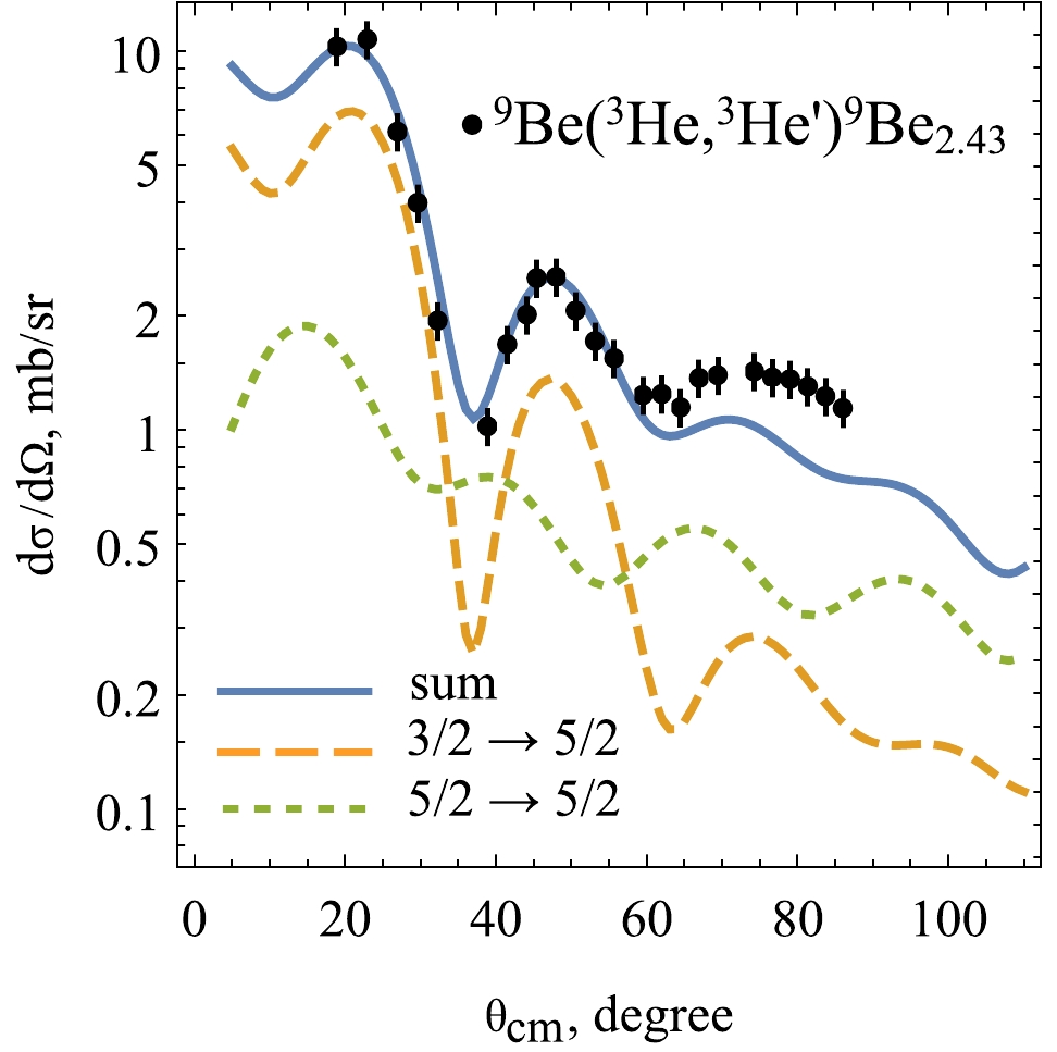 Elastic scattering The differential cross section of the elastic scattering of 3He from the nucleus 9Be was treated within the optical model framework. Numerical calculations were conducted by means of the $\mathrm{FRESCO}$ code [16]. The optical potential used in the OM calculations was considered in the form:$ \begin{array}{*{20}{l}} \begin{array}{l} U(R)=-V(R)-{\rm i}W(R)+V^{SO}(R)( {l} \cdot \sigma)+V^C(R), \end{array} \end{array} $  (1) where R denotes the distance between 3He and 9Be, and $ V^{V}, W^{V} $ denote the real and imaginary volume potential terms, and$ V^{SO} $ and$ V^C $ denote the spin-orbit and Coulomb potentials. The volume potentials may represent the Woods-Saxon (WS) potential [17]:$ V\left( R \right) = V_0^V f_{R_V, a_V} \left( R \right),\; \; \; \; f_{R_0, a_0} \left( R \right) = \left[ 1+ \exp \left( \frac{R-R_0}{a_0} \right) \right]^{-1}, $  (2) where $ V_0 $ denotes the depth of the potential,$ r_0 $ denotes the average distance, and$ a_0 $ denotes the diffusion parameter. The spin-orbit term can be expressed in the following form:$ V^{SO}(R) = V_0^{SO}\left(\frac{\hbar}{m_\pi c}\right)^2 \frac{1}{R} \frac{\rm d}{{\rm d}R} f_{R_{SO} a_{SO}}(R), $  (3) while the Coulomb term was considered as the interaction of a point-charge with a uniformly charged sphere as follows: $ V^C(R)= \left\{ \begin{array}{*{20}{l}} \dfrac{Z_1 Z_2 {\rm e}^2}{2 R_C} \left( 3- \dfrac{R^2}{R_C^2} \right), & {\rm{for}}\;\; R \leq R_C , \\ \dfrac{Z_1 Z_2 {\rm e}^2}{R}, & {\rm{for}}\;\; R > R_C . \end{array} \right. $  (4) As a staring point for the seeking optical potential, we considered global optical parameters from Ref. [18]. The elastic scattering cross section was fitted on the measured experimental data. It was performed via $\mathrm{SFRESCO}$ [16]. The obtained potential parameters are listed in Table 1.$ V_0 $ /MeV  $ r_V^{a)} $ /fm  $ a_V $ /fm  $ W_0 $ /MeV  $ r_W^{a)} $ /fm  $ a_W $ /fm  $ V_{i} $ /MeV  $ r_{i}^{a)} $ /fm  $ a_{i} $ /fm  $ r_C^{a)} $ /fm  3He + 9Be 101.9 0.700 0.777 30.81 0.854 0.817 2.5 $ ^{c)} $   0.708 0.720 0.767 103.9 $ ^{b)} $   23.81 $ ^{b)} $   7Be + 5He 258.516 0.588 0.726 18.0 0.773 0.6 45.4 $ ^{d)} $   0.566 0.843 0.734 6Li + 6Li 114.0 0.64 0.859 45.6 0.831 0.807 0.649 7Li + 5Li 114.0 0.606 0.853 38.448 0.82 0.809 0.588 α + 8Be 121.0 0.252 1.01 17.0 1.38 0.34 0.724 Table 1. Potential parameters used in the optical model and CRC calculations. Given that the spin reorientation is not forbidden, e.g. $ 3/2 \rightarrow 3/2 $ or$ 5/2 \rightarrow 5/2 $ , it was also considered in the CC calculations. The calculated CC results are presented in Fig. 2. Specifically, OM and CC calculations are almost identical. Explicit consideration of the coupling between the inelastic channel and the spin reorientation leads to modifications in the optical potential. Hence, the real part of the optical potential becomes deeper, whereas the depth of the imaginary part decreases (see mOP, Table 1).  Figure 2. (color online) Theoretical cross sections for the elastic scattering $ ^9{\rm Be}(^3{\rm He}, ^3{\rm He})^9{\rm Be} $ in comparison with measured cross section data at${E}_{\rm lab}=$ 30 MeV. Left panel: Calculated cross sections are provided in ratio to the Rutherford scattering and conducted within the coupled channels (CC,$ {\chi}^2 $ = 28.3) and optical model (OM,$ {\chi}^2 $ = 14.85) methods. Right panel: the same CC cross section in absolute unit, but presented in terms of the optical model cross section with modified potential parameters (mOM), the contribution of inelastic channel ($ 5/2 \rightarrow 3/2 $ ) and the spin re-orientation effect (SR).The role of the inelastic channel, $ 5/2 \rightarrow 3/2 $ , in the elastic channel turned out to be non-negligible. The effect of spin reorientation is one magnitude lower than the OM estimation. The extrema point of SR coincides with the extrema of mOP. This feature is a typical characteristic of spin reorientation effects. A similar pattern was also reported in Ref. [13].Inelastic scattering The differential cross sections for the inelastic scattering of 3He on 9Be with the excitation 2.43 MeV is calculated in the framework of coupled channels (CC) method [16]. For the CC calculations, the mOP potential was used. To explicitly track the couplings, we opted not to use a rotational model but instead employed a more general approach. In this scenario, the strength of the coupling factor is determined by: $ \begin{array}{*{20}{l}} RDEF(\lambda, J \rightarrow J') = (-1)^{J+J'+|J-J'|} \sqrt{2J+1} \langle JK \lambda 0 \vert J' K \rangle \delta^{J\rightarrow J'}_\lambda \end{array} $  (5) where J and $ J' $ denote the spins of initial and final states, and K denotes the projection. The deformation length may have the following form:$ \begin{array}{*{20}{l}} \delta^{J\rightarrow J'}_\lambda = \beta^{J\rightarrow J'}_\lambda R_i. \end{array} $  (6) Here, $ \beta^{J\rightarrow J'}_\lambda $ denotes the deformation parameters, and$ R_i $ denotes the interaction radius.The calculated differential cross sections for the inelastic scattering channel with 9Be excitation at 2.43 MeV are shown in Fig. 3. The spin re-orientation, i.e., the transition $ \dfrac{5}{2} \rightarrow \dfrac{5}{2} $ , has also been implemented in the coupling scheme.  Figure 3. (color online) Inelastic scattering data in comparison with the CC calculation results in terms of different coupling contributions: the transition from $ \dfrac{3}{2}^- $ to$ \dfrac{5}{2}^- $ states (dashed) and spin re-orientation for state$ \dfrac{5}{2}^- $ (doted).The calculated cross section for the excitation process initially falls short of matching the experimental data. Nevertheless, when the spin re-orientation effect is factored in, it boosts the cross section, aligning the combined results closely with the experimental observations. However, an exception occurs in the cross section data starting from 65 degrees, likely attributable to the influences of other excitation mod