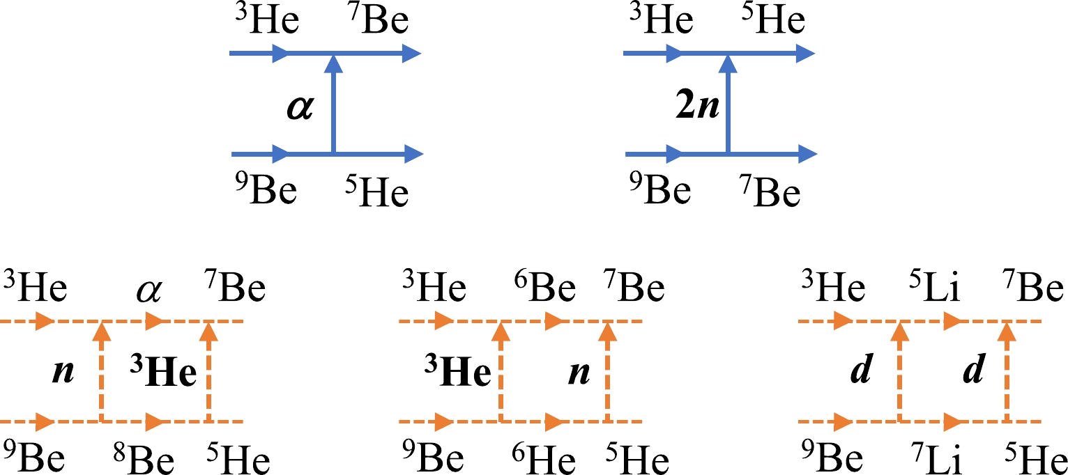 In this study, reaction 9Be (3He, 7Be) 5He is supposed to have both one-step and two-step transfer mechanisms, which are demonstrated schematically in Fig. 4. The one-step mechanism occurs by transferring α-particles, while the two-step mechanisms may have n- 3He, 3He -n, d-d. Moreover, we find that the transfer of $ 2n $ cluster is also possible at the backward angles of scattering. Therefore, the CRC calculation covers all mentioned transfer mechanisms, and the resulting differential cross section for the reaction 9Be (3He, 7Be) 5He is represented as  Figure 4. (color online) Reaction schemes for transfer mechanisms in 9Be (3He, 7Be) 5He : one-step (solid) and two-step (dashed) mechanisms. $ \frac{{\rm{d}} \sigma\left( \theta \right)}{{\rm{d}} \Omega} = \frac{1}{(2J_a+1)(2J_A+1)} \; \vert f_{\rm I}\left( \theta \right)+ f_{\rm II}\left( \theta \right) \vert^2, $  (7) where the amplitudes of the one-step $ f_{\rm I}\left(\theta \right) $ and two-step$ f_{\rm II}\left(\theta \right) $ transfer mechanisms are as follows:$ \begin{aligned}[b] f_{\rm I}\left( \theta \right)=& f_{\alpha}\left( \theta \right)+f_{2n}\left( \theta - \pi \right), \\ f_{\rm II}\left( \theta \right)=& f_{n{\rm-^3He}}\left( \theta \right)+ f_{{\rm^3He-}n}\left( \theta \right)+ f_{d{\rm-}d}\left( \theta \right). \end{aligned} $  (8) The optical potential mOP is selected as the potential for the entrance channel. For the exit channels, we utilized an optical potential with the global optical parameters from Ref. [23]. The optical potential of the intermediate channel α + 8Be has been preferred to a potential, which reproduces the experimental cross sections of 9Be (3He, α) 8Be in the exit channel. The bound state wave functions have been built on the Woods-Saxon shaped potential, with the depths fitted on the binding energies. However, the resonance states were considerd as the quasi-bound states, i.e. taken by means of the same procedure, but with the binding energy of 0.01 MeV. Spectroscopic amplitudes were considered from Refs. [12, 13, 24] and presented in Table 2. A C ν $ nlj $   SA A C ν $ nlj $   SA $ ^6 $ Li  1 $ ^3 $ He  0.5 t 0.5 2 $ S_{0.5} $   $ -0.943 $   $ ^9 $ Be  1.5 $ ^5 $ He  1.5 α 0 2 $ D_{2 } $   $ -0.530 $   $ ^6 $ Li  3 $ ^3 $ He  0.5 t 0.5 1 $ D_{2.5} $   $ -0.943 $   $ ^7 $ Be  1.5 $ ^6 $ Li  $ 1_1 $   p 0.5 1 $ P_{0.5} $   $ -0.657 $   $ ^6 $ Li  1 $ ^3 $ He  0.5 t 0.5 1 $ D_{1.5} $   $ 0.943 $   $ ^7 $ Be  1.5 $ ^6 $ Li  3 p 0.5 1 $ P_{1.5} $   $ 0.738 $   $ ^9 $ Be  1.5 $ ^6 $ Li  $ 1_1 $   t 0.5 2 $ P_{0.5} $   $ -0.192 $   $ ^7 $ Be  1.5 $ ^6 $ Li  $ 1_2 $   p 0.5 1 $ P_{0.5} $   $ 0.147 $   $ ^9 $ Be  1.5 $ ^6 $ Li  $ 1_1 $   t 0.5 2 $ P_{1.5} $   $ -0.215 $   $ ^7 $ Be  1.5 $ ^6 $ Li  $ 1_2 $   p 0.5 1 $ P_{1.5} $   $ -0.132 $   $ ^9 $ Be  1.5 $ ^6 $ Li  3 t 0.5 2 $ P_{1.5} $   $ -0.594 $   $ ^7 $ Be  1.5 $ ^6 $ Li  $ 1_1 $   p 0.5 1 $ P_{1.5} $   $ -0.735 $   $ ^9 $ Be  1.5 $ ^6 $ Li  3 t 0.5 1 $ F_{3.5} $   $ -0.316 $   $ ^6 $ Li  $ 1_1 $   $ ^5 $ He  1.5 p 0.5 1 $ P_{0.5} $   $ -0.596 $   $ ^9 $ Be  1.5 $ ^6 $ Li  $ 1_2 $   t 0.5 2 $ P_{0.5} $   $ -0.118 $   $ ^6 $ Li  $ 1_1 $   $ ^5 $ He  1.5 p 0.5 1 $ P_{1.5} $   $ 0.667 $   $ ^9 $ Be  1.5 $ ^6 $ Li  $ 1_2 $   t 0.5 1 $ F_{2.5} $   $ -0.324 $   $ ^6 $ Li  3 $ ^5 $ He  1.5 p 0.5 1 $ P_{1.5} $   $ 0.500 $   $ ^4 $ He  0 $ ^3 $ He  0.5 n 0.5 1 $ S_{0.5} $   $ -0.741 $   $ ^6 $ Li  $ 1_2 $   $ ^5 $ He  1.5 p 0.5 1 $ P_{0.5} $   $ 0.333 $   $ ^9 $ Be  1.5 $ ^8 $ Be  0 n 0.5 1 $ P_{1.5} $   $ 0.791 $   $ ^6 $ Li  $ 1_2 $   $ ^5 $ He  1.5 p 0.5 1 $ P_{1.5} $   $ 0.298 $   $ ^9 $ Be  2.5 $ ^8 $ Be  0 n 0.5 1 $ P_{1.5} $   $ -0.816 $   $ ^5 $ Li  1.5 $ ^3 $ He  0.5 d 1 1 $ P_{1 } $   $ 0.456 $   $ ^9 $ Be  2.5 $ ^8 $ Be  2 n 0.5 1 $ P_{1.5} $   $ -0.986 $   $ ^5 $ Li  1.5 $ ^3 $ He  0.5 d 1 1 $ P_{2 } $   $ 1.021 $   $ ^9 $ Be  2.5 $ ^8 $ Be  0 n 0.5 1 $ P_{0.5} $   $ 0.242 $   $ ^9 $ Be  1.5 $ ^7 $ Li  1.5 d 1 2 $ S_{1 } $   $ -0.226 $   $ ^9 $ Be  2.5 $ ^8 $ Be  2 n 0.5 1 $ P_{0.5} $   $ 0.417 $   $ ^9 $ Be  1.5 $ ^7 $ Li  1.5 d 1 1 $ D_{1 } $   $ 0.111 $   $ ^6 $ Li  1.0 $ ^4 $ He  0 d 1.0 2 $ S_{1 } $   $ 1.061 $   $ ^9 $ Be  1.5 $ ^7 $ Li  1.5 d 1 1 $ D_{3 } $   $ -0.624 $   $ ^6 $ Li  3.0 $ ^4 $ He  0 d 1.0 1 $ D_{3 } $   $ 1.061 $   $ ^6 $ Li  $ 1_1 $   $ ^5 $ Li  1.5 n 0.5 1 $ P_{0.5} $   $ 0.597 $   $ ^8 $ Be  0 $ ^6 $ Li  $ 1_1 $   d 1.0 2 $ S_{1 } $   $ 1.146 $   $ ^6 $ Li  $ 1_1 $   $ ^5 $ Li  1.5 n 0.5 1 $ P_{1.5} $   $ -0.667 $   $ ^8 $ Be  0 $ ^6 $ Li  $ 1_1 $   d 1.0 1 $ D_{1 } $   $ 0.112 $   $ ^6 $ Li  3 $ ^5 $ Li  1.5 n 0.5 1 $ P_{1.5} $   $ 1.095 $   $ ^8 $ Be  0 $ ^6 $ Li  3 d 1.0 2 $ S_{1 } $   $ 0.089 $   $ ^6 $ Li  $ 1_2 $   $ ^5 $ Li  1.5 n 0.5 1 $ P_{0.5} $   $ -0.333 $   $ ^8 $ Be  0 $ ^6 $ Li  3 d 1.0 1 $ D_{1 } $   $ 0.414 $   $ ^6 $ Li  $ 1_2 $   $ ^5 $ Li  1.5 n 0.5 1 $ P_{1.5} $   $ -0.298 $   $ ^8 $ Be  0 $ ^6 $ Li  3 d 1.0 1 $ D_{2 } $   $ -0.477 $   $ ^7 $ Li  1.5 $ ^6 $ Li  $ 1_1 $   n 0.5 1 $ P_{0.5} $   $ -0.657 $   $ ^8 $ Be  0 $ ^6 $ Li  3 d 1.0 1 $ D_{3 } $   $ 0.744 $   $ ^7 $ Li  1.5 $ ^6 $ Li  $ 1_1 $   n 0.5 1 $ P_{1.5} $   $ -0.735 $   $ ^8 $ Be  0 $ ^6 $ Li  3 d 1.0 2 $ S_{1 } $   $ 0.850 $   $ ^7 $ Li  1.5 $ ^6 $ Li  3 n 0.5 1 $ P_{1.5} $   $ 0.738 $   $ ^8 $ Be  2 $ ^6 $ Li  3 d 1.0 2 $ S_{1 } $   $ 0.747 $   $ ^7 $ Li  1.5 $ ^6 $ Li  $ 1_2 $   n 0.5 1 $ P_{0.5} $   $ 0.147 $   $ ^8 $ Be  2 $ ^6 $ Li  3 d 1.0 1 $ D_{1 } $   $ 0.079 $   $ ^7 $ Li  1.5 $ ^6 $ Li  $ 1_2 $   n 0.5 1 $ P_{1.5} $   $ -0.132 $   $ ^8 $ Be  2 $ ^6 $ Li  3 d 1.0 1 $ D_{2 } $   $ 0.259 $   $ ^6 $ He  0 $ ^5 $ He  1.5 n 0.5 1 $ P_{1.5} $   $ -0.867 $   $ ^8 $ Be  2 $ ^6 $ Li  3 d 1.0 1 $ D_{3 } $   $ 0.538 $   $ ^7 $ Be  1.5 $ ^6 $ Be  0 n 0.5 1 $ P_{1.5} $   $ -0.935 $   $ ^8 $ Be  0 $ ^6 $ Li  $ 1_2 $   d 1.0 2 $ S_{1 } $   $ -0.237 $   $ ^6 $ He  0 $ ^4 $ He  0 2n 1.0 1 $ S_{0 } $   $ 0.909 $   $ ^8 $ Be  0 $ ^6 $ Li  $ 1_2 $   d 1.0 1 $ D_{1 } $   $ 0.372 $   $ ^8 $ Be  0 $ ^6 $ Be  0 d 1.0 1 $ S_{0 } $   $ -1.