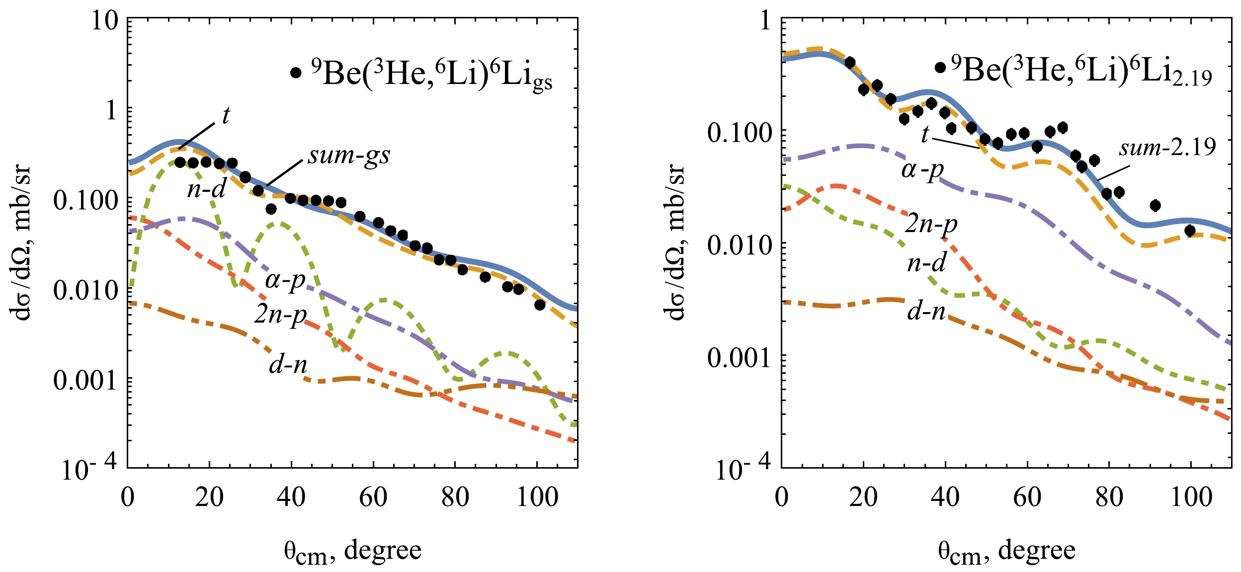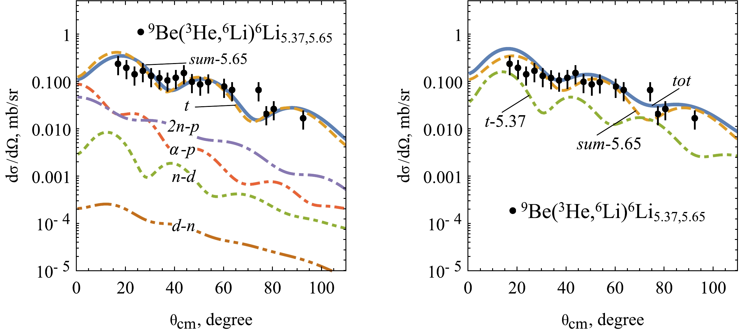 The transfer mechanisms of cluster t is suggested to exhibit two-step processes as well, as it was suggested in Ref. [13]. The direct transfer t, and two-step transfer mechanisms of cluster t (see Fig. 6): n-d, α-p, 2n-p, and d-n were included in the CRC calculations. Differential cross sections for these transfer mechanisms are obtained analogously as in Eq. (8).   Figure 6. (color online) Same as the caption of Fig. 4but for the reaction 9Be (3He, 6Li) 6Li. CRC calculations for the transfer of the cluster t utilized the WS optical potential for the entrance channel, and a WS shaped potential for the exit channel 6Li + 6Li. The potential parameters of the exit channel were determined by fitting to the experimental data on the elastic scattering of 6Li + 6Li at an energy of 40 MeV [25]. The obtained optical potential is shown in Table 1. Apart from the fact that 6Li was detected at the ground state, there were also two registered resonances. In the CRC calculations, they were considered through the coupling with the ground state of 6Li. The calculated differential cross sections for the channel 6Li + 6Li at the ground state are presented in Fig. 7 (left panel) with the contributions of each transfer mechanisms. The direct transfer of the cluster t dominates at the whole range of angles. The two-step transfer mechanism n-d is turns out to be less contributor than the transfer mechanism t in contrary to the studies by Rudchik et al. [13] within the same reaction, however, at the laboratory energy of 63 MeV. In the work the role of the transfer mechanism, n-d prevails over other processes including the direct transfer t. The cross section of the mechanism n-d has an oscillatory character, and it competes with the mechanism α-p. The latter transfer mechanisms, i.e. 2n-p and d-n, are insignificantly involved to the reaction.   Figure 7. (color online) Experimental data for nuclear reaction $ ^9 $ Be($ ^3 $ He,$ ^6 $ Li)$ ^6 $ Li$ _{gs} $ (left panel) and$ ^9 $ Be($ ^3 $ He,$ ^6 $ Li)$ ^6 $ Li$ _{2.19} $ (right panel) when compared to the calculated CRC cross sections in terms of channel contributions (please refer to the text for more details).Contribution order changes when 6Li is excited (see Fig. 7, right panel). The transfer mechanism t remains unchanged, while α-p corresponds to the next contributor. Weakening of the mechanism n-d can be interpreted as the switching value in the spectroscopic amplitudes. In particular, the amplitude for the overlap $ \langle ^6 $ Li$ _{2.19}|^8 $ Be$ \rangle $ with the configuration$ 2S_1 $ is changed to 0.089. This type of a small spectroscopic amplitude would likely result in the n-d transfer mechanism being significantly less prevalent than the d-n mechanism. However, the spectroscopic amplitudes with$ 1D_{1,2,3} $ have non-negligible values, 0.414,$ - $ 0.477, and 0.744, that do not allow n-d to disappear in the reaction.Two resonances at 5.37 MeV and 5.65 MeV are mixed in the differential cross sections due to the experimental limitations. Therefore, we have included two channels into the CRC calculations. Calculation results for 9Be (3He, 6Li) 6Li $ ^* $ with an excitation of 5.65 MeV are demonstrated in Fig. 8 (left panel) in comparing with experimental data. The reaction mainly occurs through the direct transfer of cluster t. Two transfer mechanisms, 2n-p and α-p, affect nuclear reaction only up to 30$ ^\circ $ . Other transfer mechanisms, i.e., n-d and d-n, almost do not influence the reaction.  Figure 8. (color online) Experimental data for nuclear reaction 9Be (3He, 6Li) 6Li $ _{5.37, 5.65} $ when compared to the CRC calculation results. The CRC cross section for the target-like nucleus 6Li$^* $ at 5.65 MeV with the channel contributions (left panel). Total cross section summed incoherently over 5.65 MeV and 5.37 MeV channels (right panel).Given that the transfer of cluster t has been the leading contributor in the 6Li + 6Li channel, the channel with an excitation of 5.37 MeV is calculated only with the transfer of t. The differential cross section of the channel with the 5.37 MeV excited state added incoherently with the channel at 5.65 MeV. Total cross section resulting from the CRC calculations are shown in Fig. 8 (right panel). The channel 6Li+6Li $^* $ , with the excitation of 5.37 MeV, contributes less than the channel at 5.65 MeV. The calculated differential cross sections effectively reproduce experimental data.