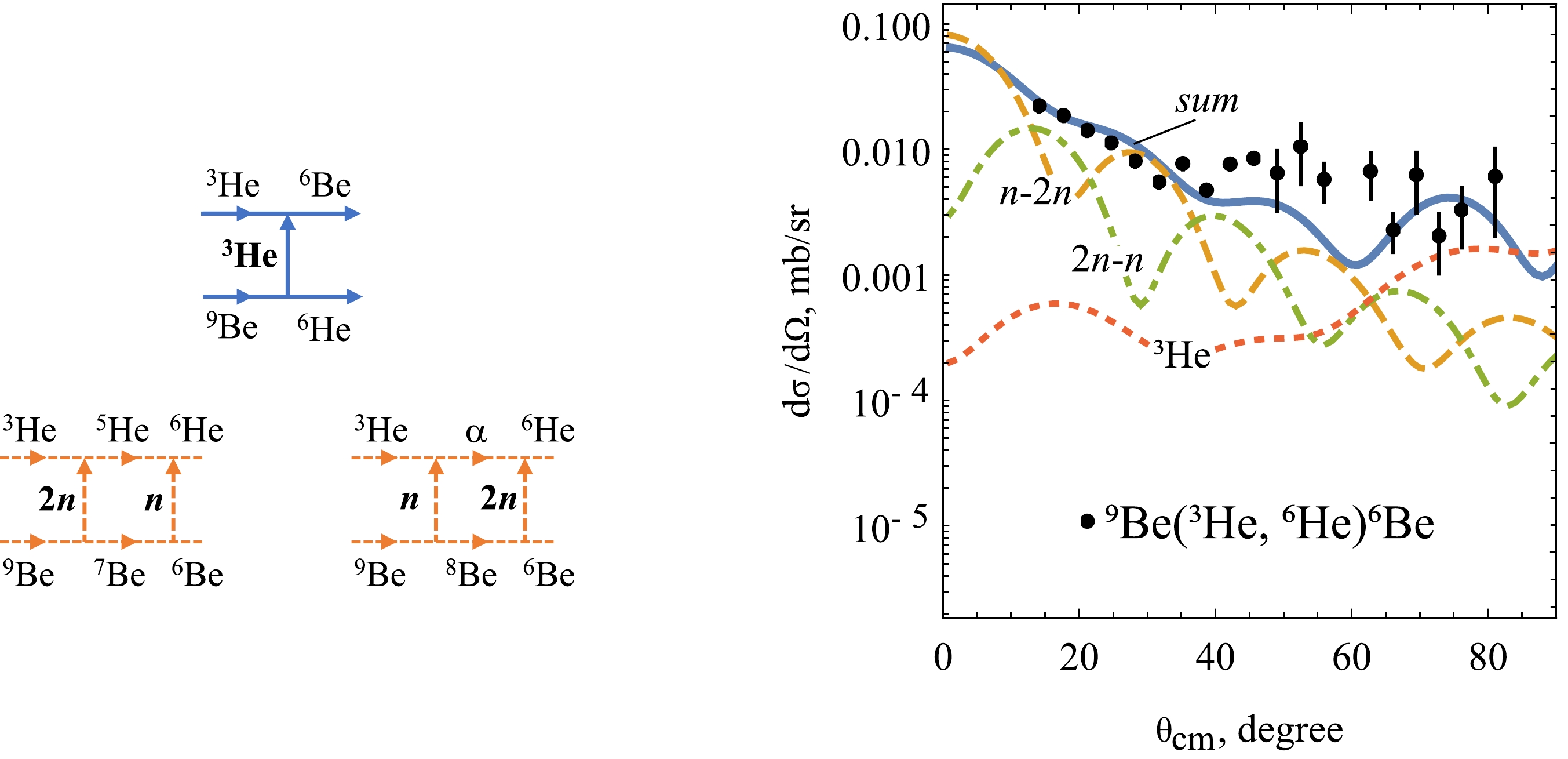 The channel 6He + 6Be is a unique channel, as the transfer of system 3n is observed at the forward angles of scattering. In his case, we suggest three mechanisms of transfer (see Fig. 9, left panel): the two-step n-2n and 2n-n, and the one-step transfer of the cluster 3He at the back hemisphere. Differential cross sections are obtained as well as they are expressed in Eq. (8). The results of the CRC calculations, detailing cross sections in terms of contributions from each of the three followed mechanisms, are illustrated in Fig. 9 (right panel).   Figure 9. (color online) Left panel: reaction schemes for one-(solid) and two-step (dashed) transfer mechanisms for 9Be (3He, 6He) 6Be. Right panel: comparison of the CRC differential cross sections with the experimental data for the same reaction. The two-step transfer mechanisms, i.e. n-2n and 2n-n, compete with each other to provide almost smooth cross section. Starting from 60 $ ^\circ $ , the most contribution is due to the transfer of 3He. The CRC calculations are in good agreement with the experimental data.However, CRC calculations for the channel 6He + 6Be were performed using large valued spectroscopic amplitudes. For example, the overlaps $ \langle $ 6He$ | \alpha \rangle,\; \langle $ 6Be$ | $ 8Be$ \rangle $ exhibit the amplitudes$ \sim 1.2 $ . On the contrary, previous studies [26, 27] reported the amplitude for$ \langle $ 6He$ | \alpha \rangle $ equals$ \sim 1.0 $ . This type of difference between spectroscopic amplitudes indicates that there may be other processes not included in the reaction model. It is plausible that a one-step transfer of the 3n system may occur in the 6He + 6Be channel. However, this issue is a distinct subject for investigation and cannot be precisely resolved using the model presented in this study. To obtain more accurate results, employing the four body problem approach might be beneficial.